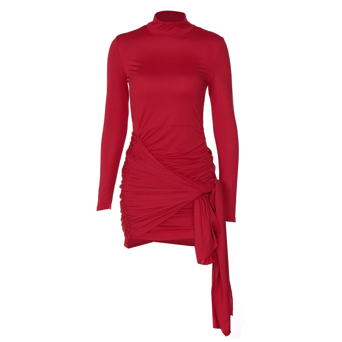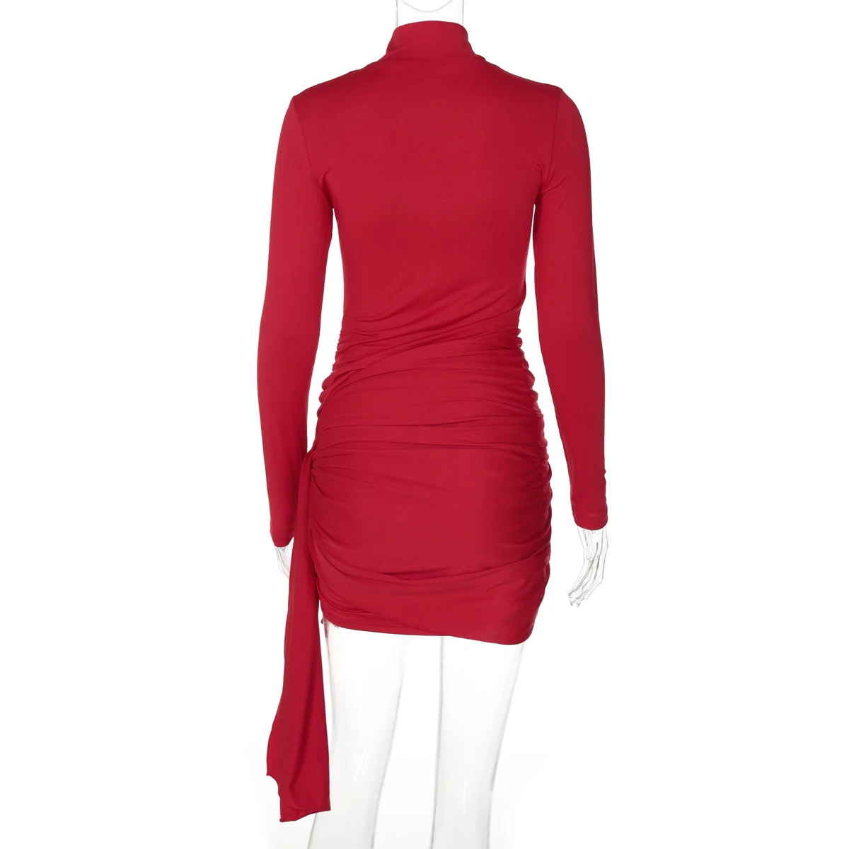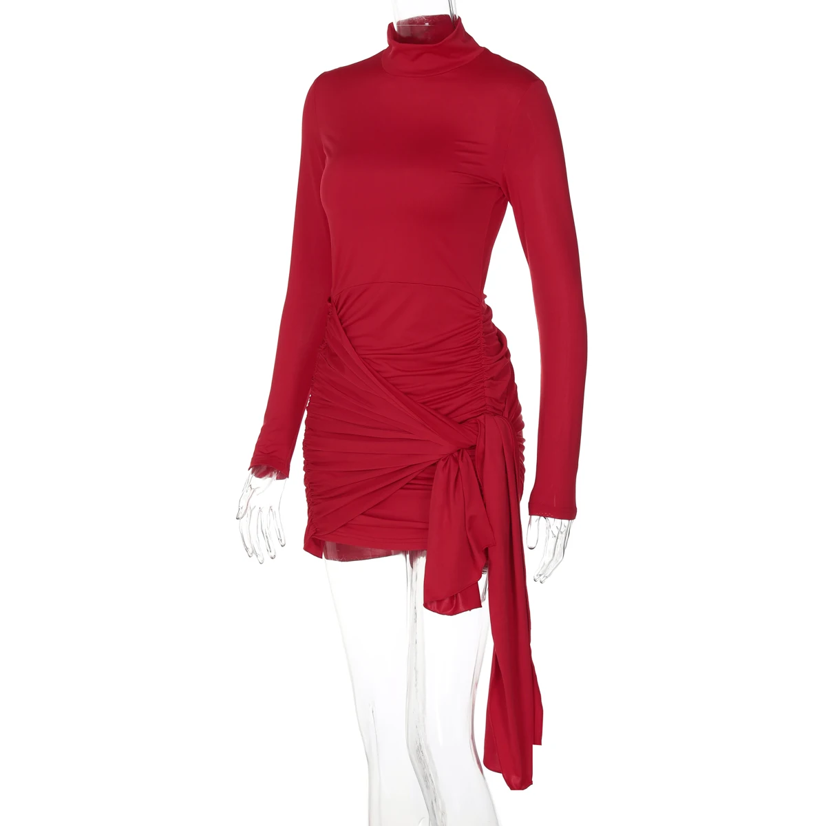 Elegant Solid Turtleneck Long Sleeve Bandage Draped Pleated Sexy Bodycon Mini Dress Fall Women Clothes Birthday Party