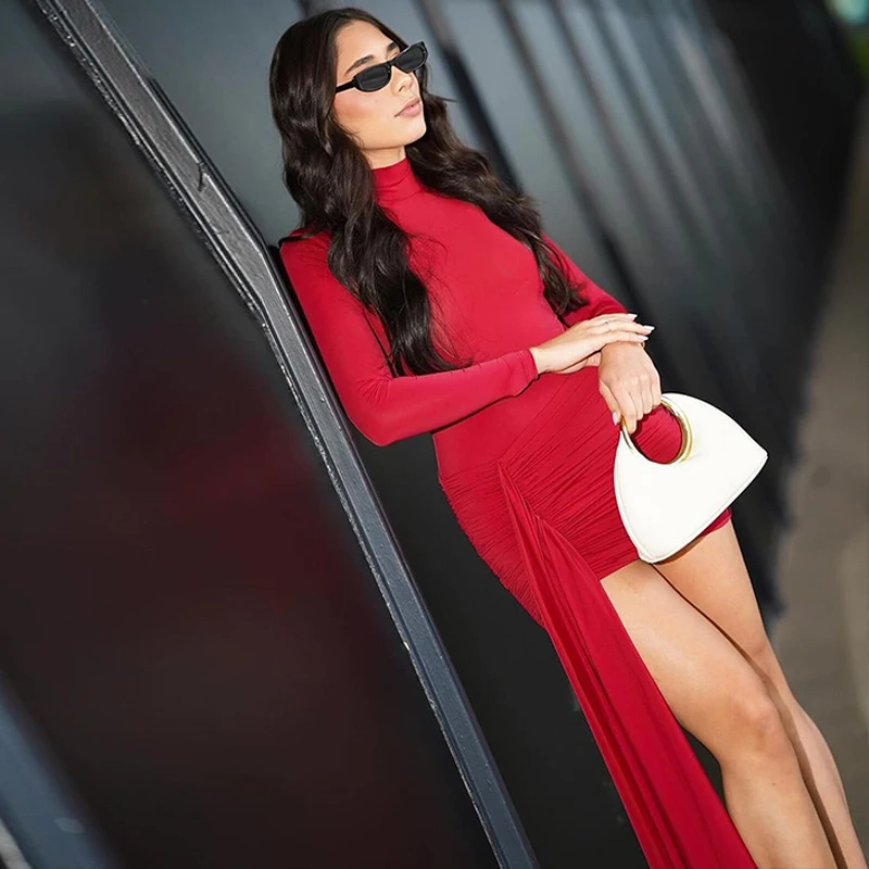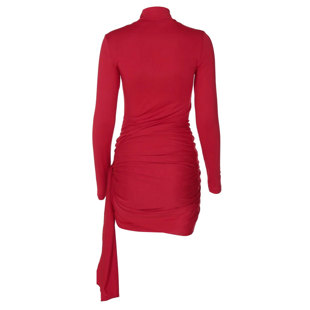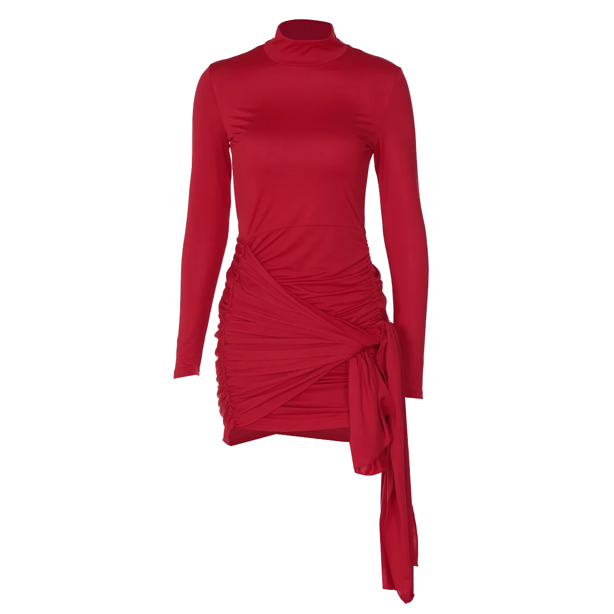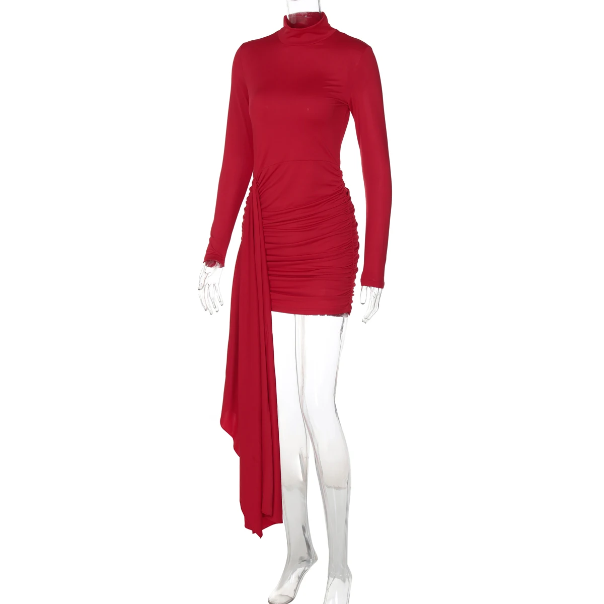 Elegant Solid Turtleneck Long Sleeve Bandage Draped Pleated Sexy Bodycon Mini Dress Fall Women Clothes Birthday Party