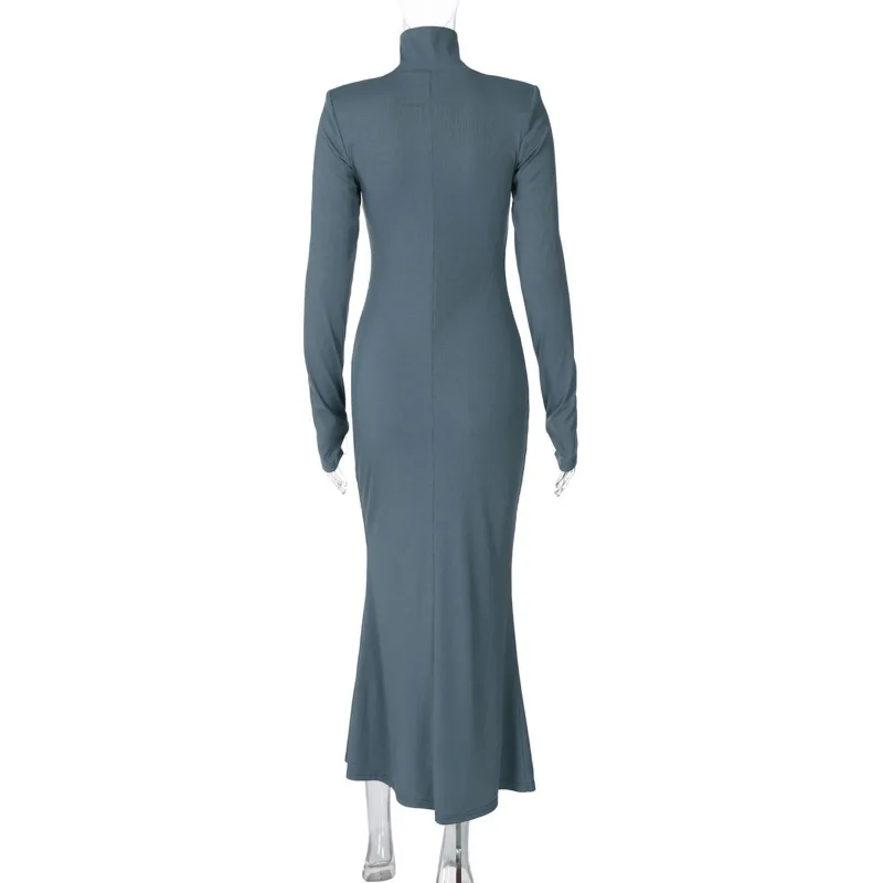 Elegant Turtleneck Long Sleeve Bodycon Long Dress For Women Autumn Winter New Ribbed Zipper Long Dress Fashion Clothes