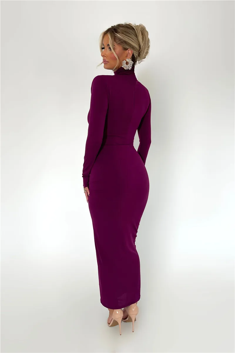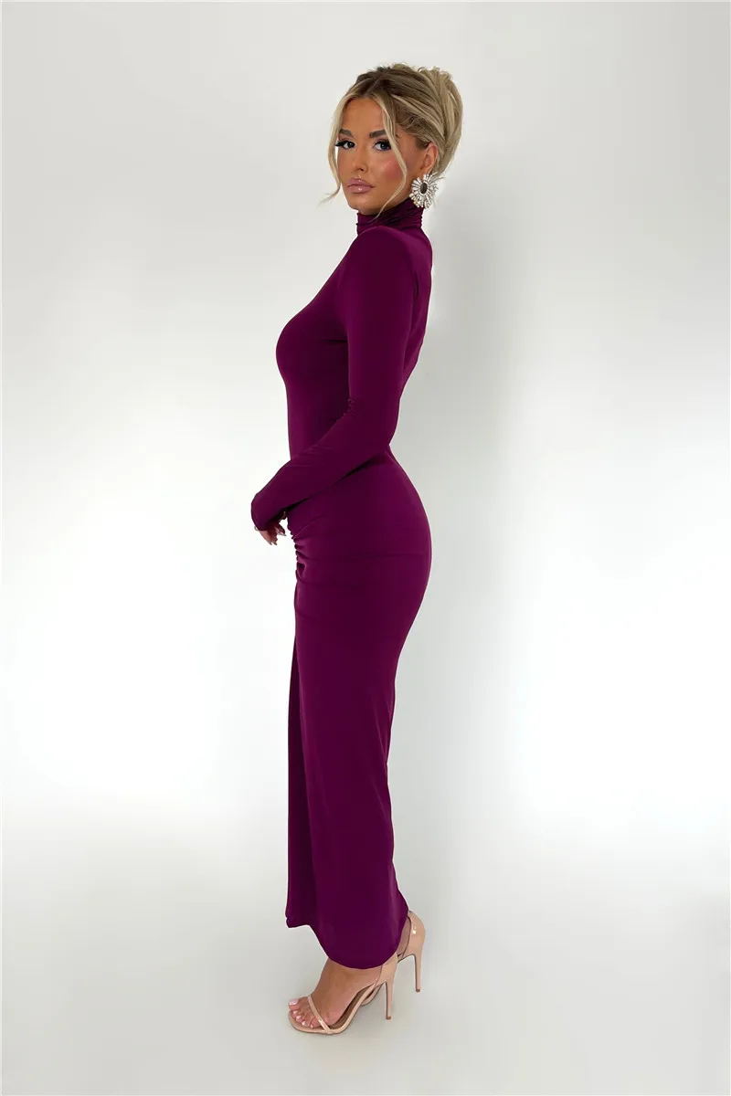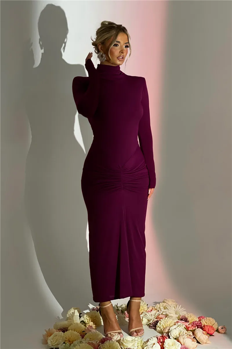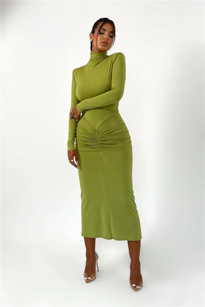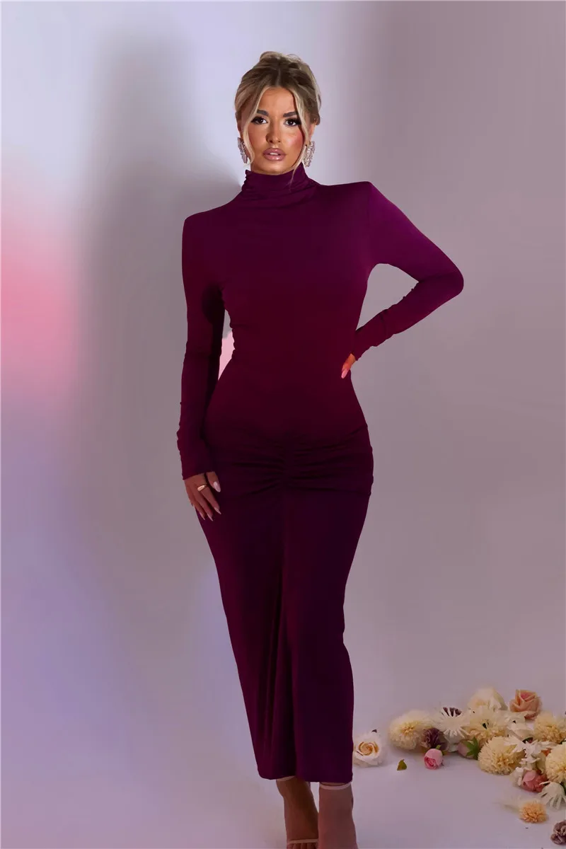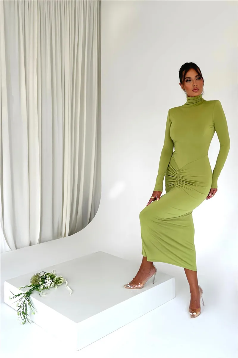 Elegant Turtleneck Long Sleeve Bodycon Maxi Dress Women Autumn Winter New Ruched Club Party Sexy Dress Vestidos