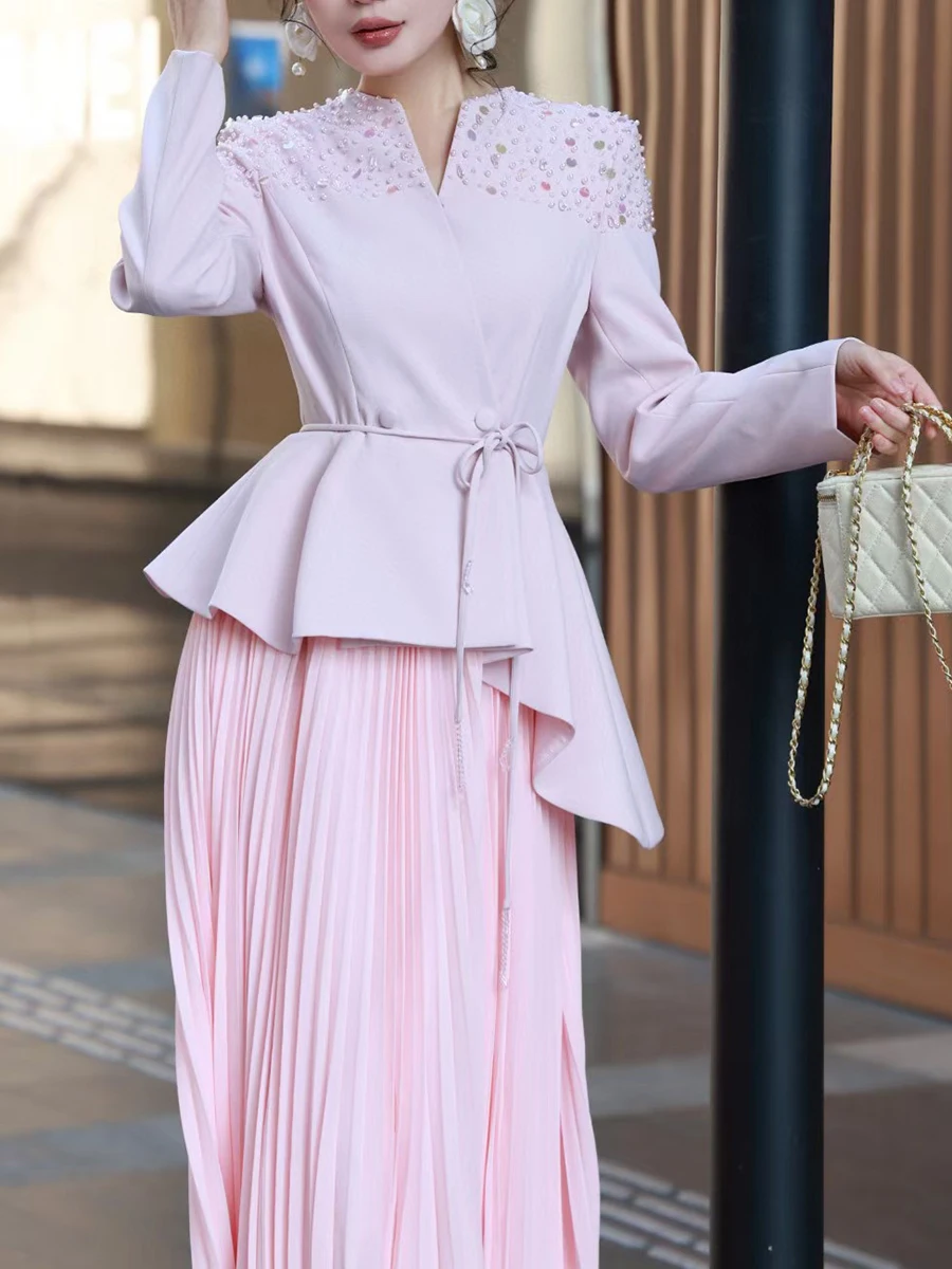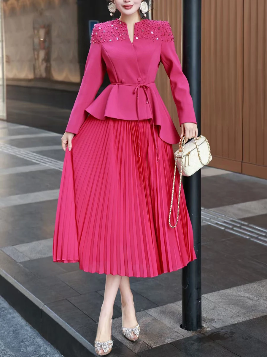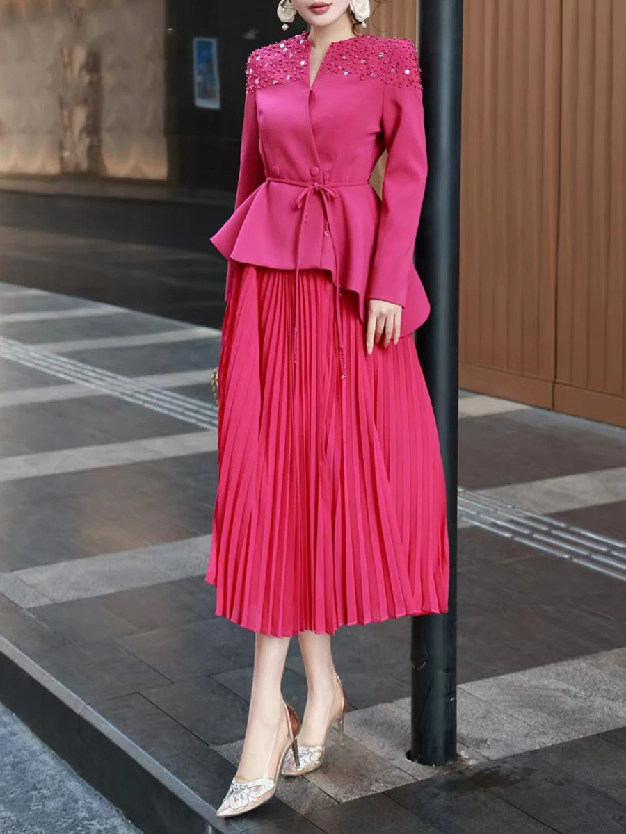 Elegant Two Piece Set For Women O Neck Long Sleeve Spliced Lace Up Top High Waist Skirts Loose Sts Female Clothes