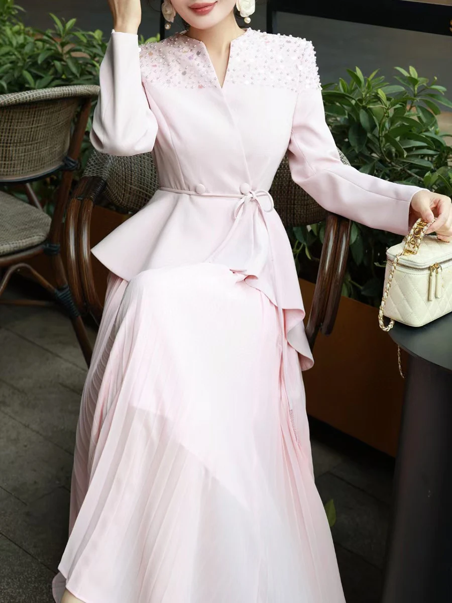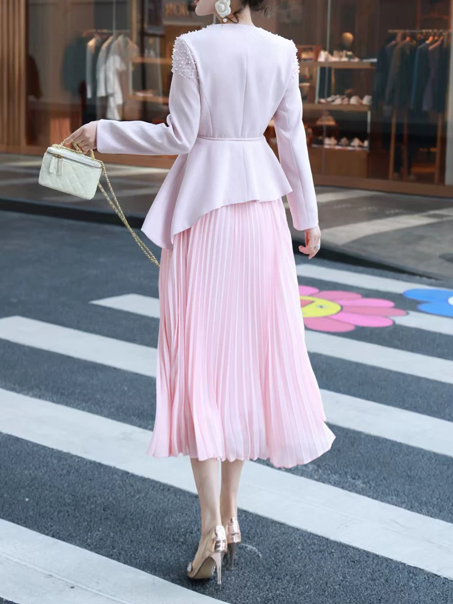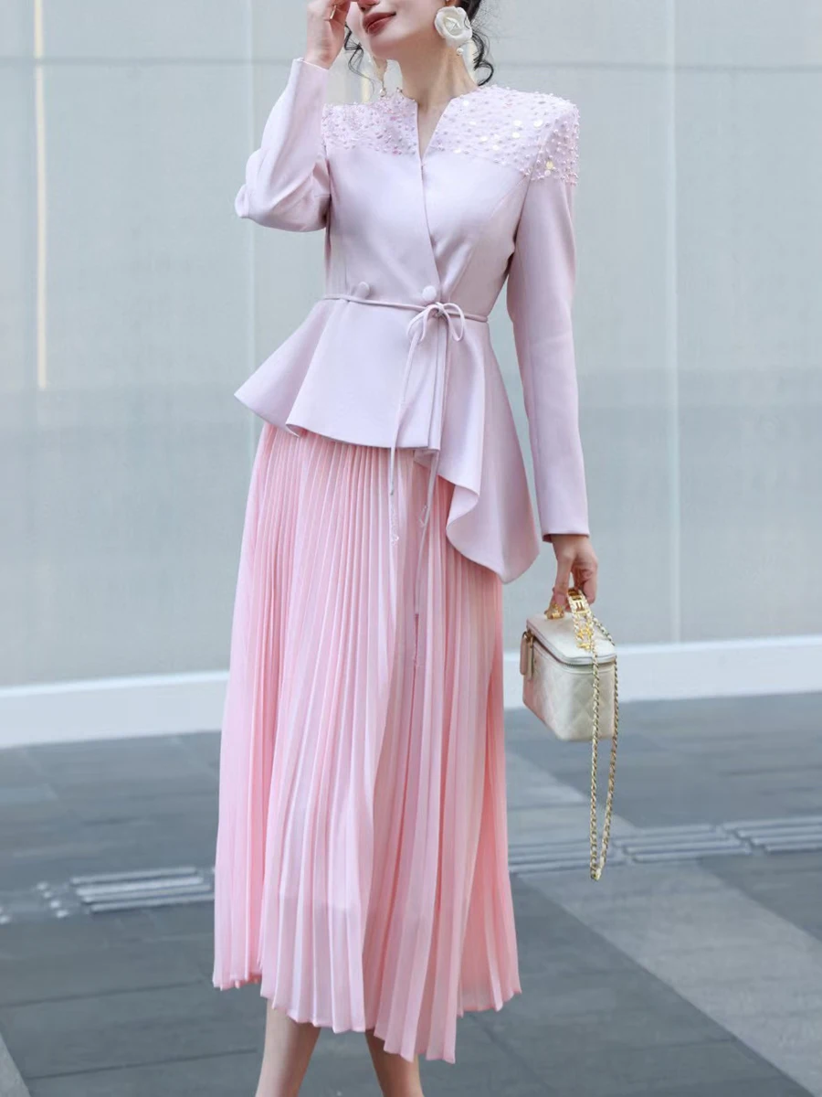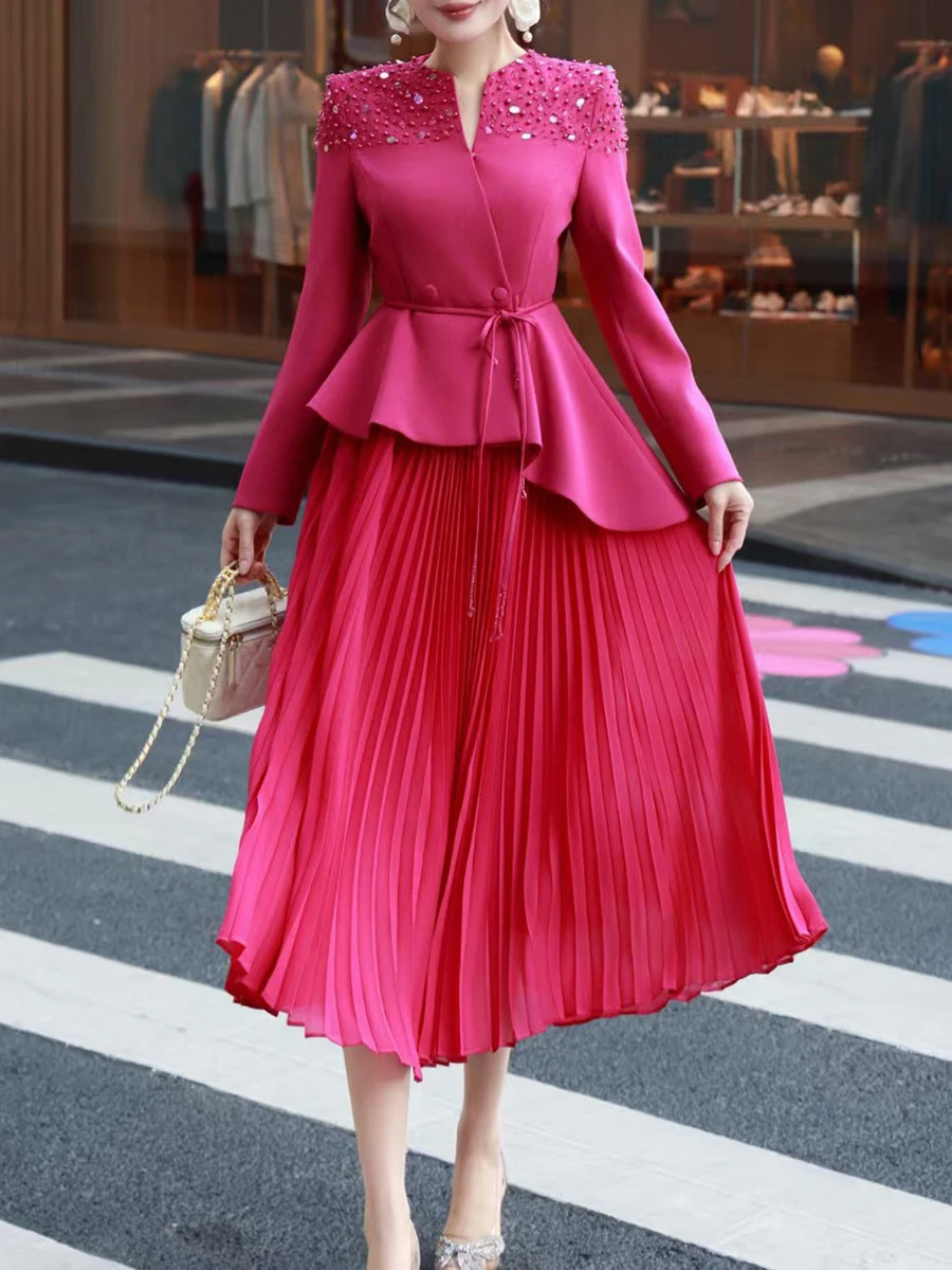 Elegant Two Piece Set For Women O Neck Long Sleeve Spliced Lace Up Top High Waist Skirts Loose Sts Female Clothes