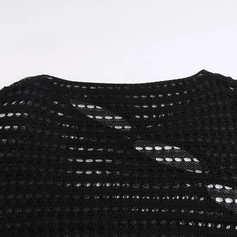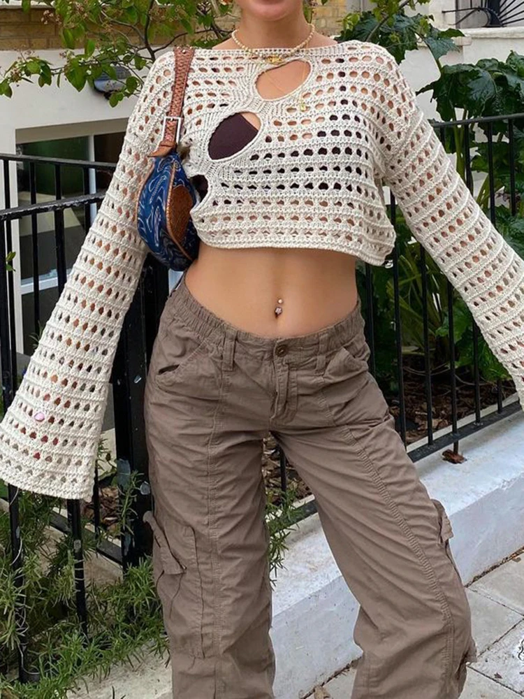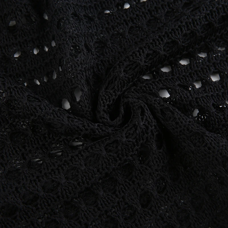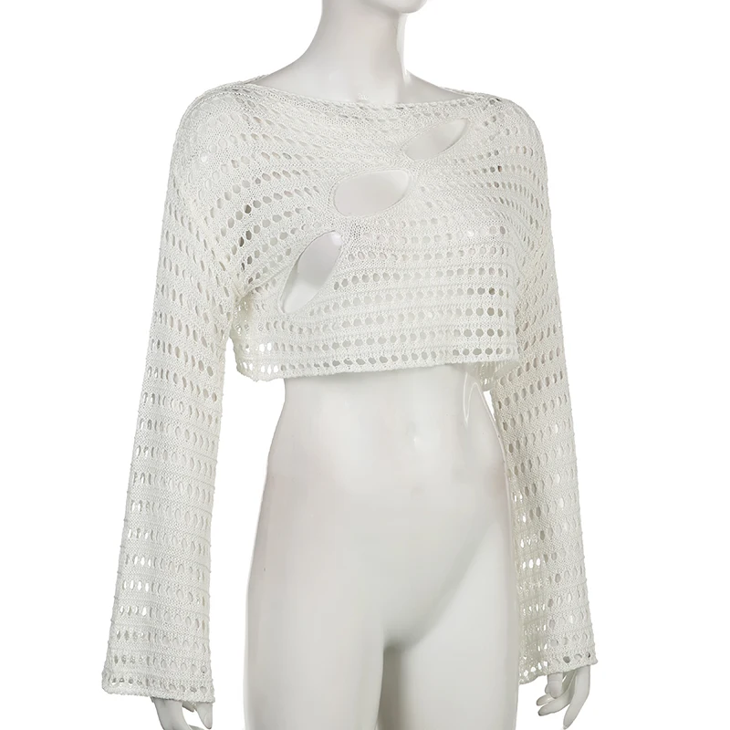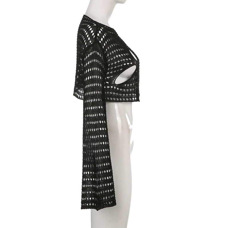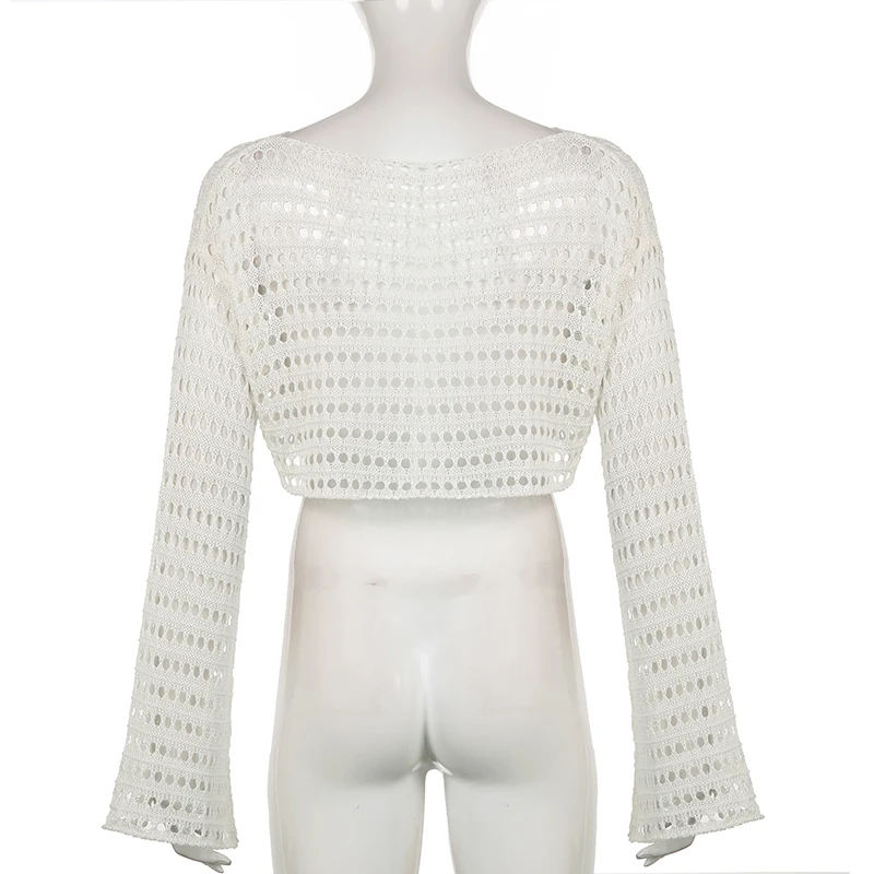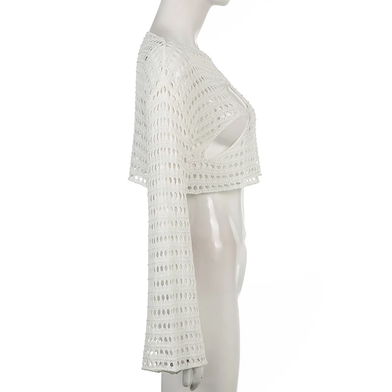 Fairycore Beach Holidays Knit Crochet Smock Summer Pullover Tops Flare Sleeve Casual T shirt Women Hollow Out Outfits