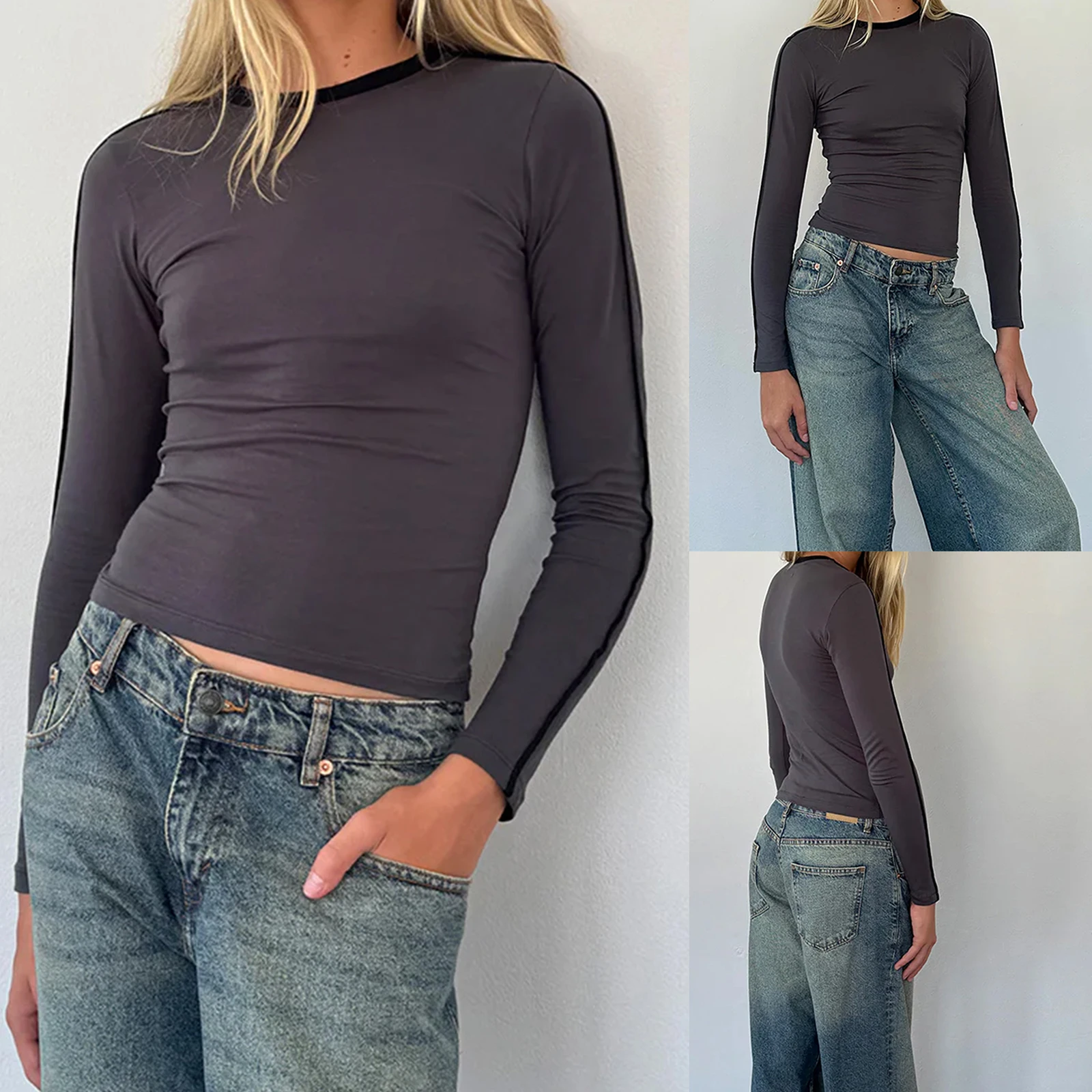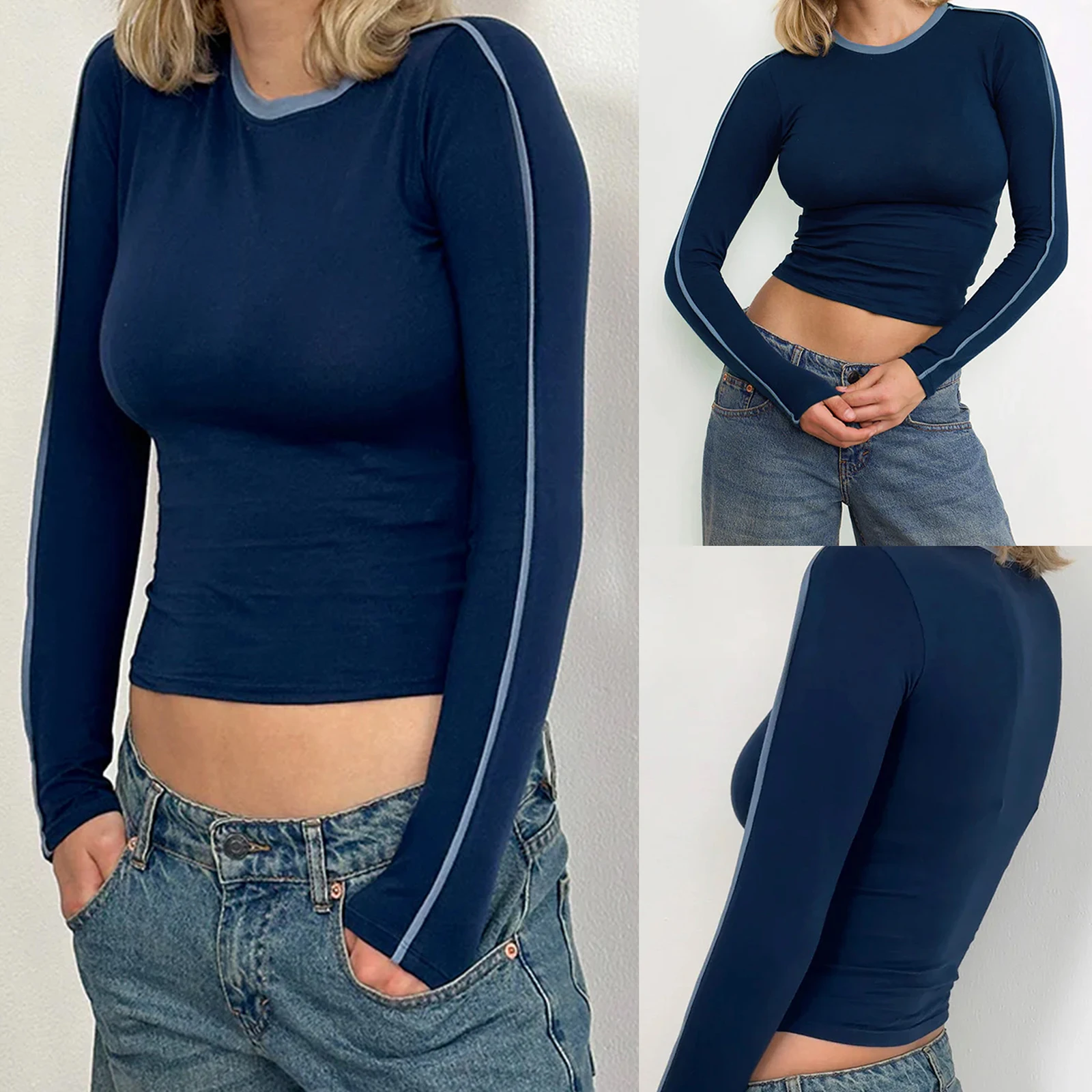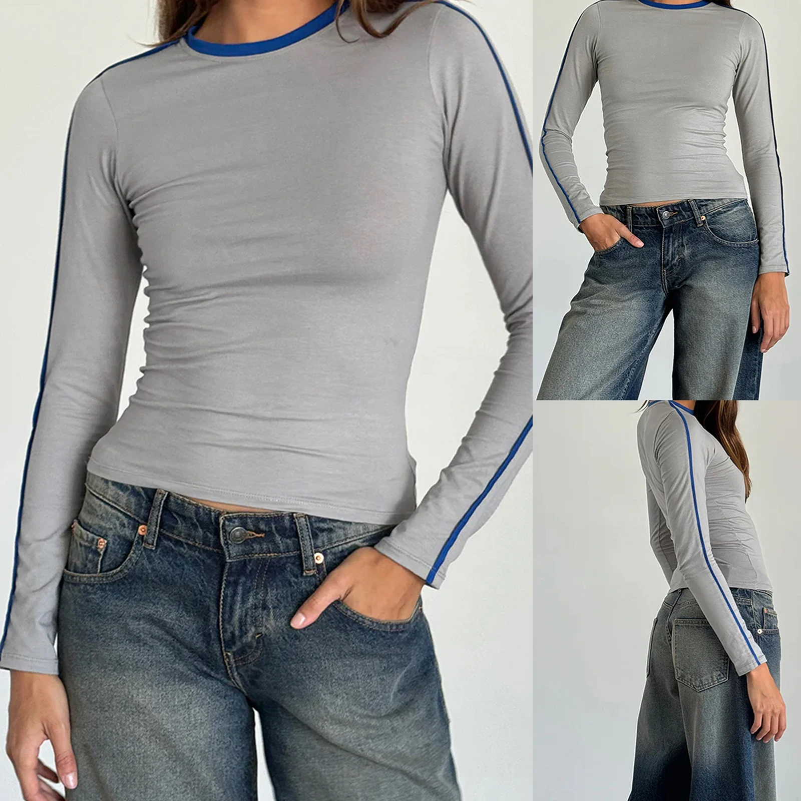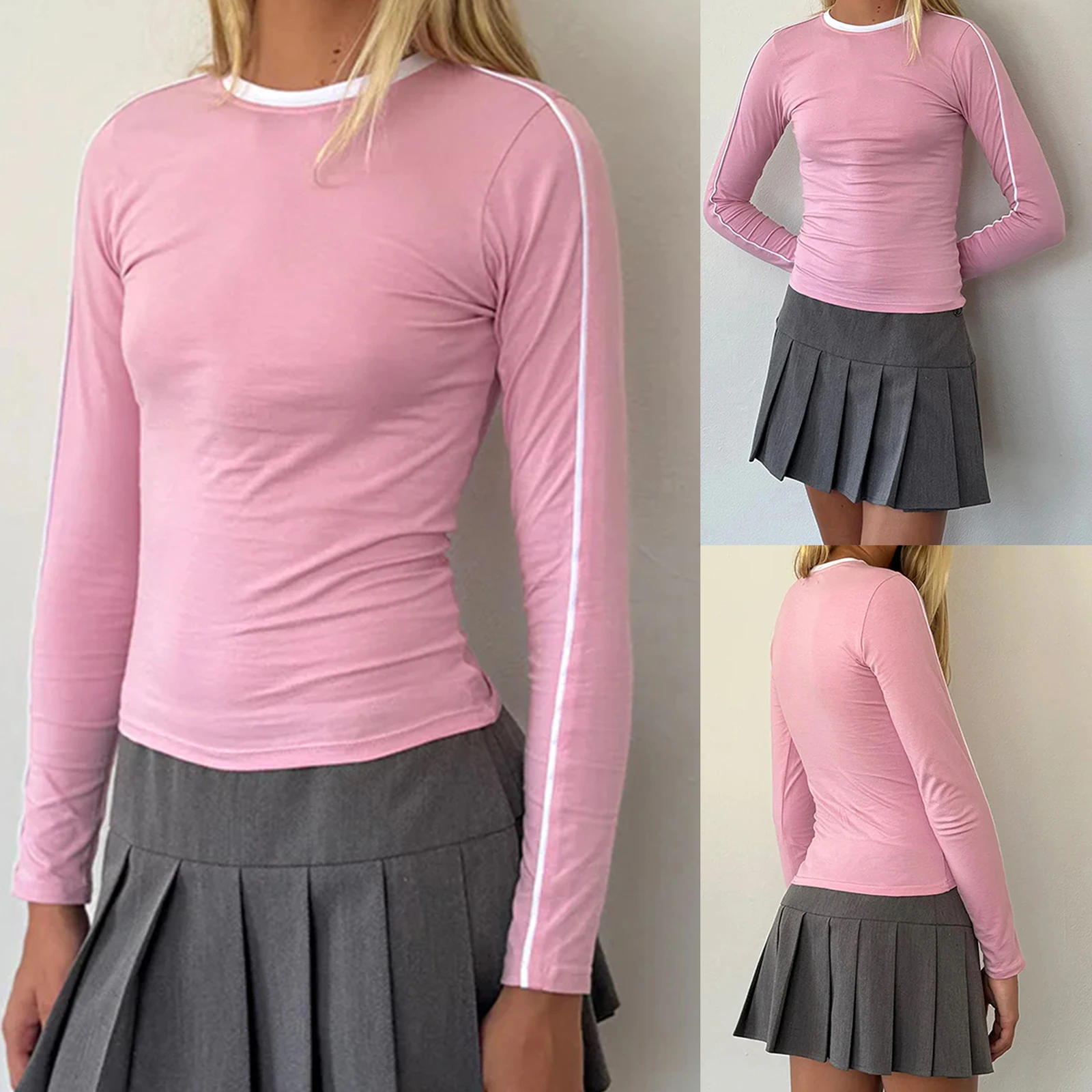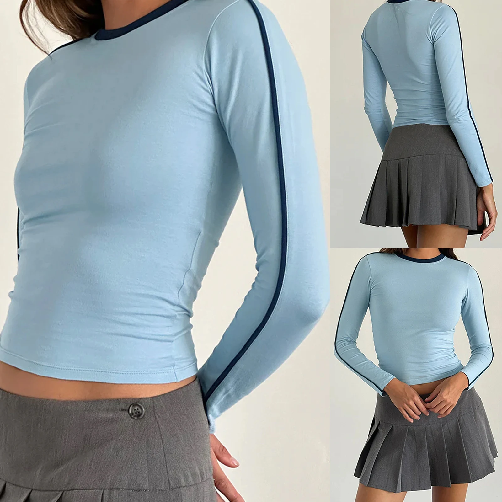 Fall Crop Tops y2k Women Aesthetic Clothing Contrast Trim Round Neck Long Sleeve T Shirts Fashion Tees Streetwear