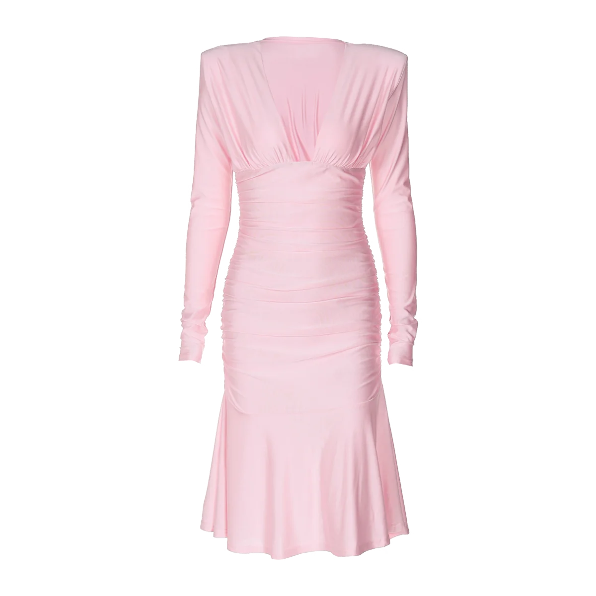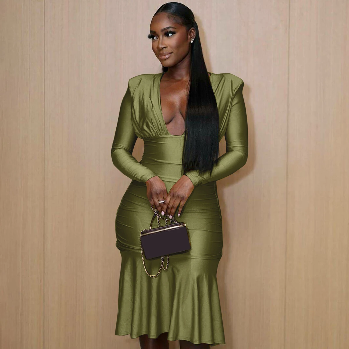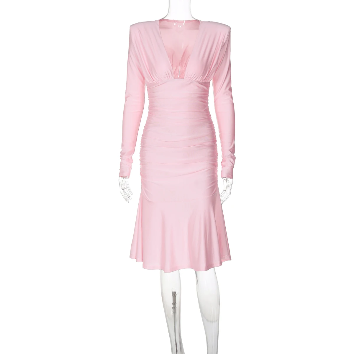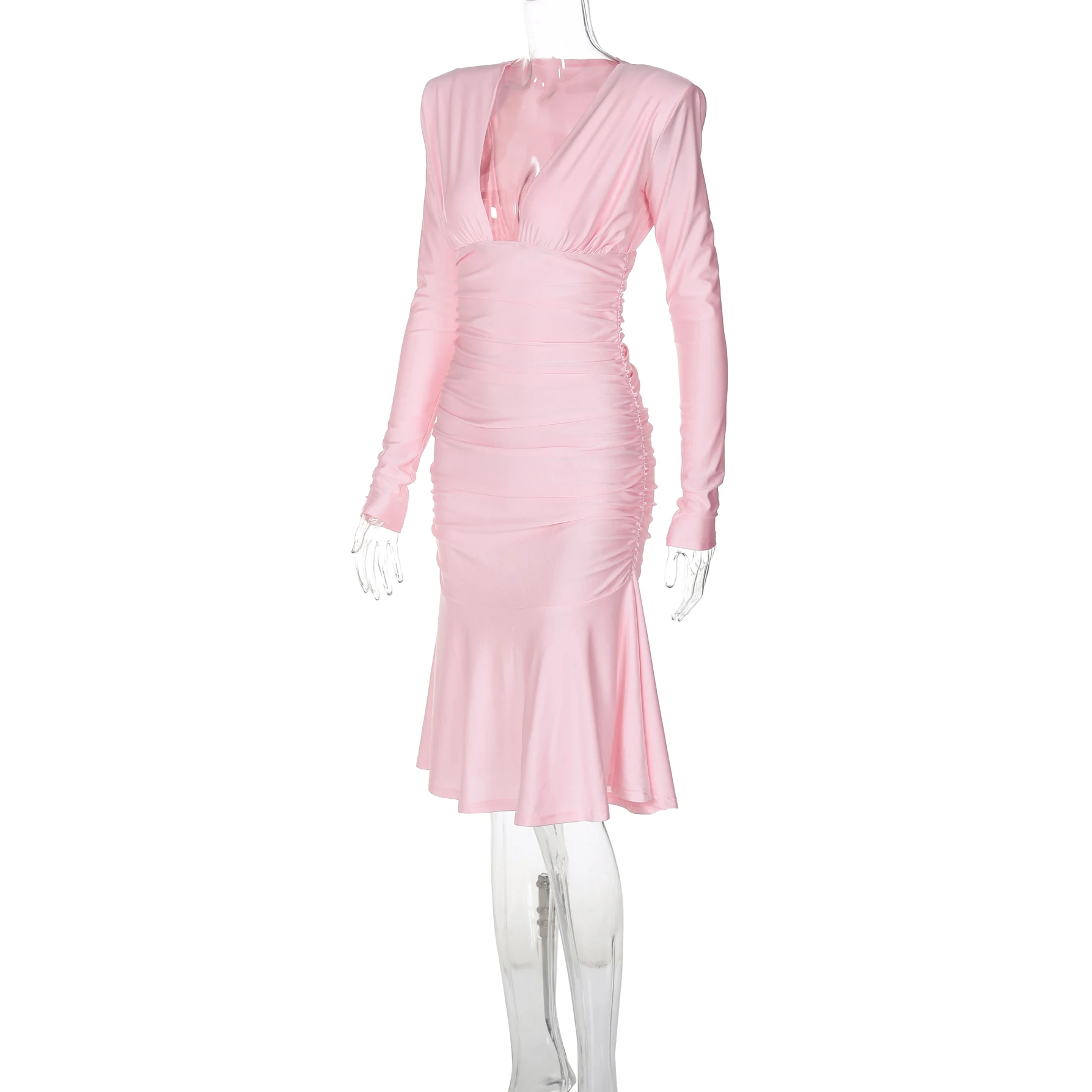 Fall Elegant Solid V Neck Long Sleeve Shoulder Pads Sexy Pleated Midi Dress Women Y2K Outfits Evening Party Festival