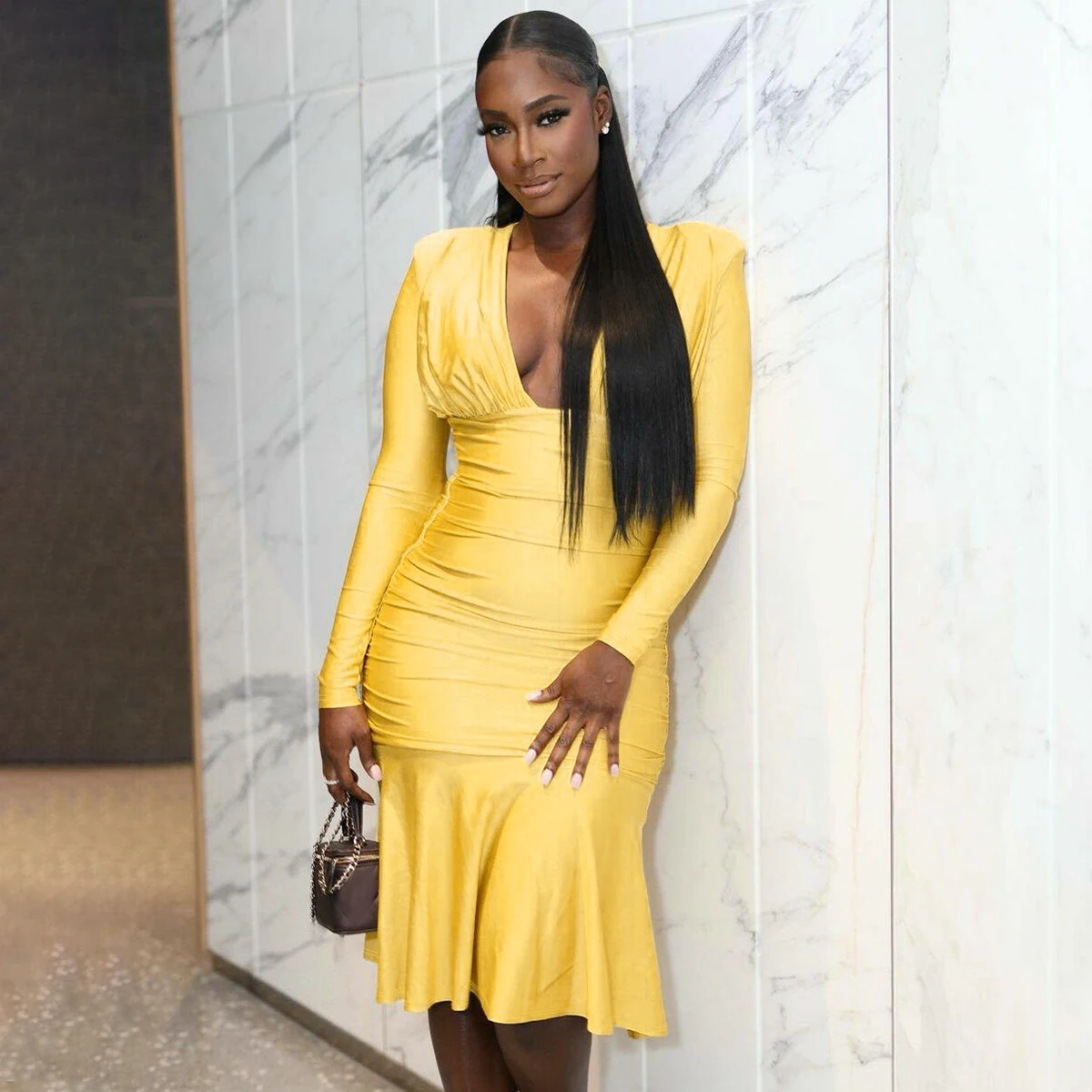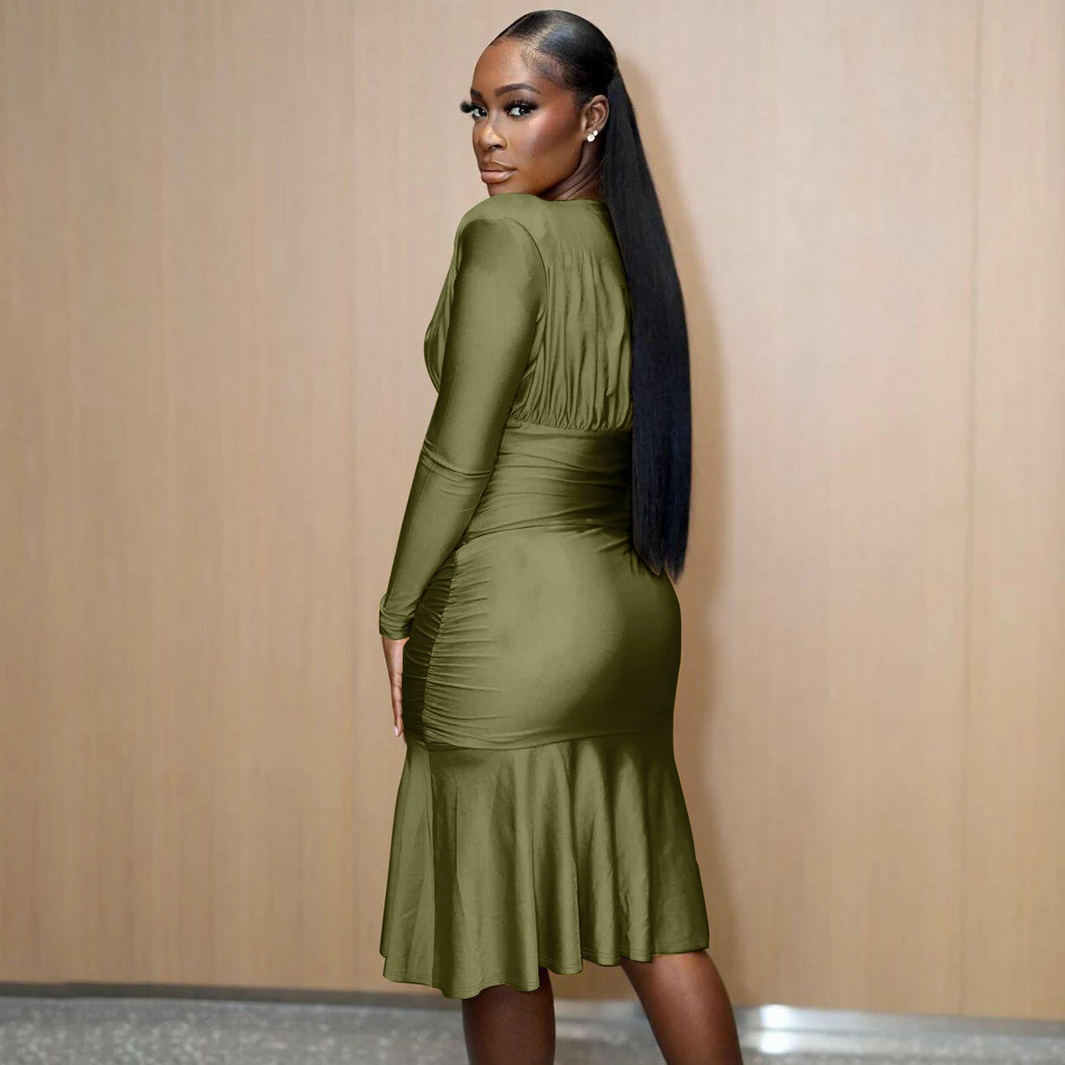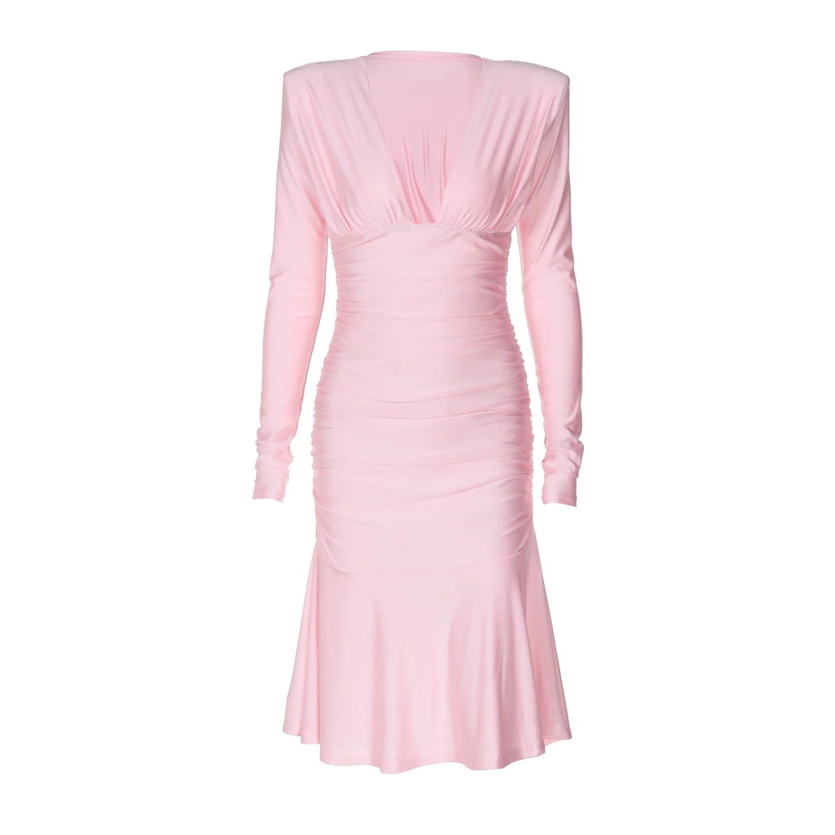 Fall Elegant Solid V Neck Long Sleeve Shoulder Pads Sexy Pleated Midi Dress Women Y2K Outfits Evening Party Festival