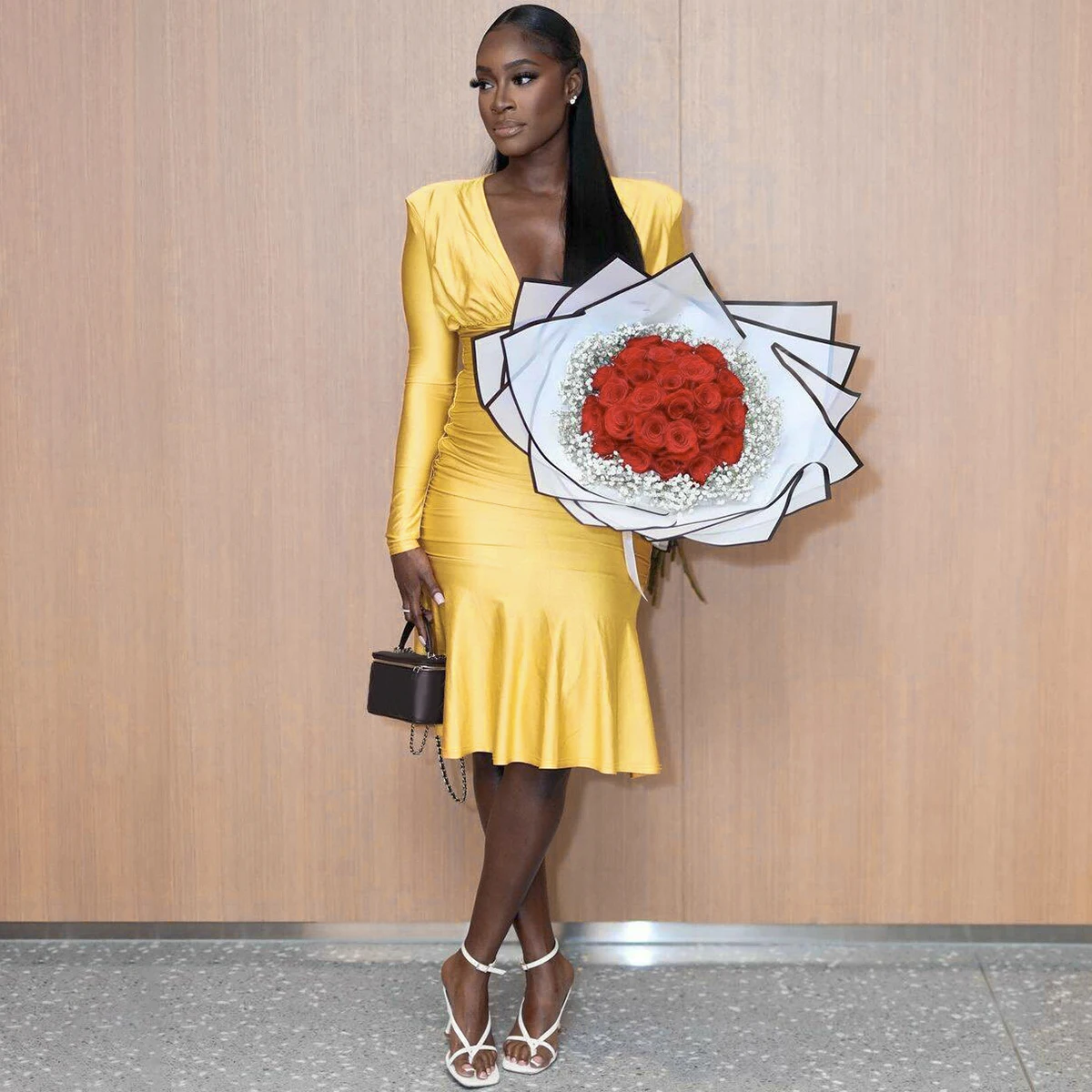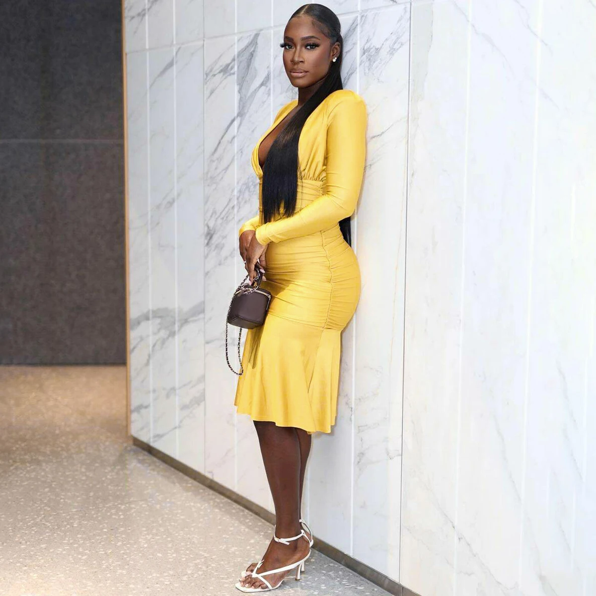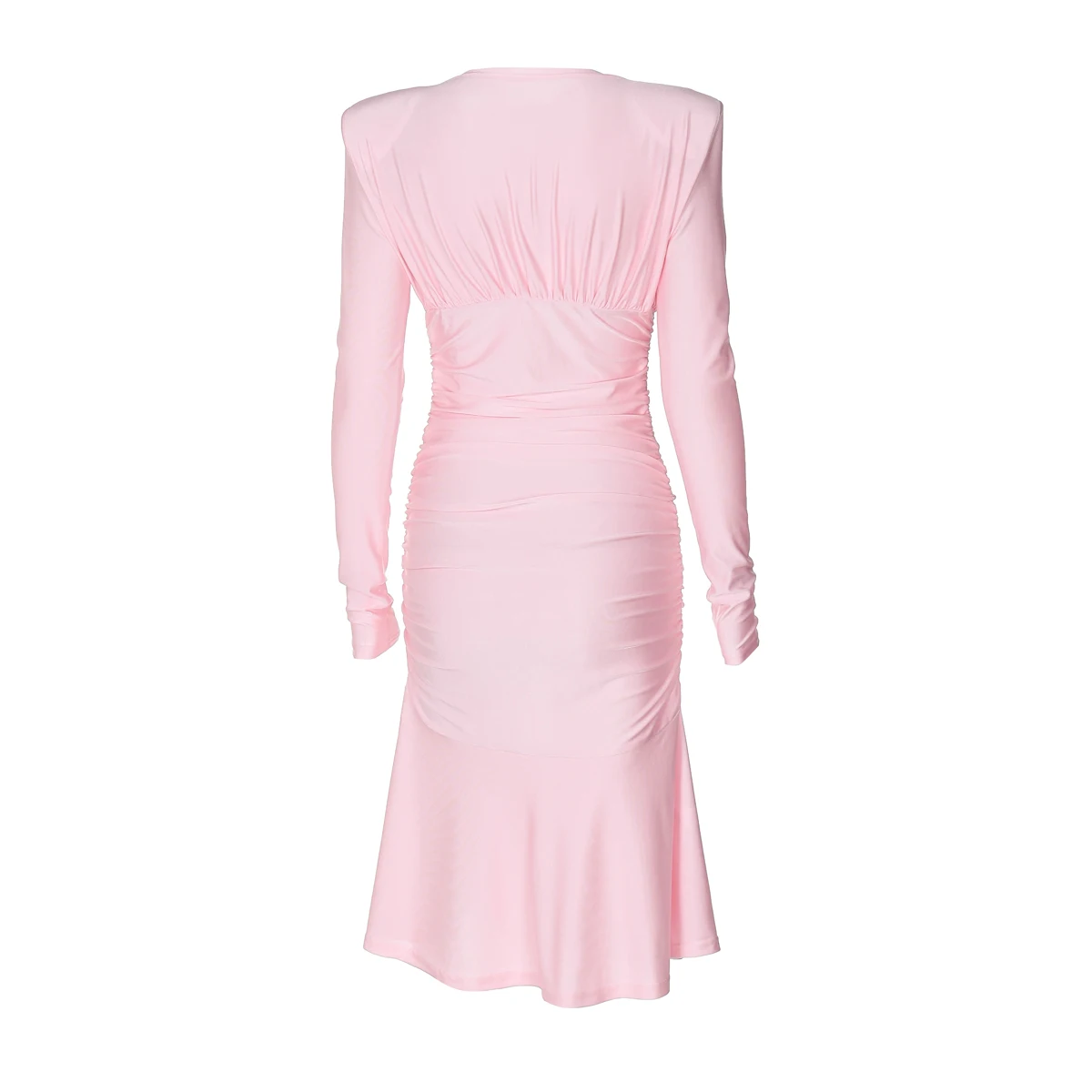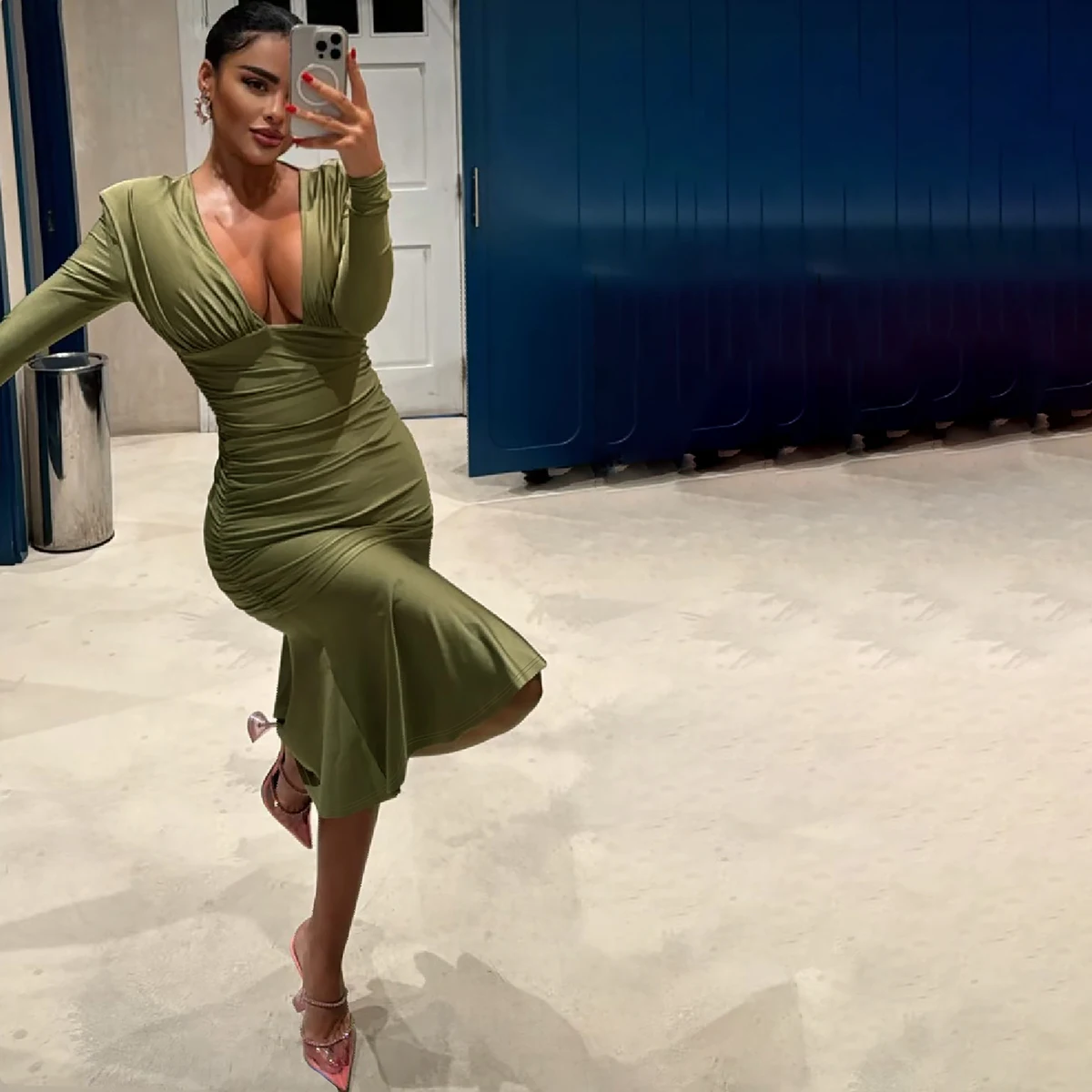 Fall Elegant Solid V Neck Long Sleeve Shoulder Pads Sexy Pleated Midi Dress Women Y2K Outfits Evening Party Festival