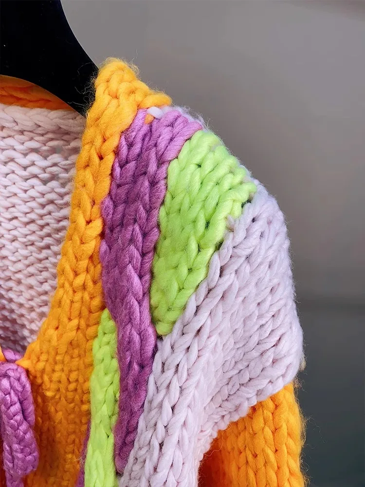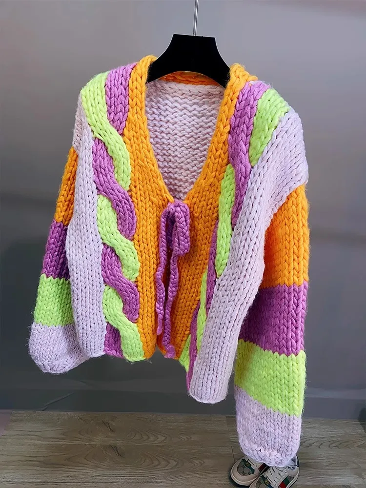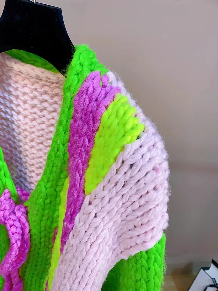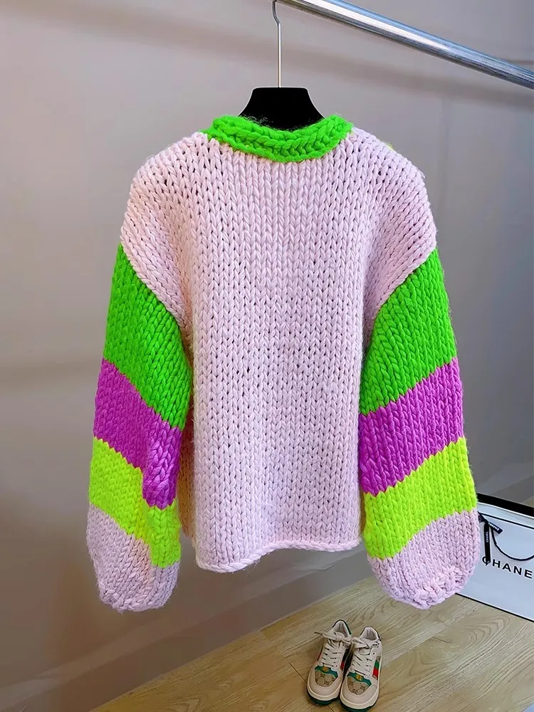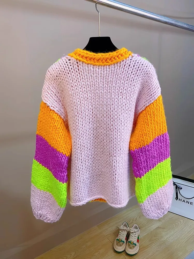 Fall Winter Coarse Wool Knit Cardigan For Women V Neck Contrast Thicken Sweaters Casual Loose Female Knitted Tops C-242