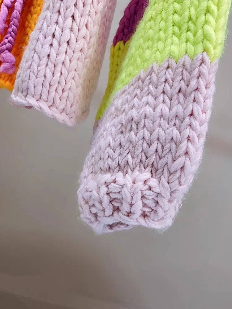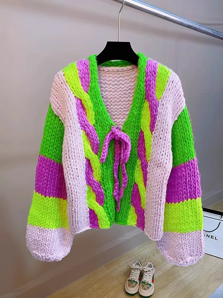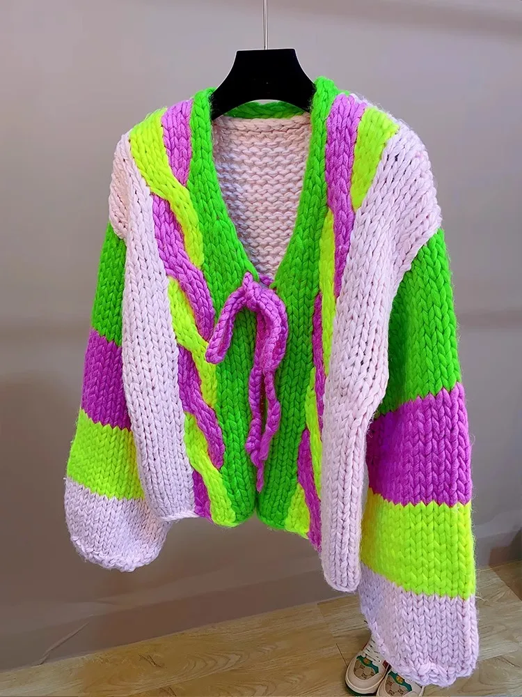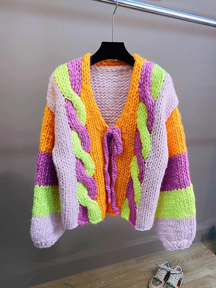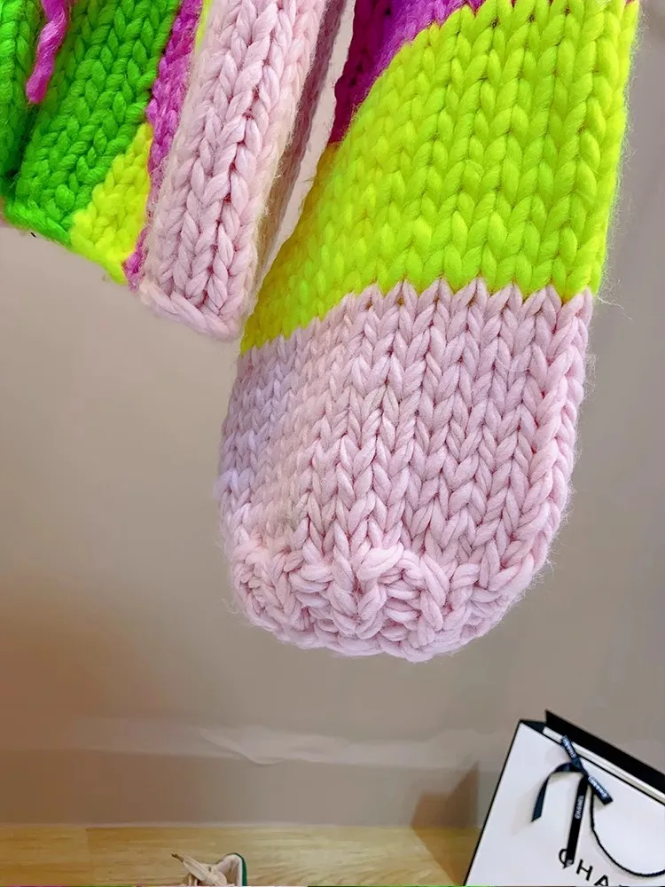 Fall Winter Coarse Wool Knit Cardigan For Women V Neck Contrast Thicken Sweaters Casual Loose Female Knitted Tops C-242
