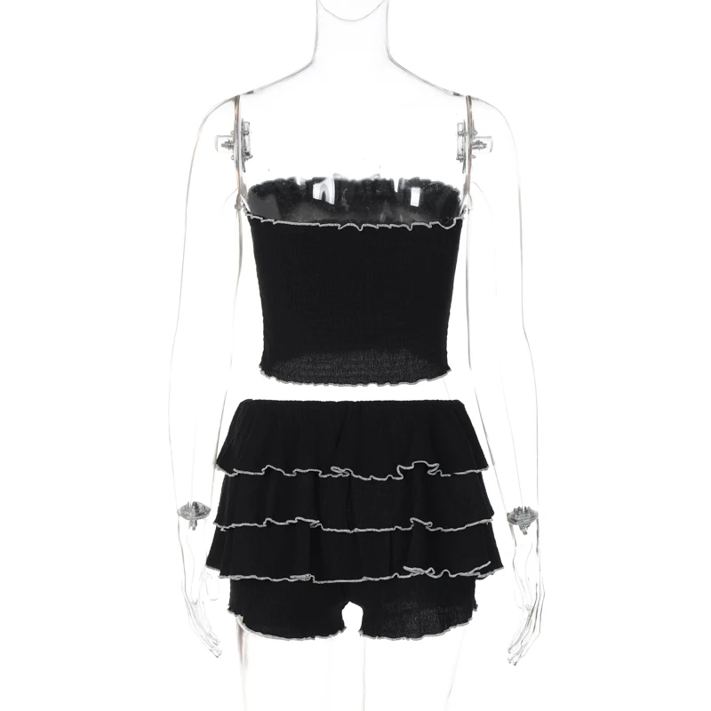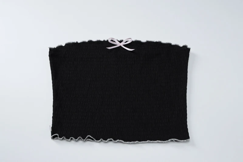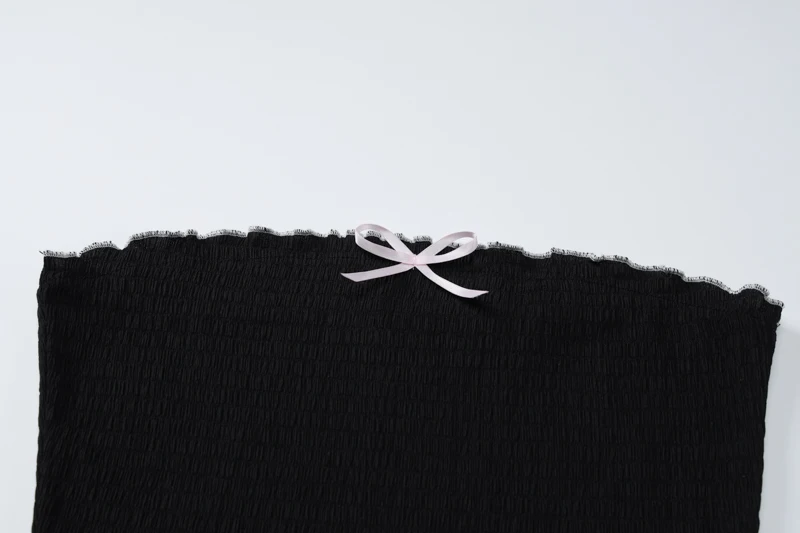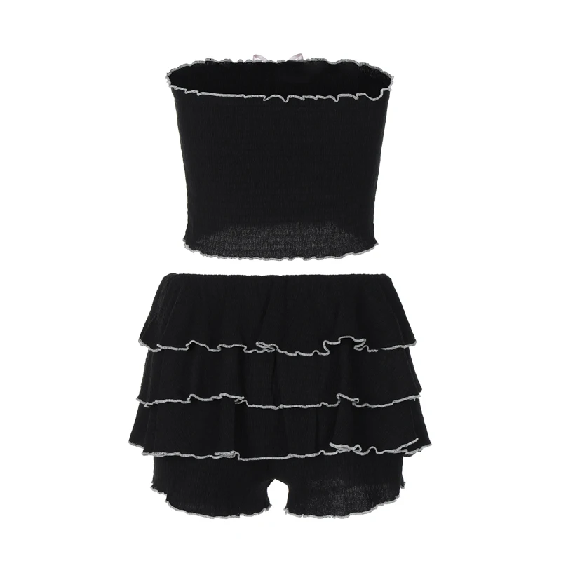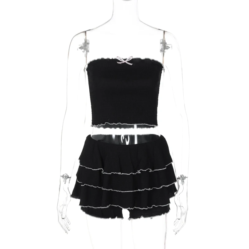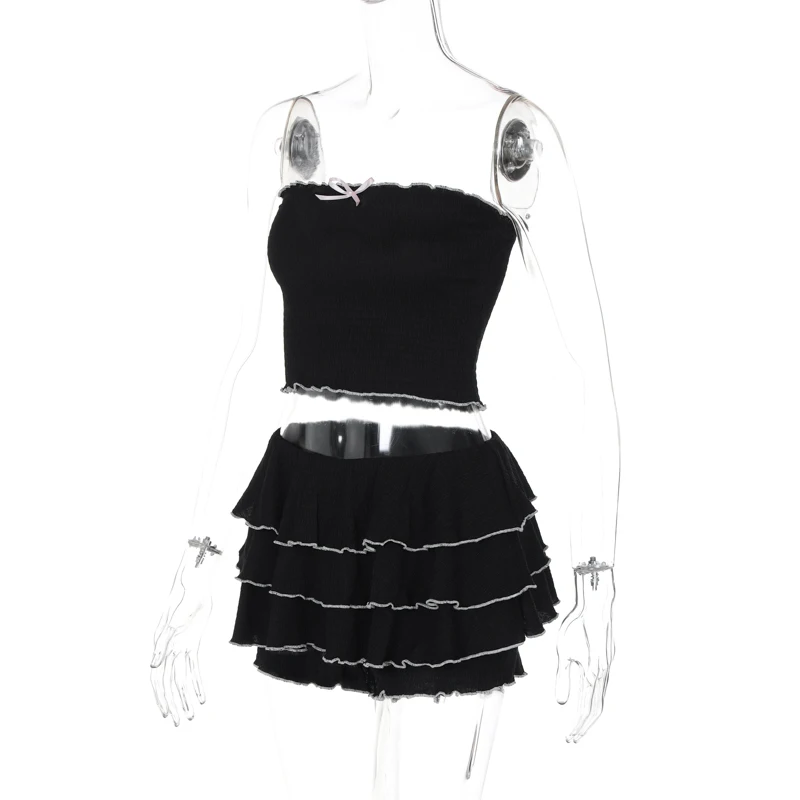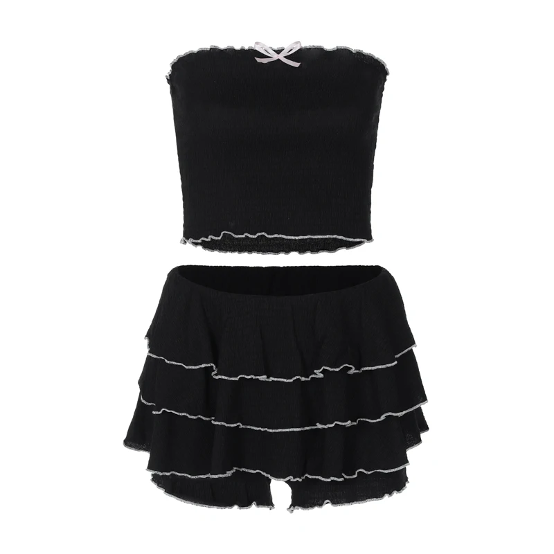Fashion 2 Pcs Sets Black Bow Strapless Sexy Crop Tank Top Pleated Skirts Summer Women Y2K Clothes Birthday Party Festiv