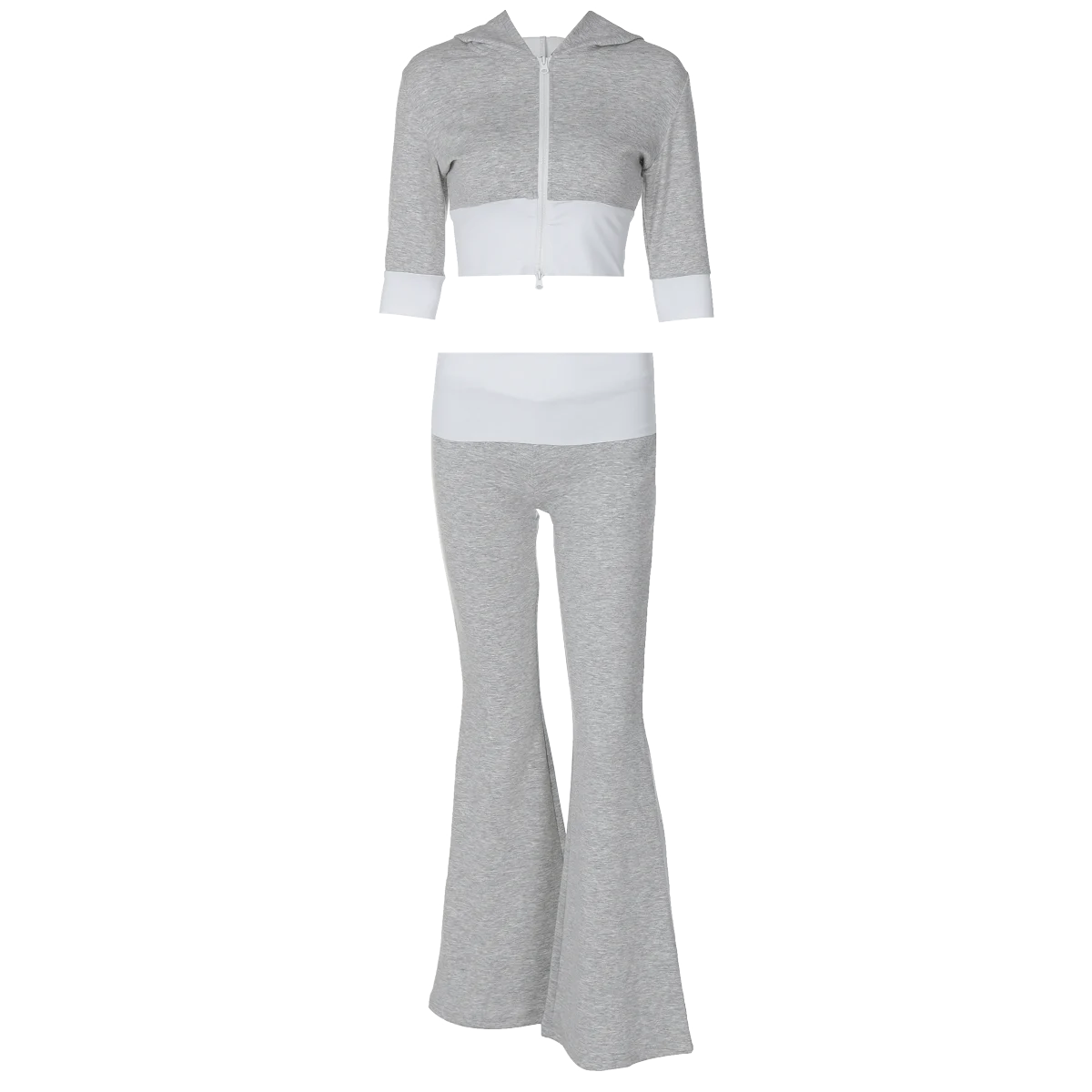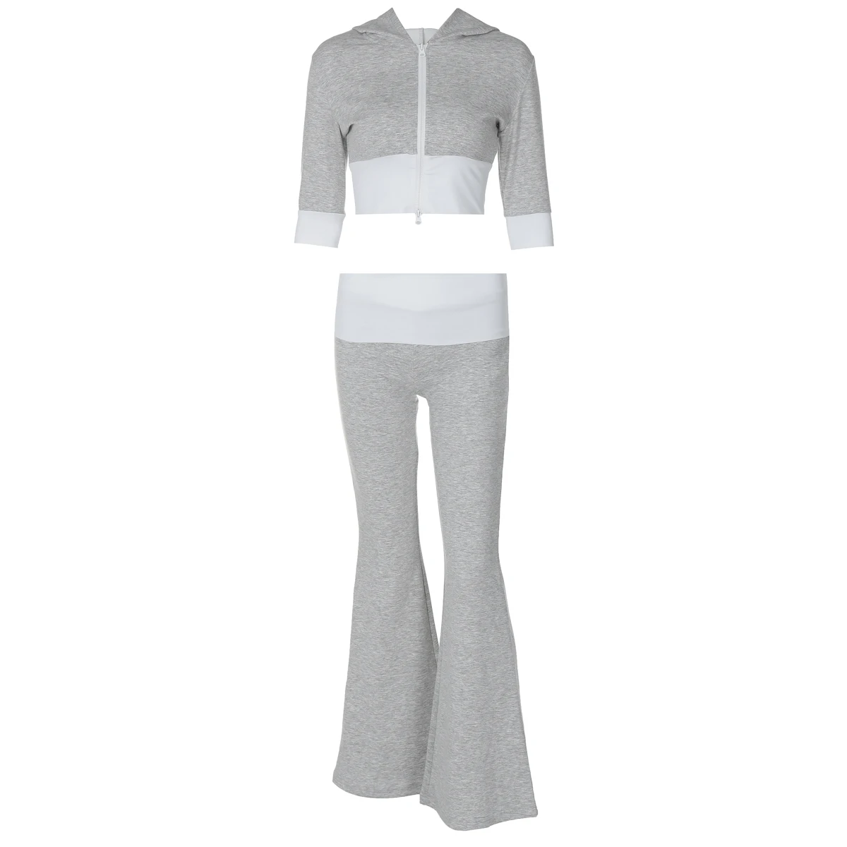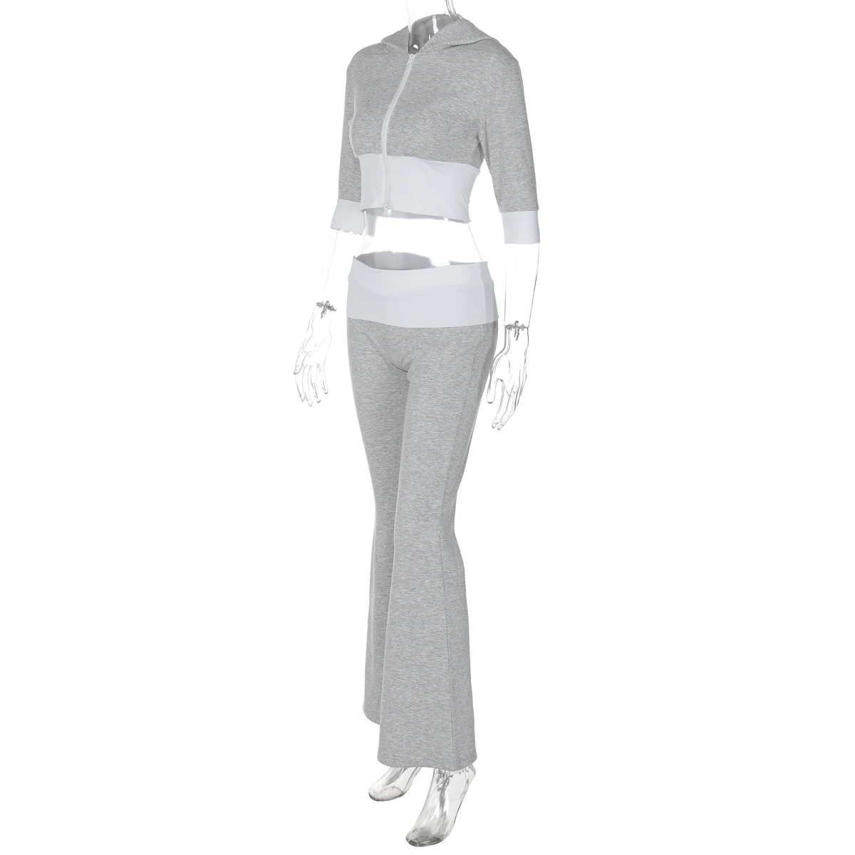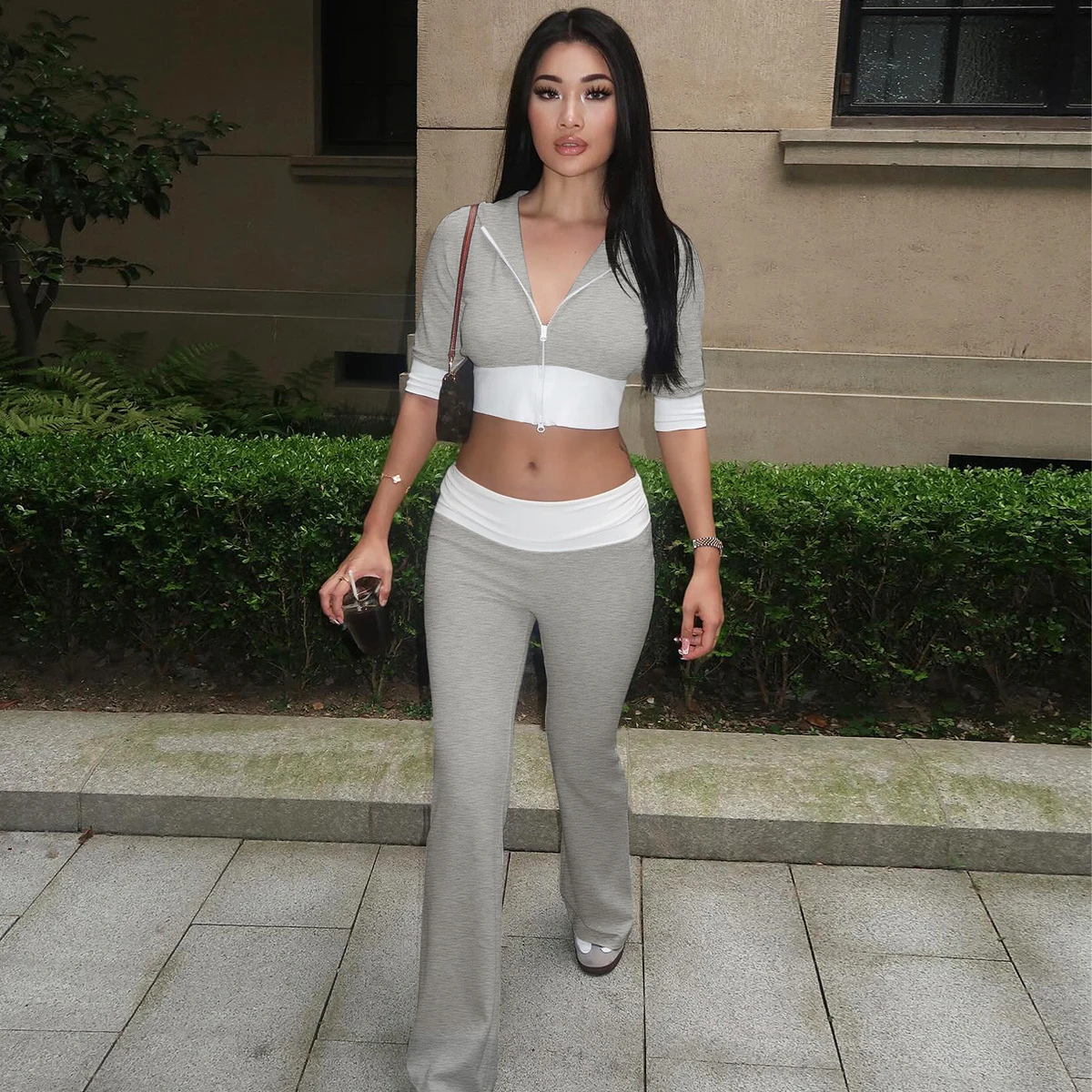 Fashion 2 Pcs Sets Matching Color Hoodies Half Sleeve Zipper Crop Coat Flare Pants Women Outfits Streetwear Sport Gym