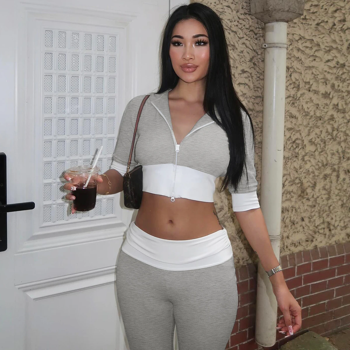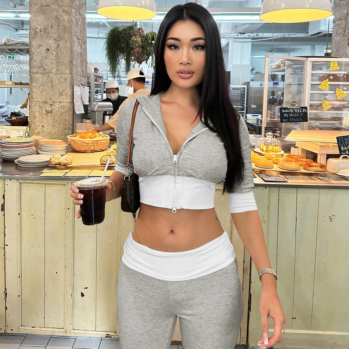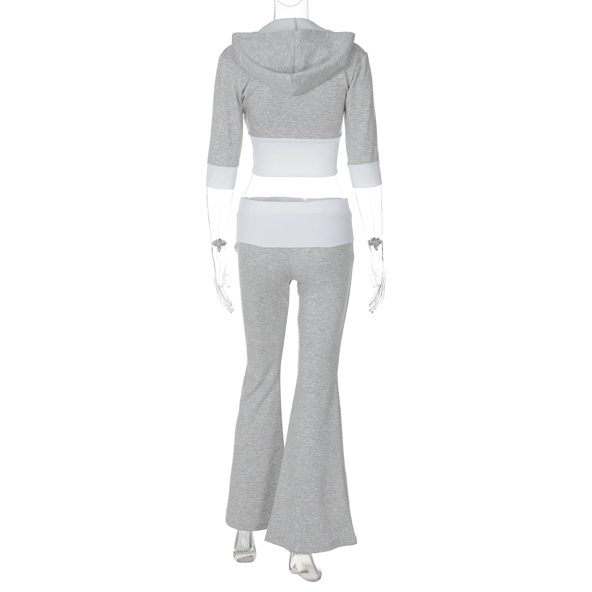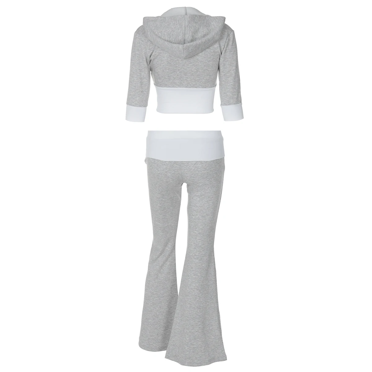 Fashion 2 Pcs Sets Matching Color Hoodies Half Sleeve Zipper Crop Coat Flare Pants Women Outfits Streetwear Sport Gym
