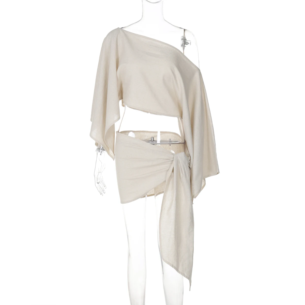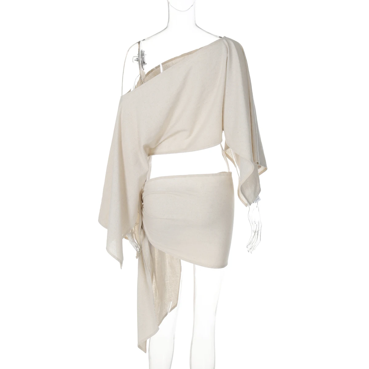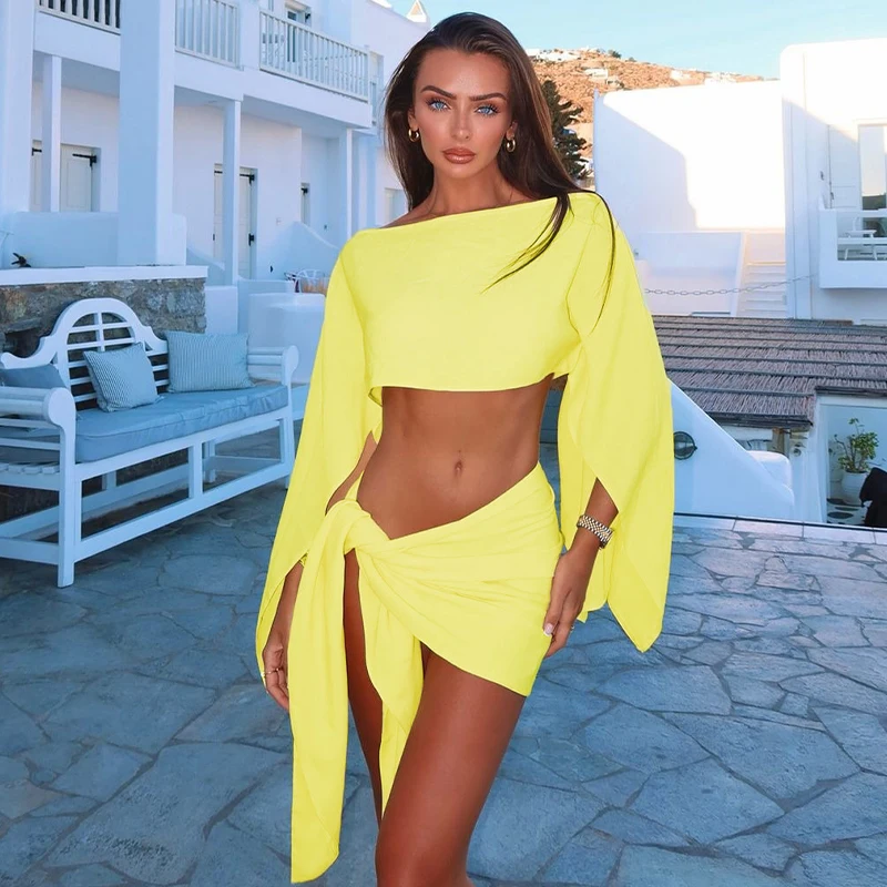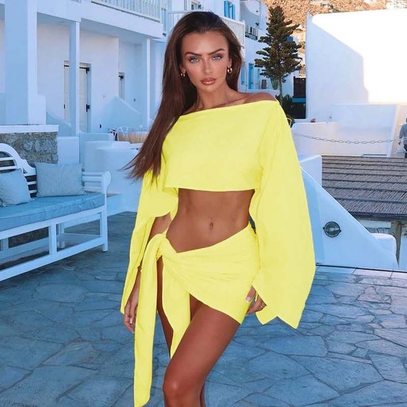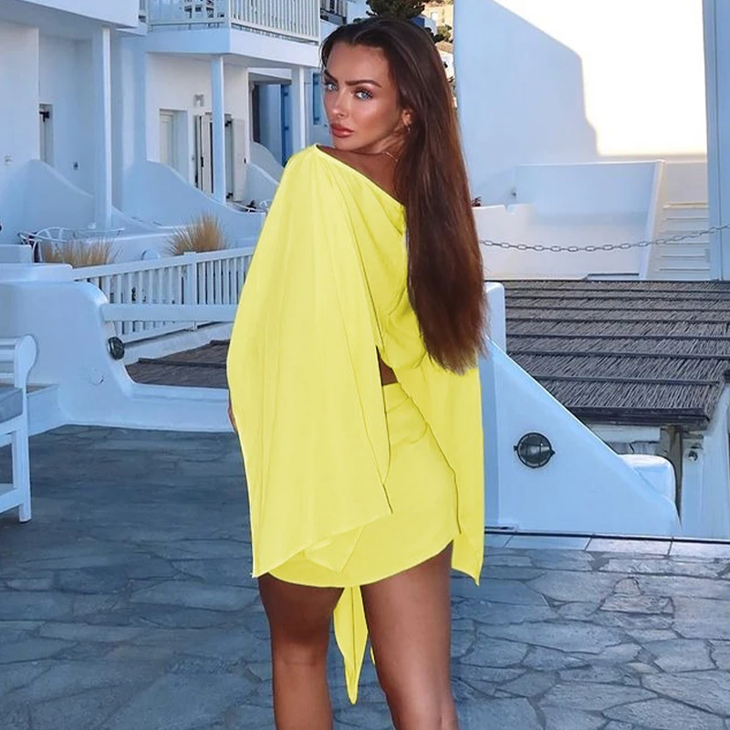 Fashion 2 Pcs Sets Solid Skew Collar Long Flare Sleeve Sexy Crop Top Bandage Skirt Irregular Fall Outfit Beach Festival