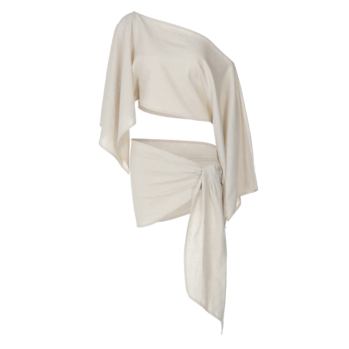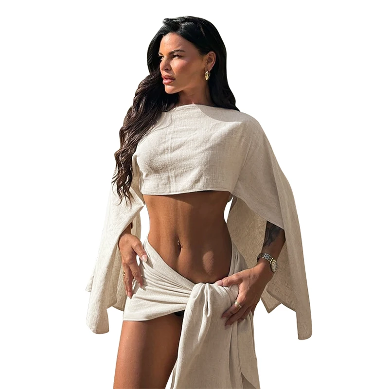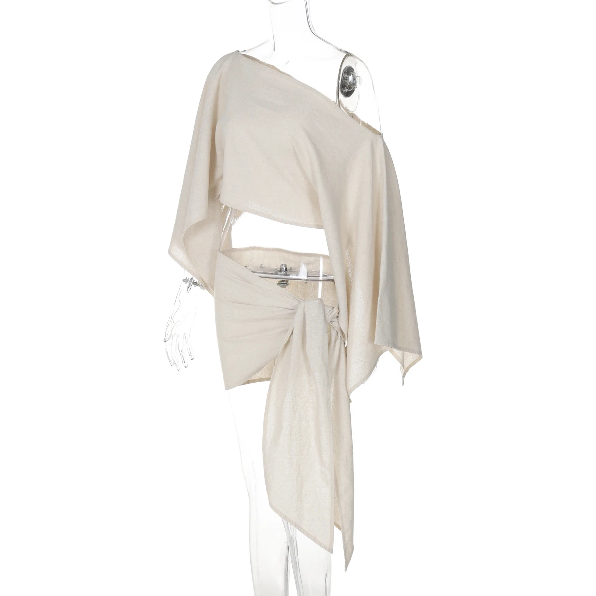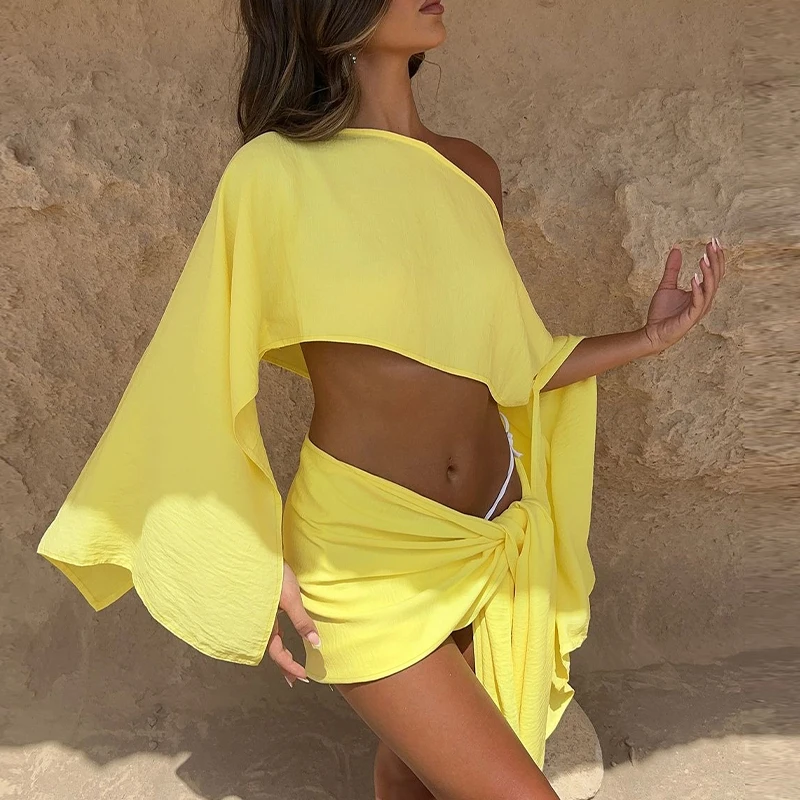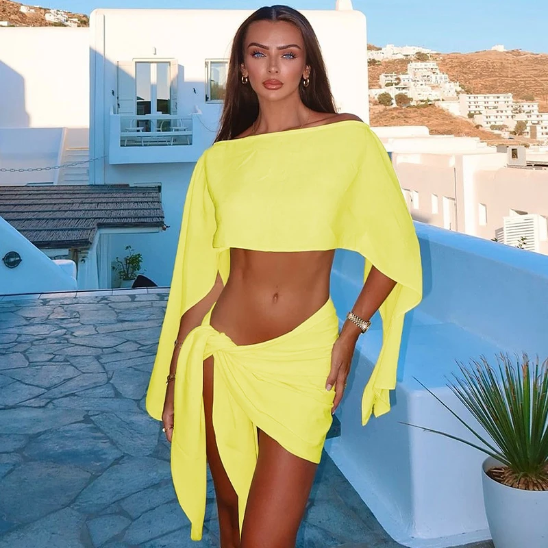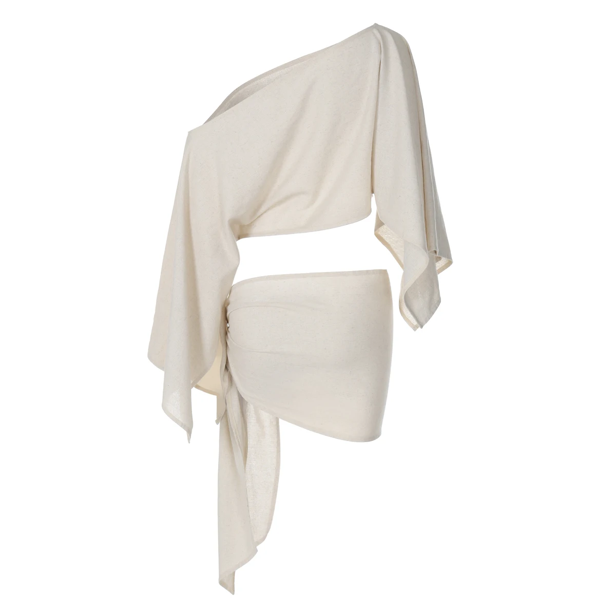 Fashion 2 Pcs Sets Solid Skew Collar Long Flare Sleeve Sexy Crop Top Bandage Skirt Irregular Fall Outfit Beach Festival