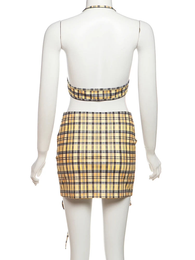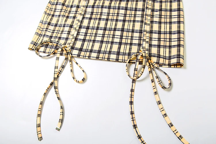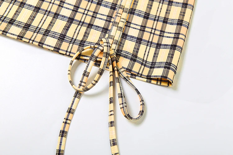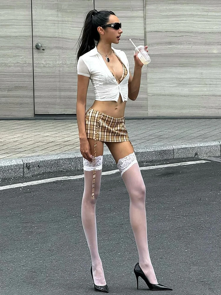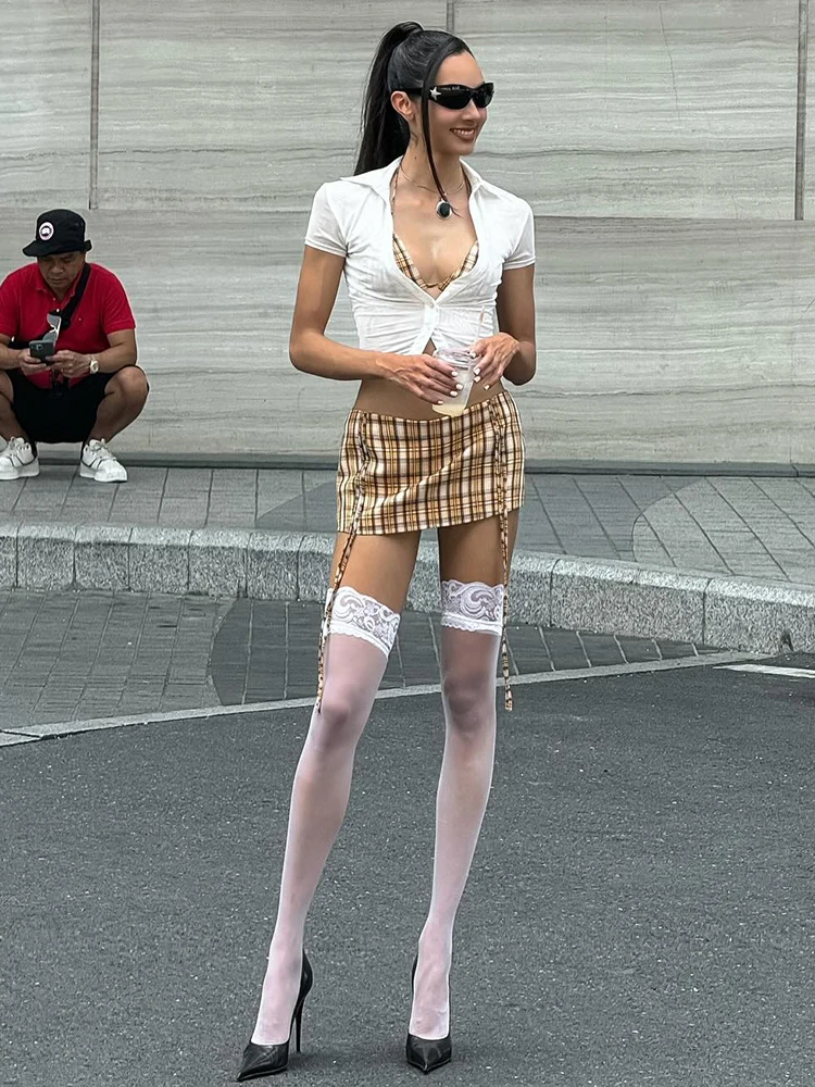 Fashion 3-Piece Set Women Mini v-Neck Buttons Blouse+Plaid Halter Bra+Shirring Tassel Skirts Street Hottie Sexy Suits