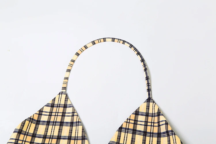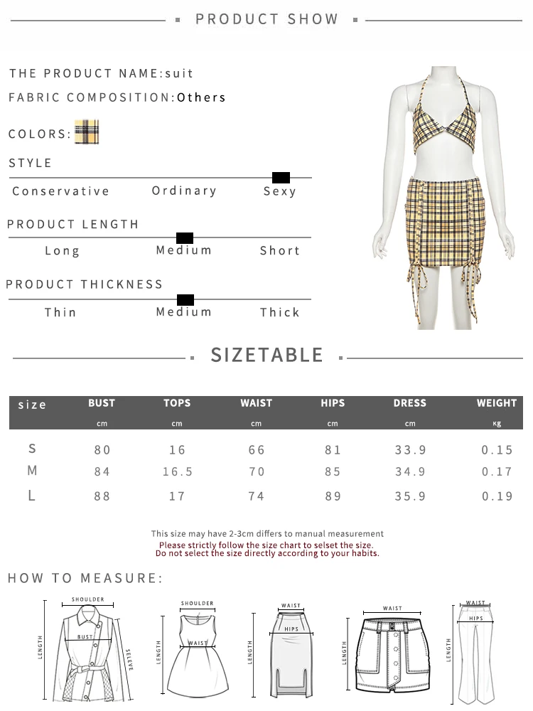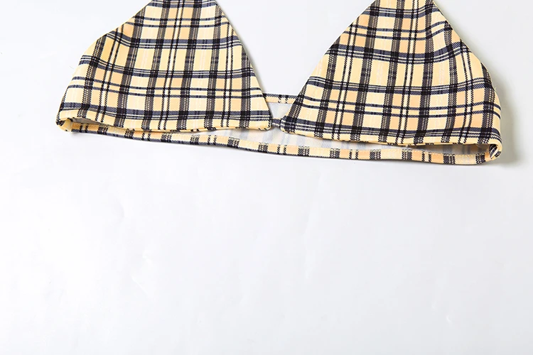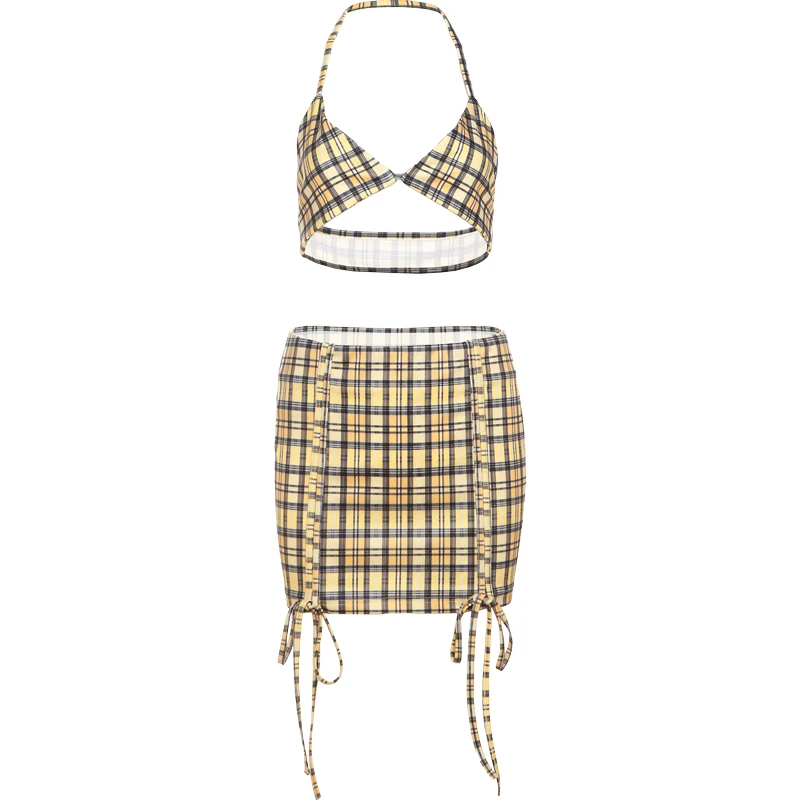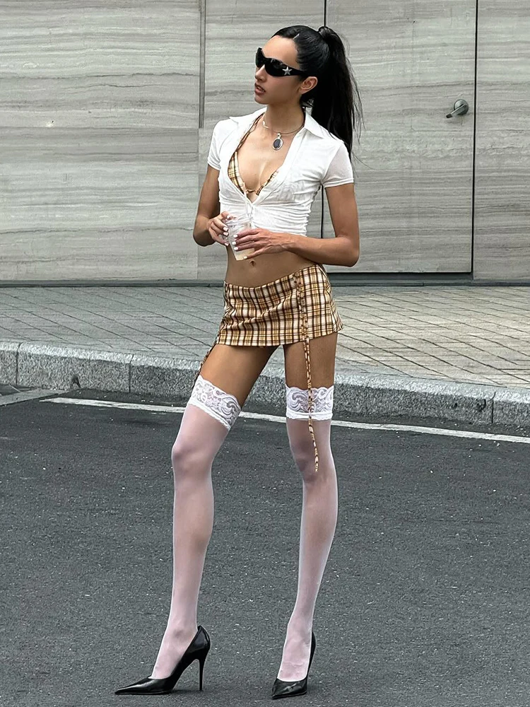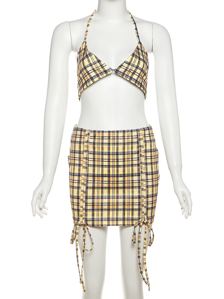 Fashion 3-Piece Set Women Mini v-Neck Buttons Blouse+Plaid Halter Bra+Shirring Tassel Skirts Street Hottie Sexy Suits