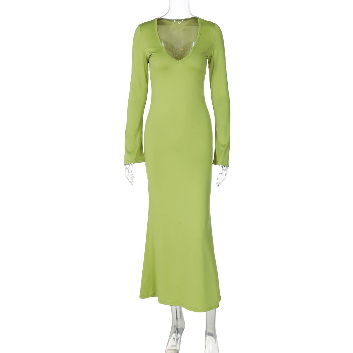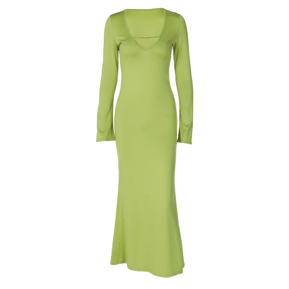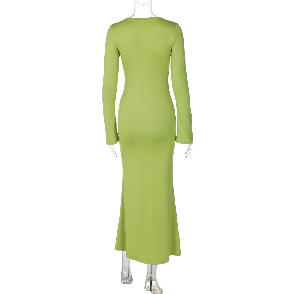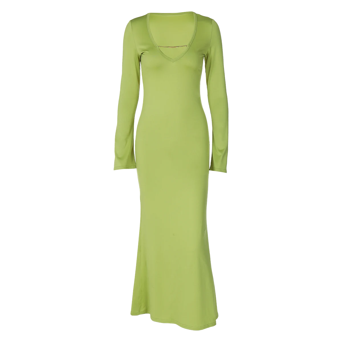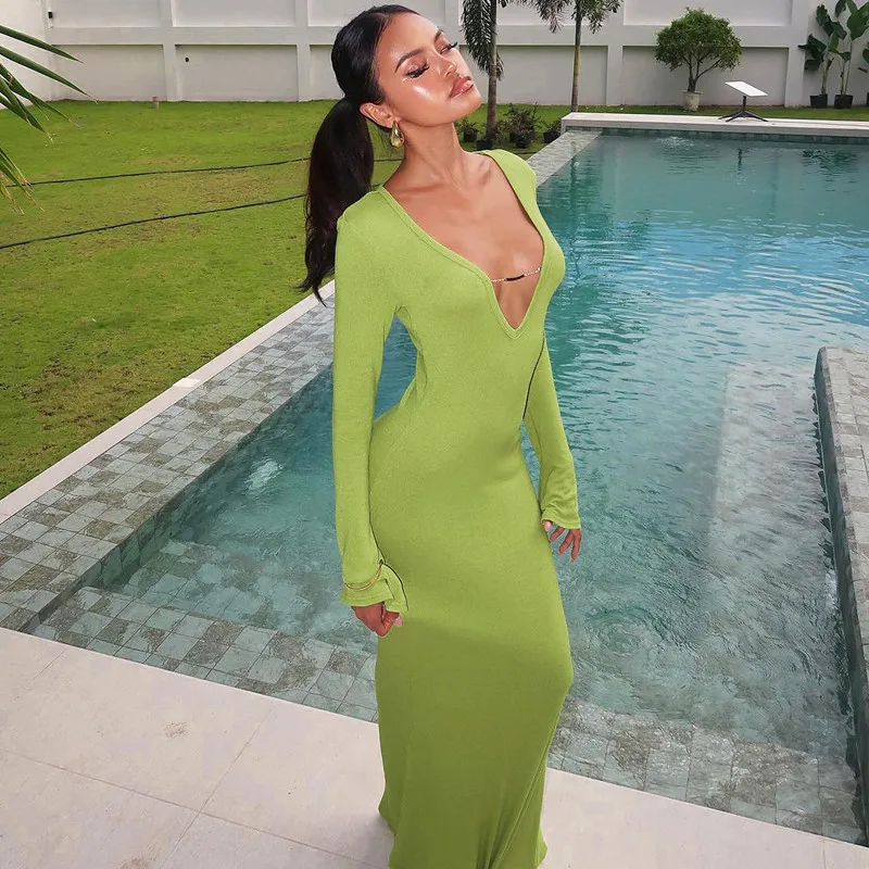Fashion Green V Neck Long Sleeves Chain Sexy Bodycon Maxi Dress Fall Women Y2K Outfits Birthday Party Festival