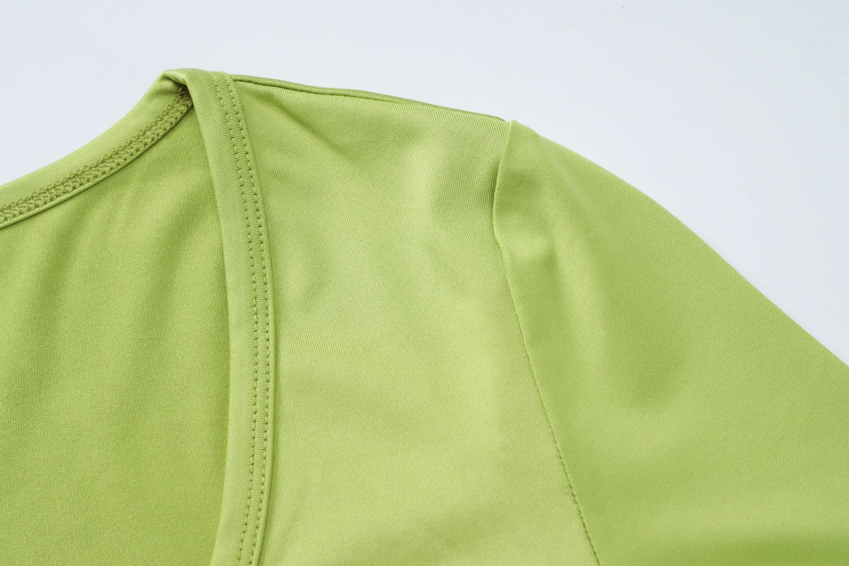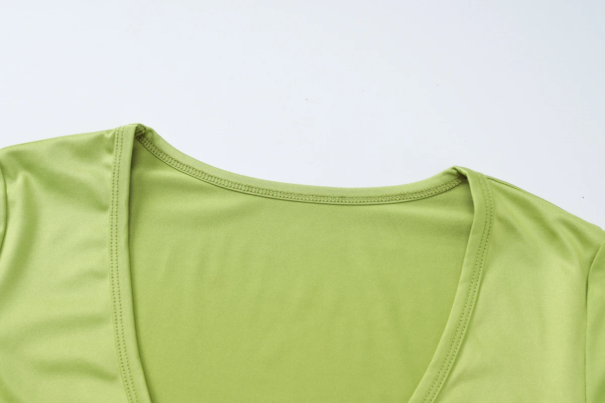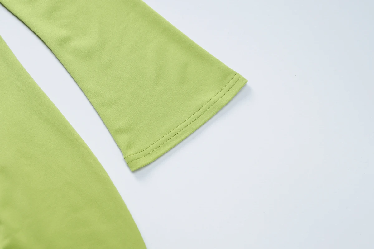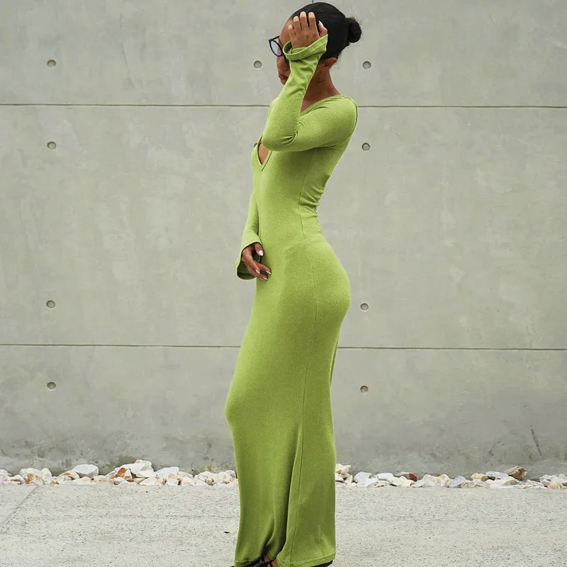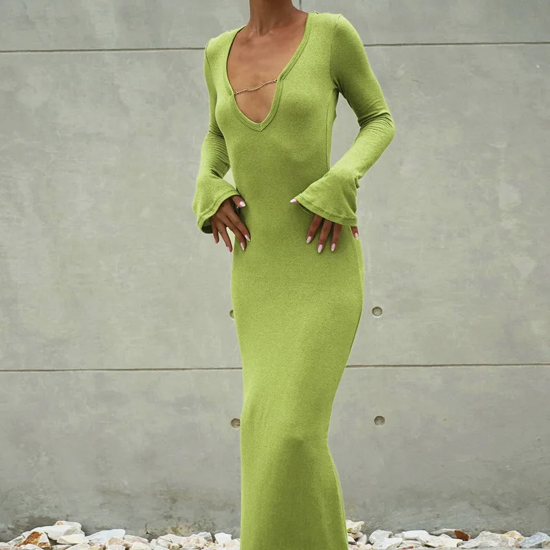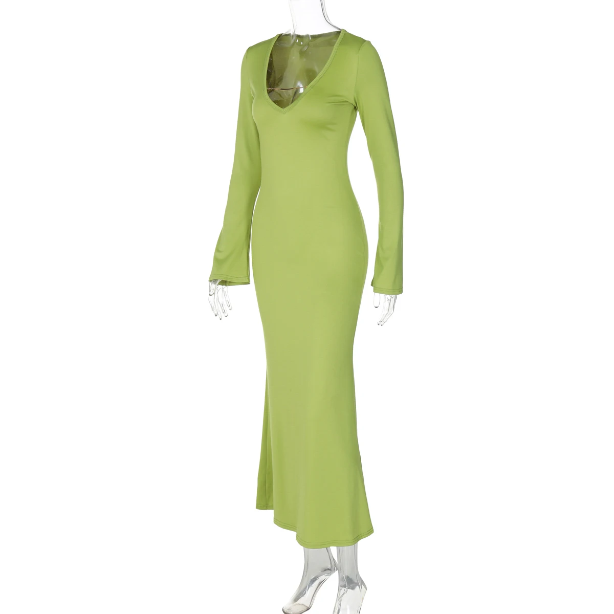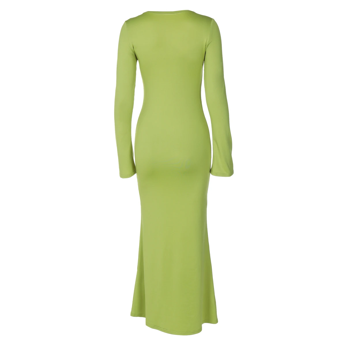 Fashion Green V Neck Long Sleeves Chain Sexy Bodycon Maxi Dress Fall Women Y2K Outfits Birthday Party Festival