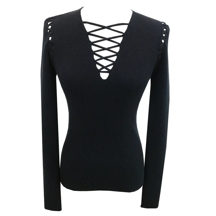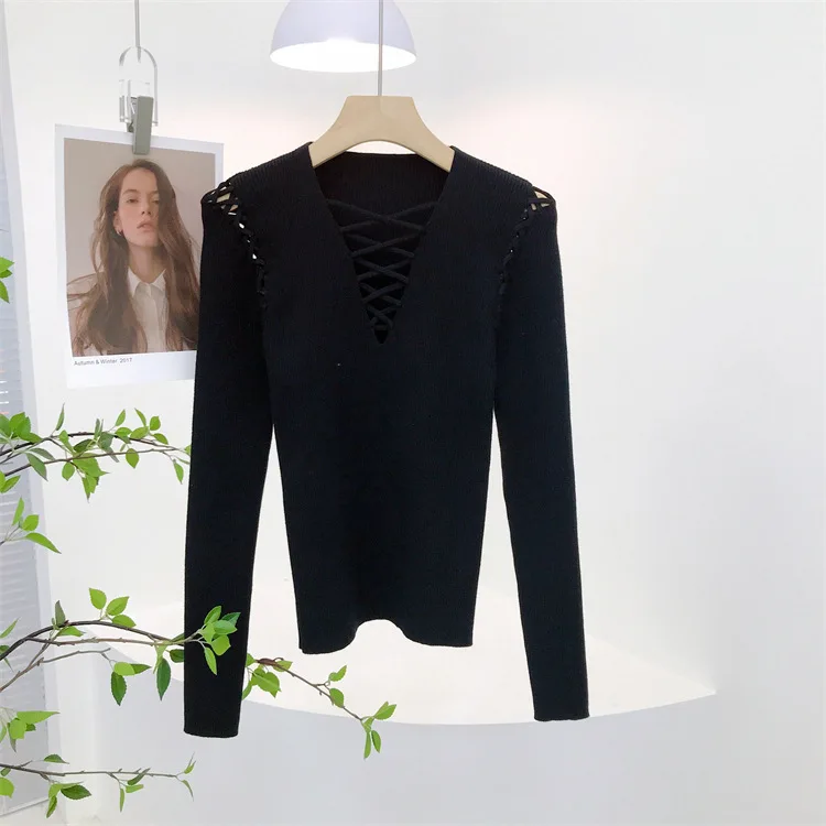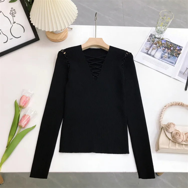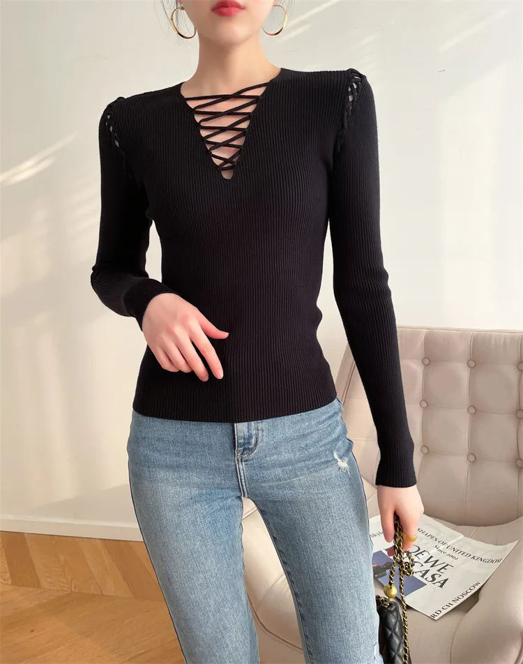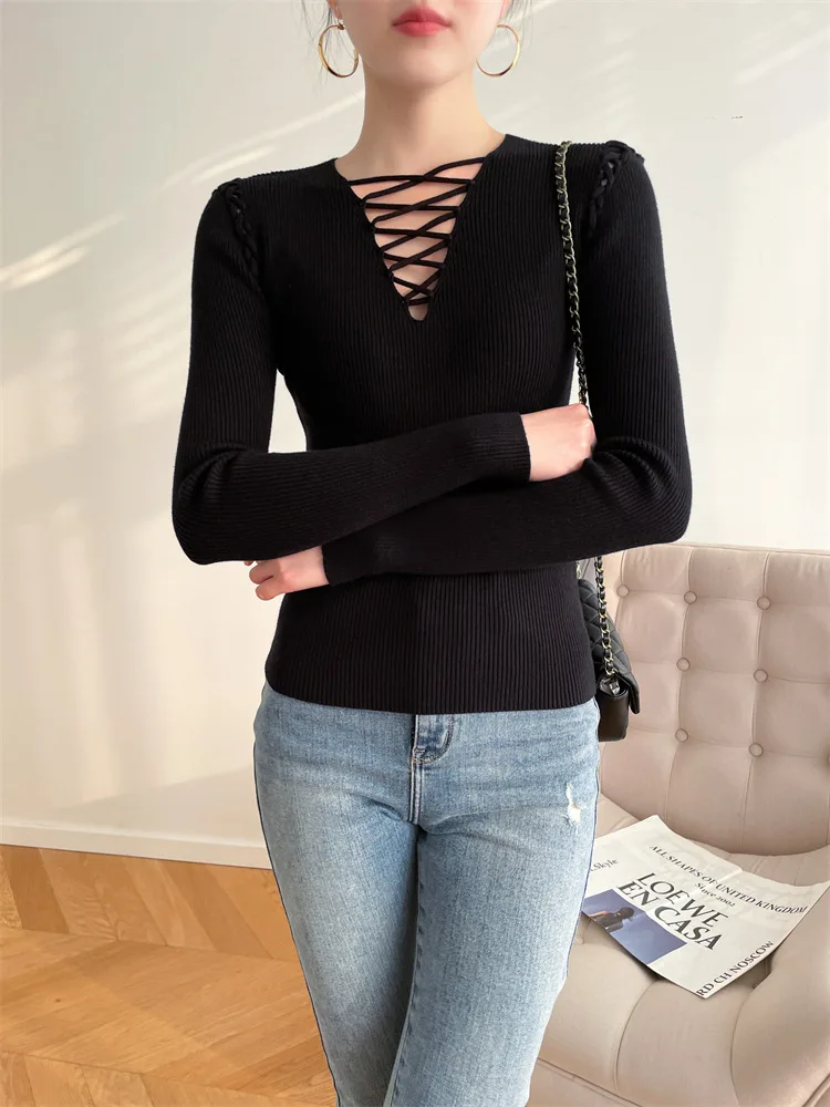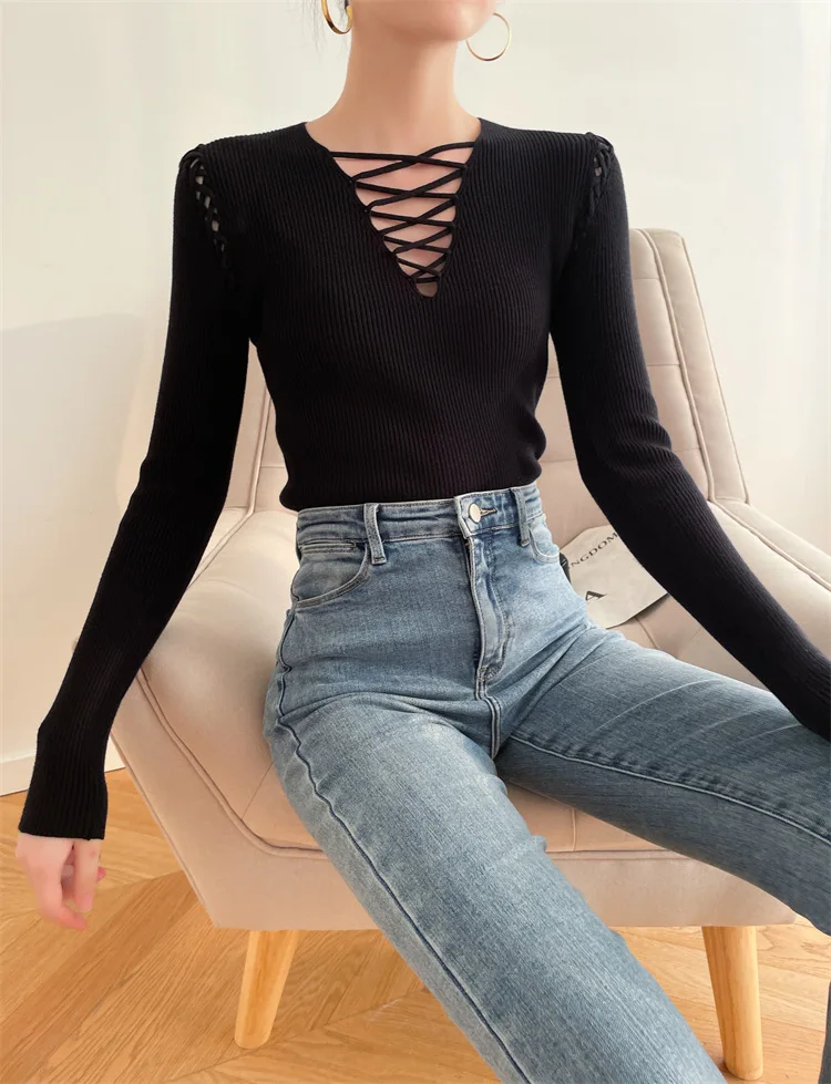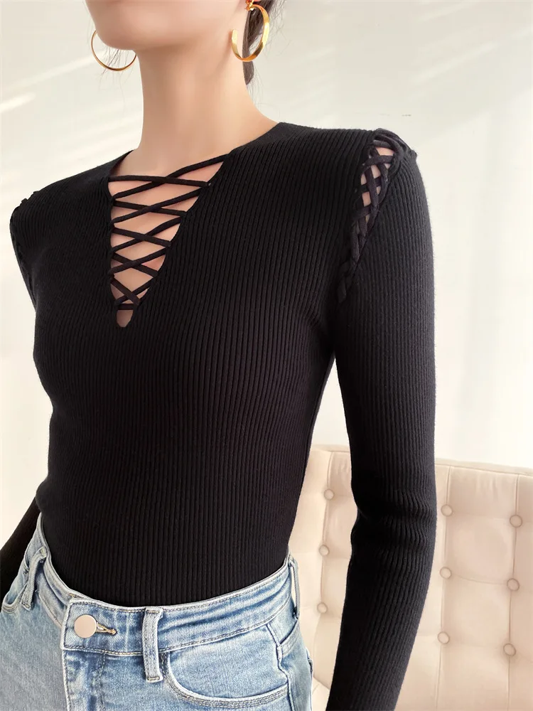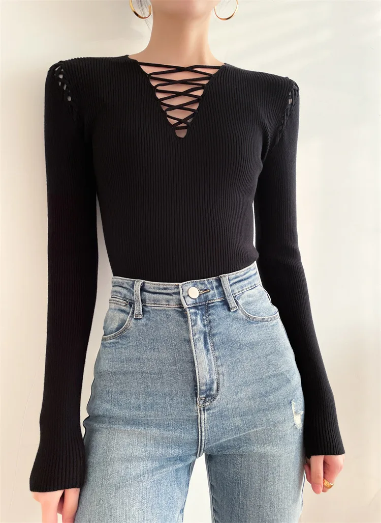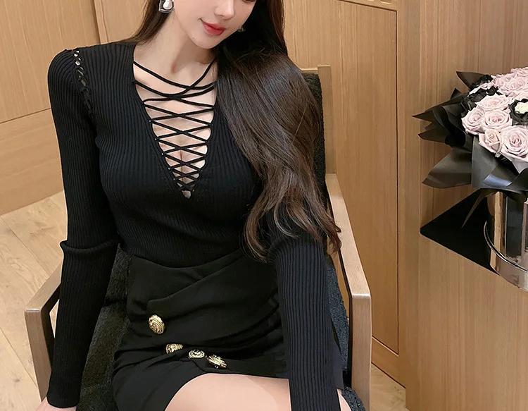 Fashion Knitted Long Sleeve Hollow Sweater Female Sexy Deep V-neck Cross Elastic Autumn/Winter New 2025 Street Clothing