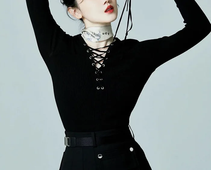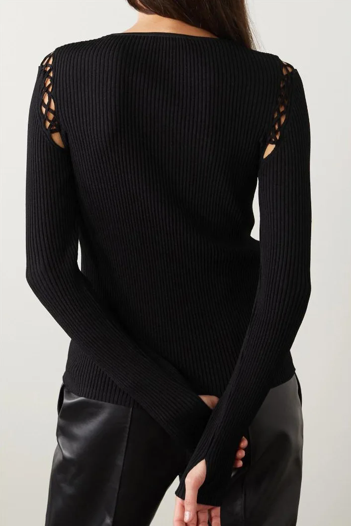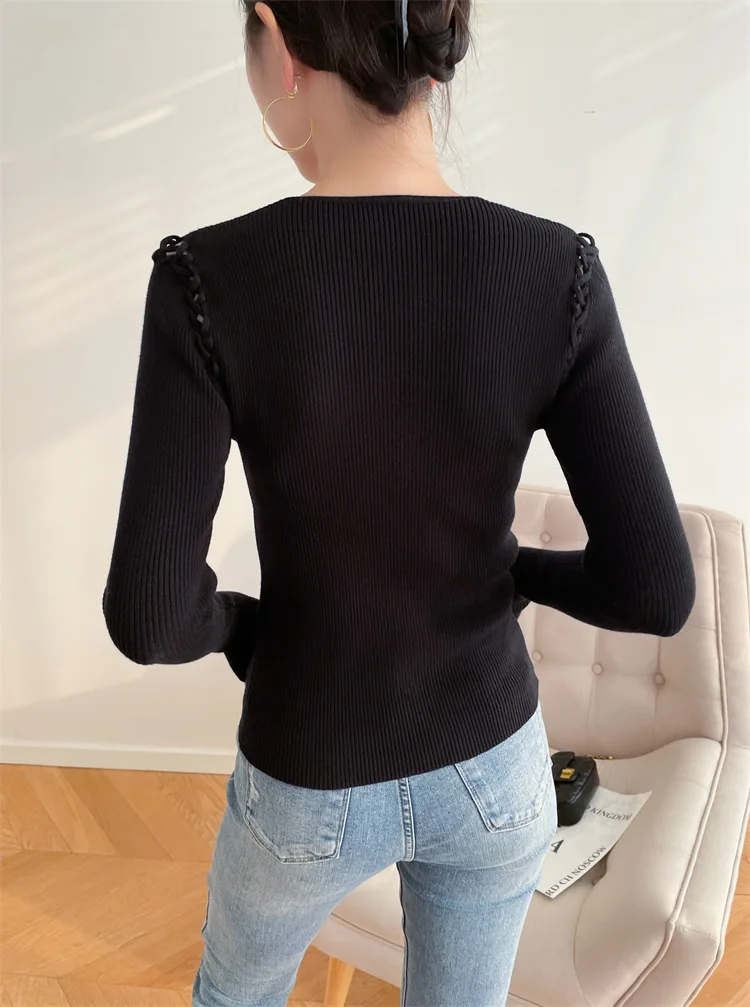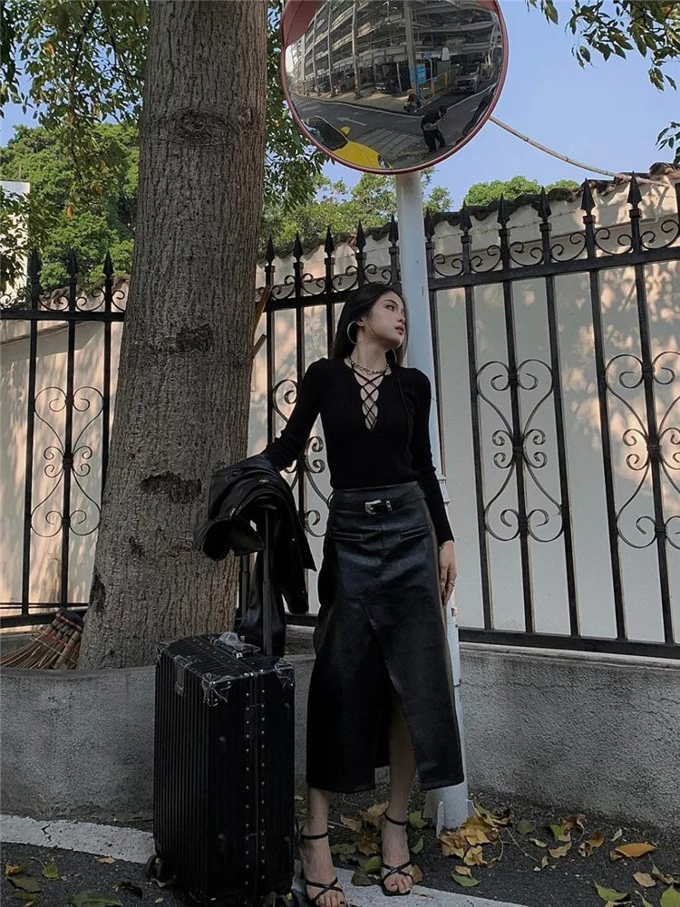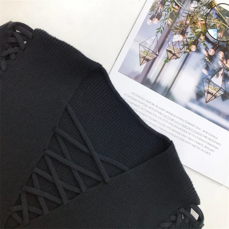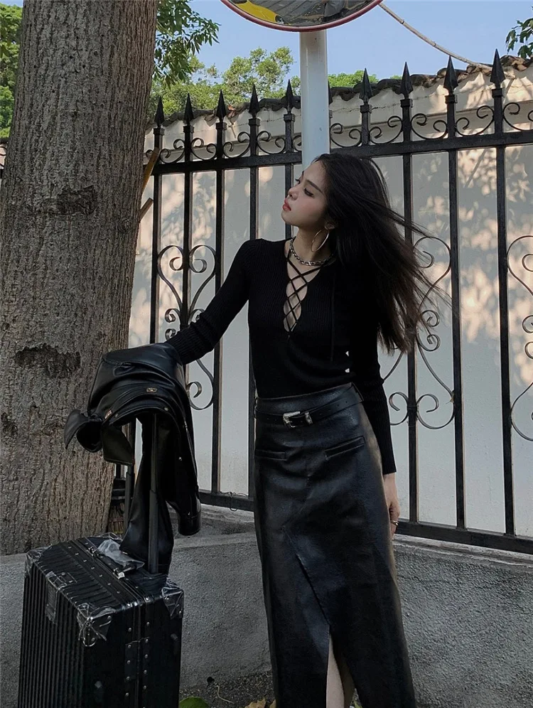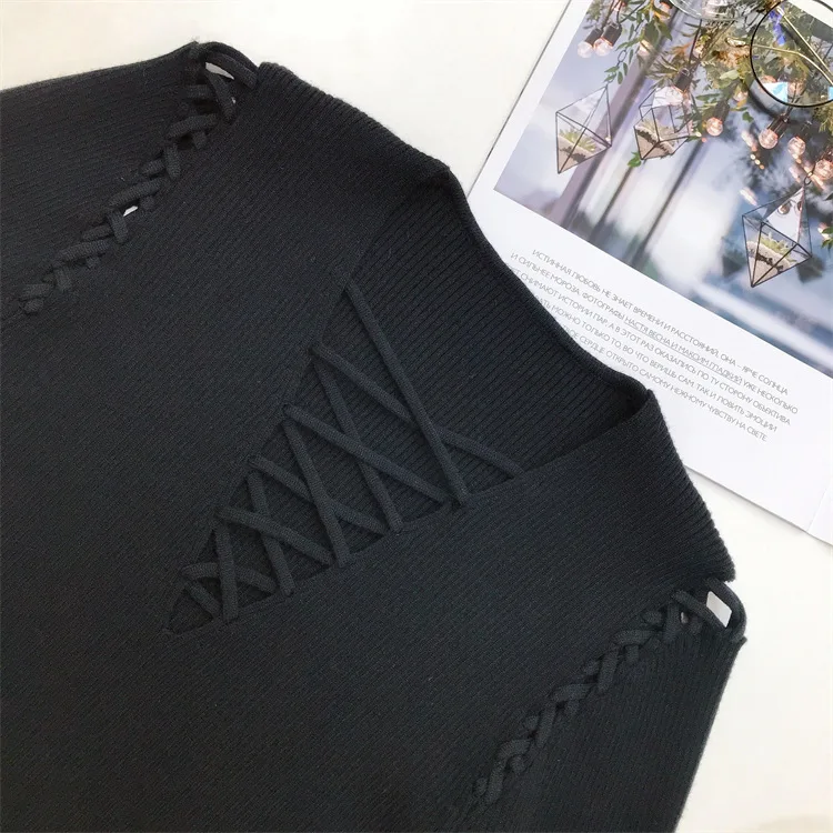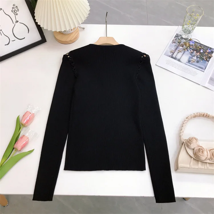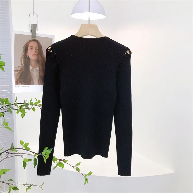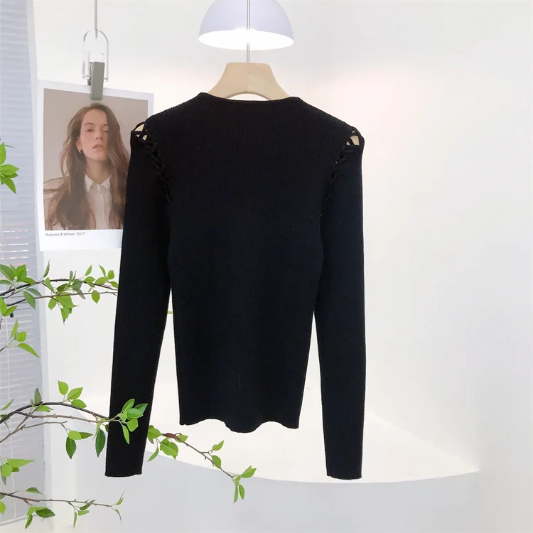 Fashion Knitted Long Sleeve Hollow Sweater Female Sexy Deep V-neck Cross Elastic Autumn/Winter New 2025 Street Clothing