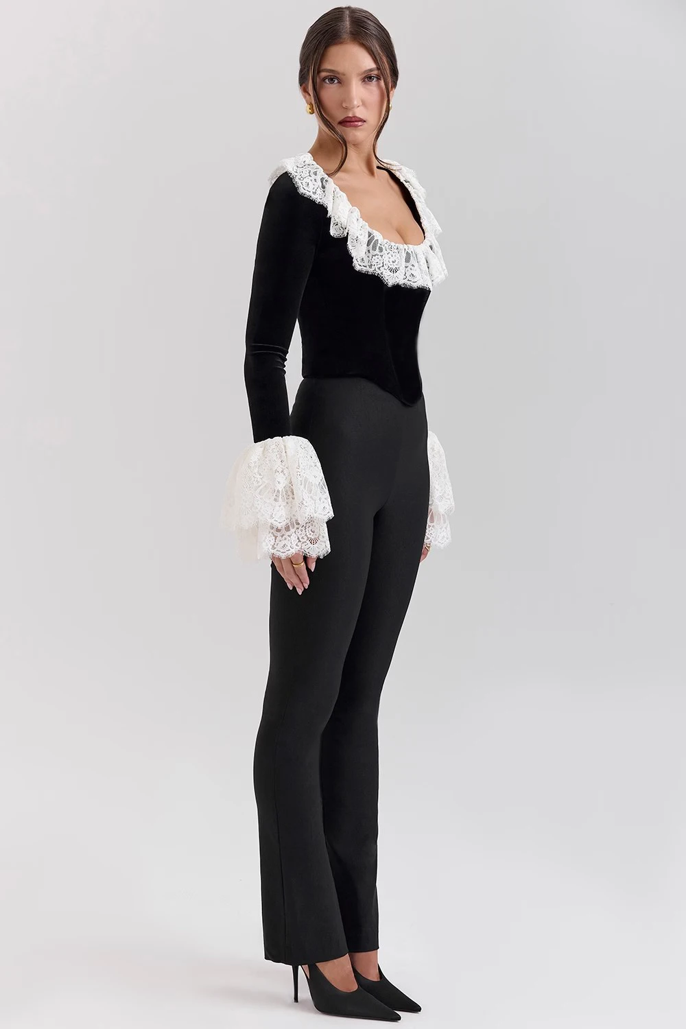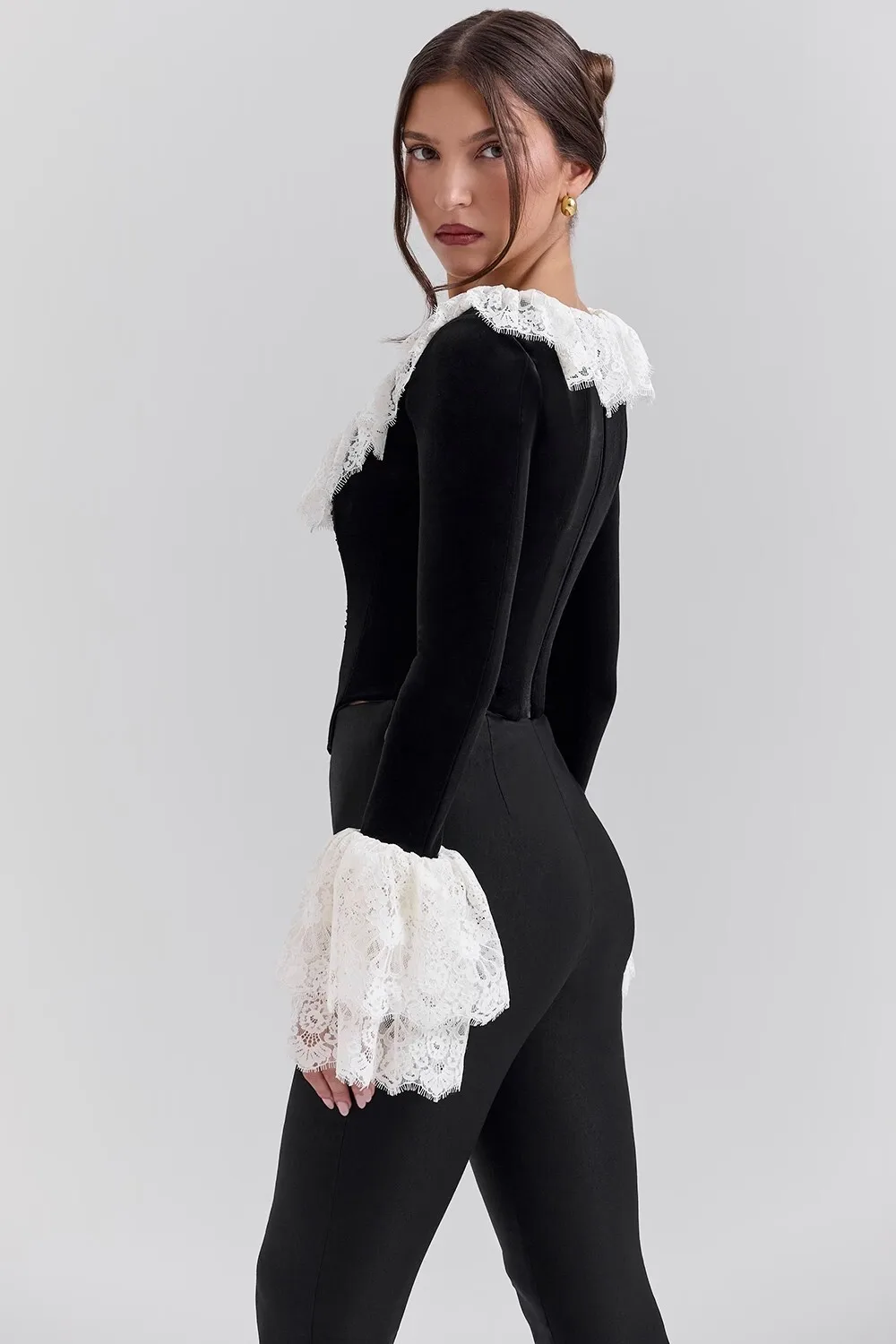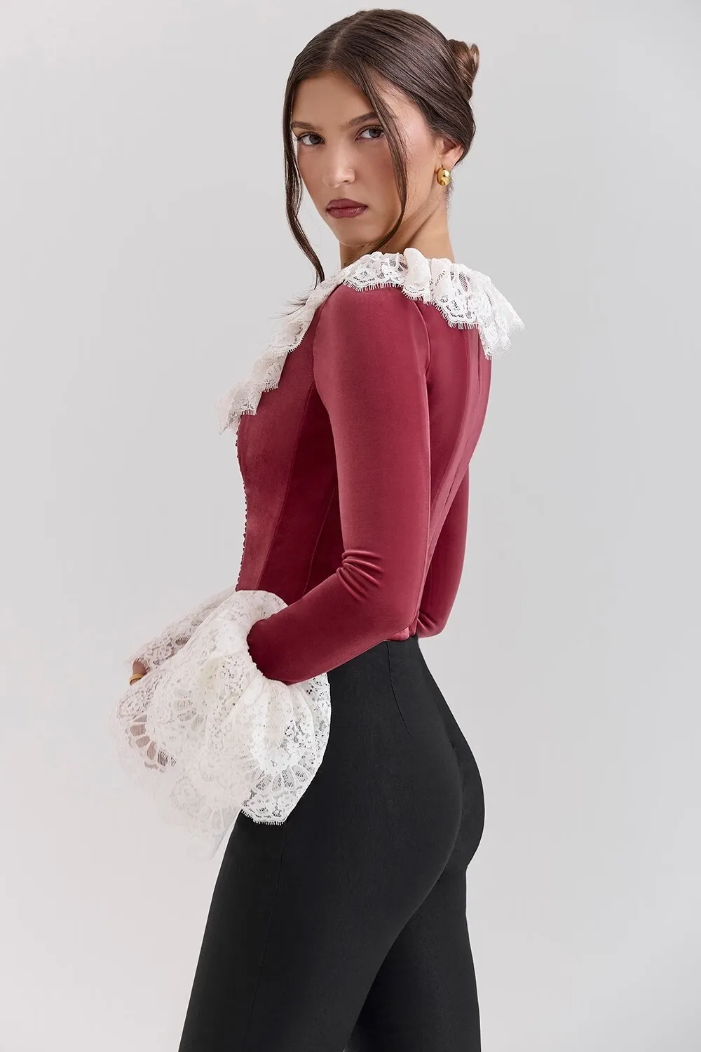 Fashion Lace Lace Korean Velvet Patchwork Elastic Tight Women's Top Sexy Bandage T-shirt Autumn/Winter Long Sleeve 2025