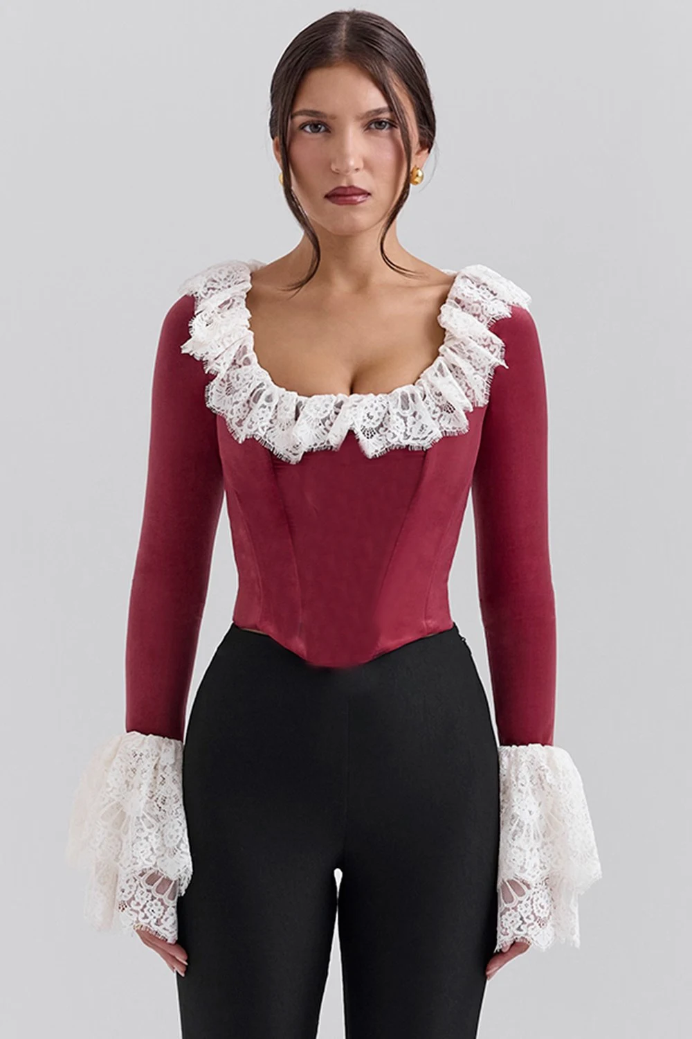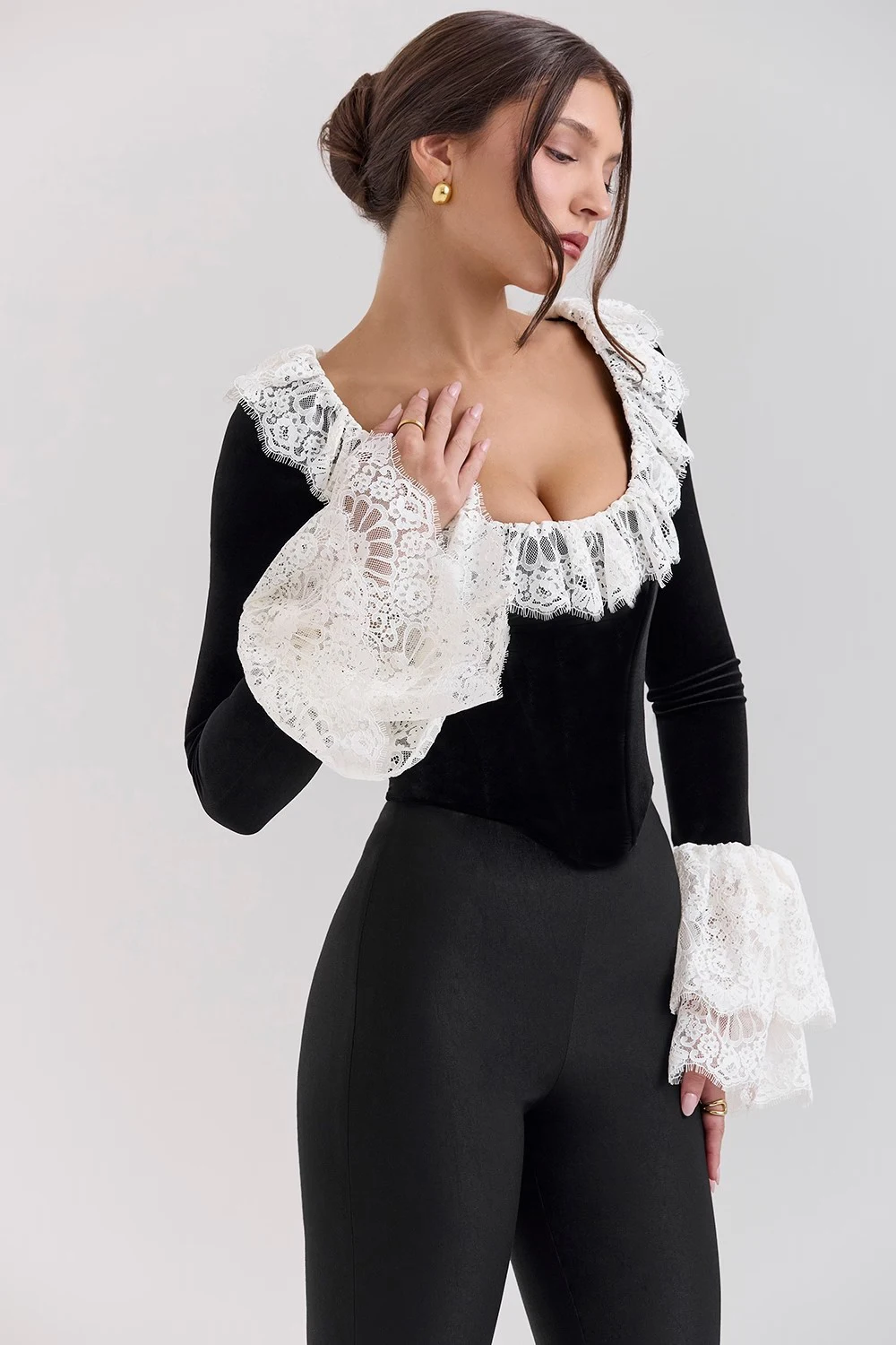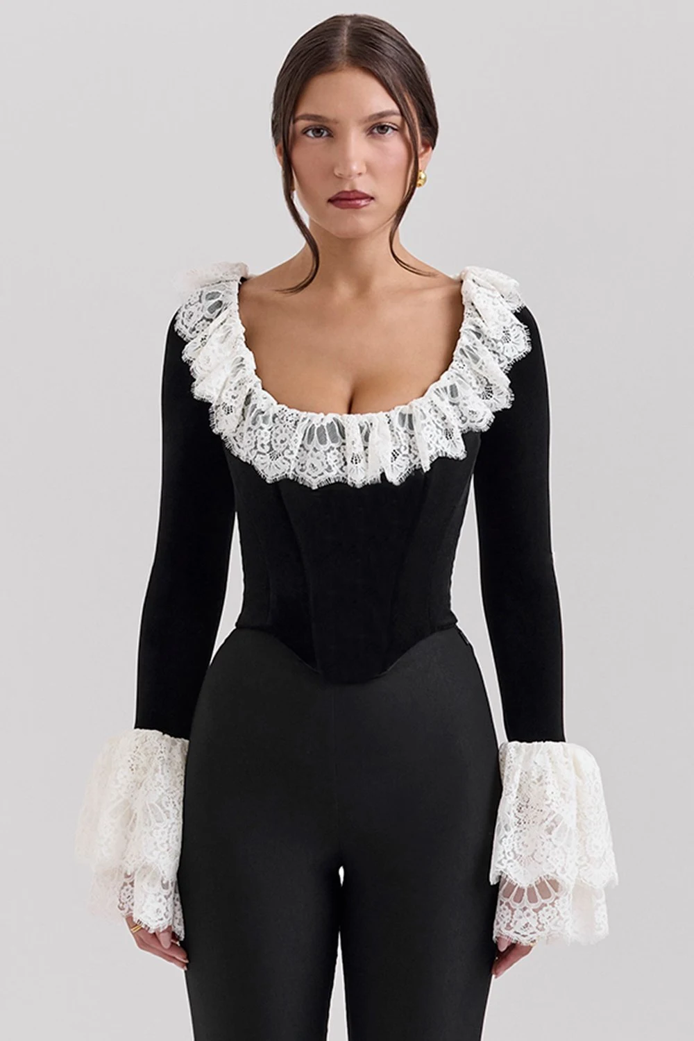 Load image into Gallery viewer, Fashion Lace Lace Korean Velvet Patchwork Elastic Tight Women's Top Sexy Bandage T-shirt Autumn/Winter Long Sleeve 2025