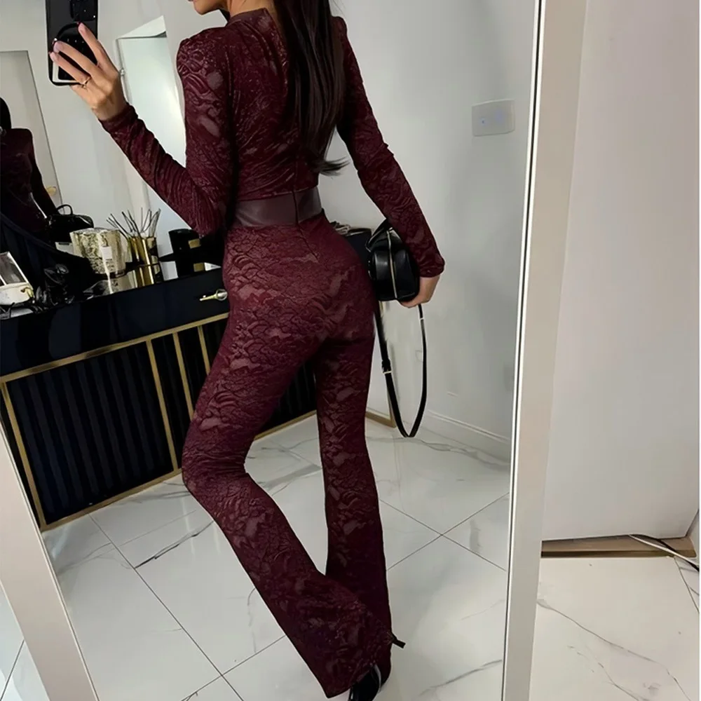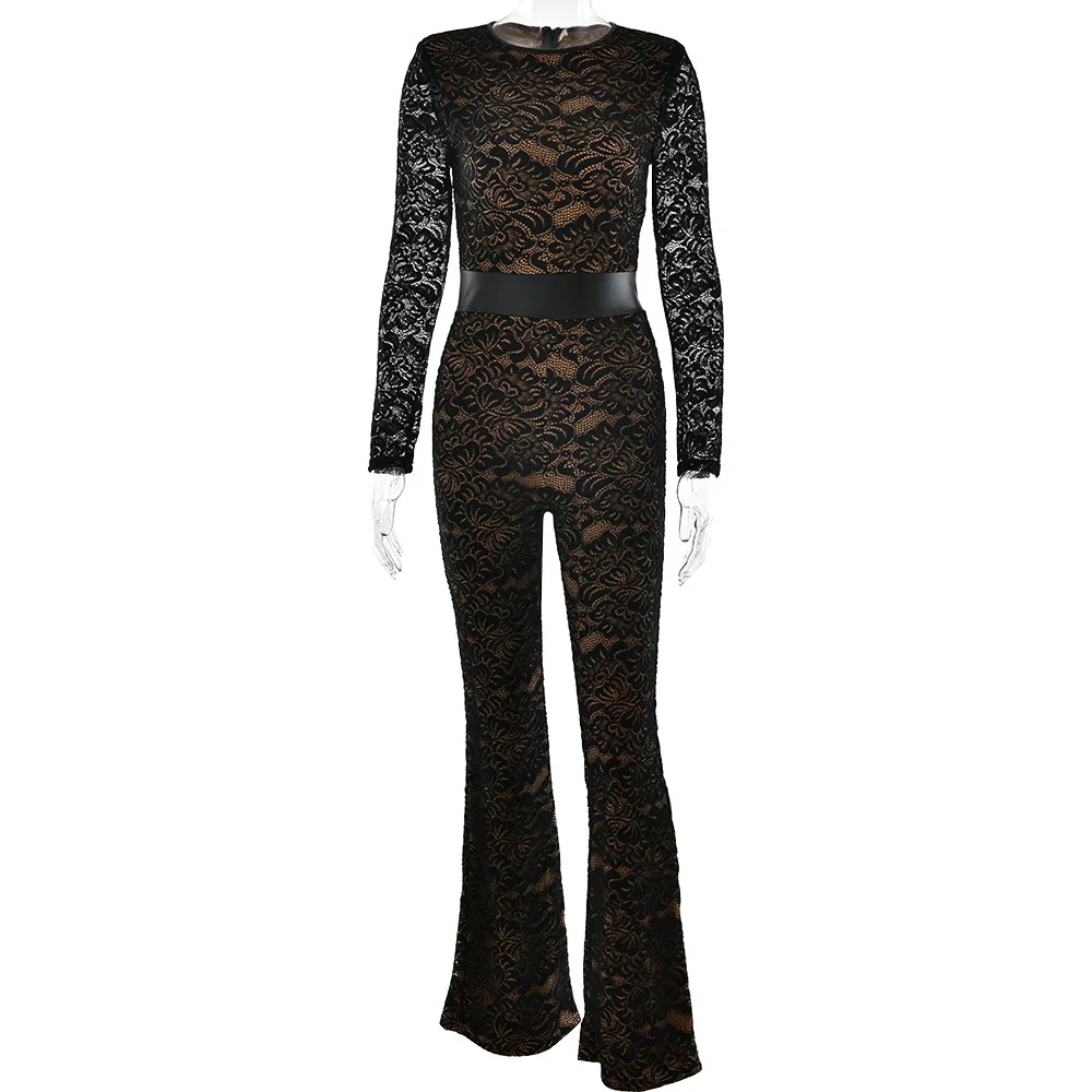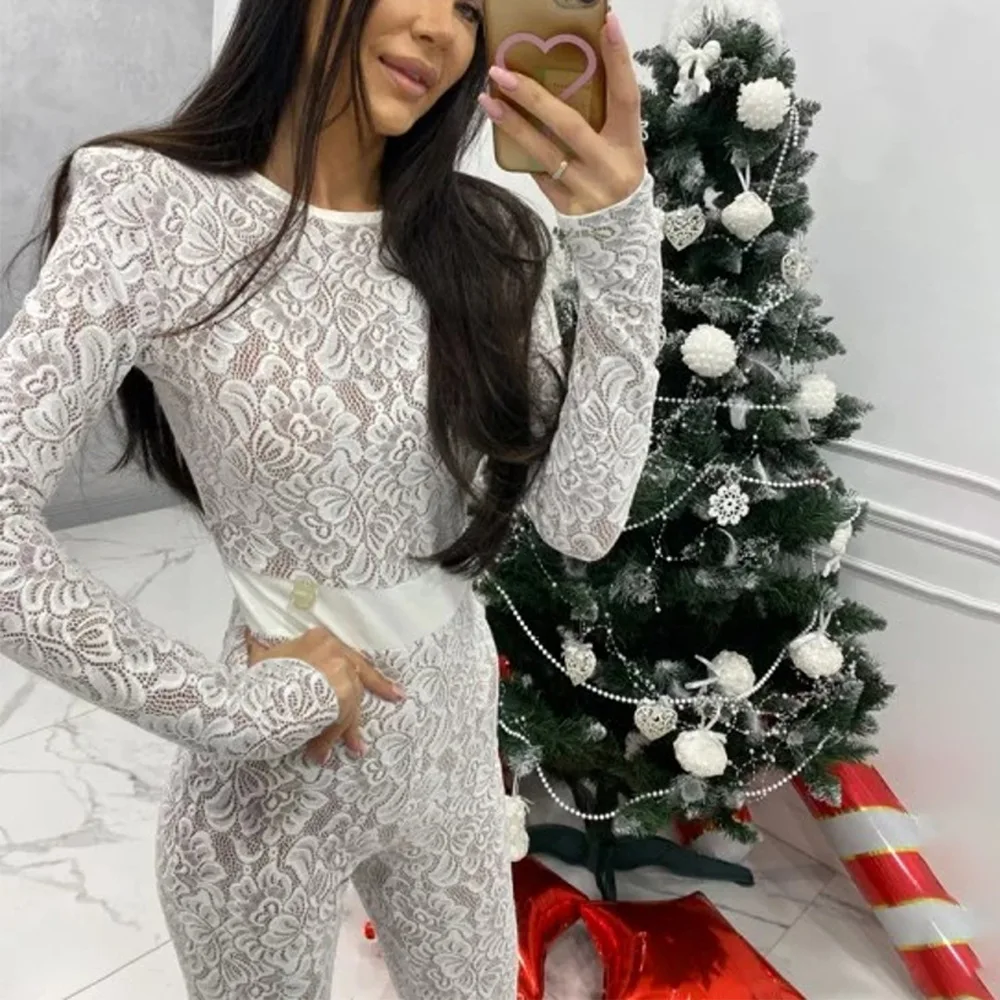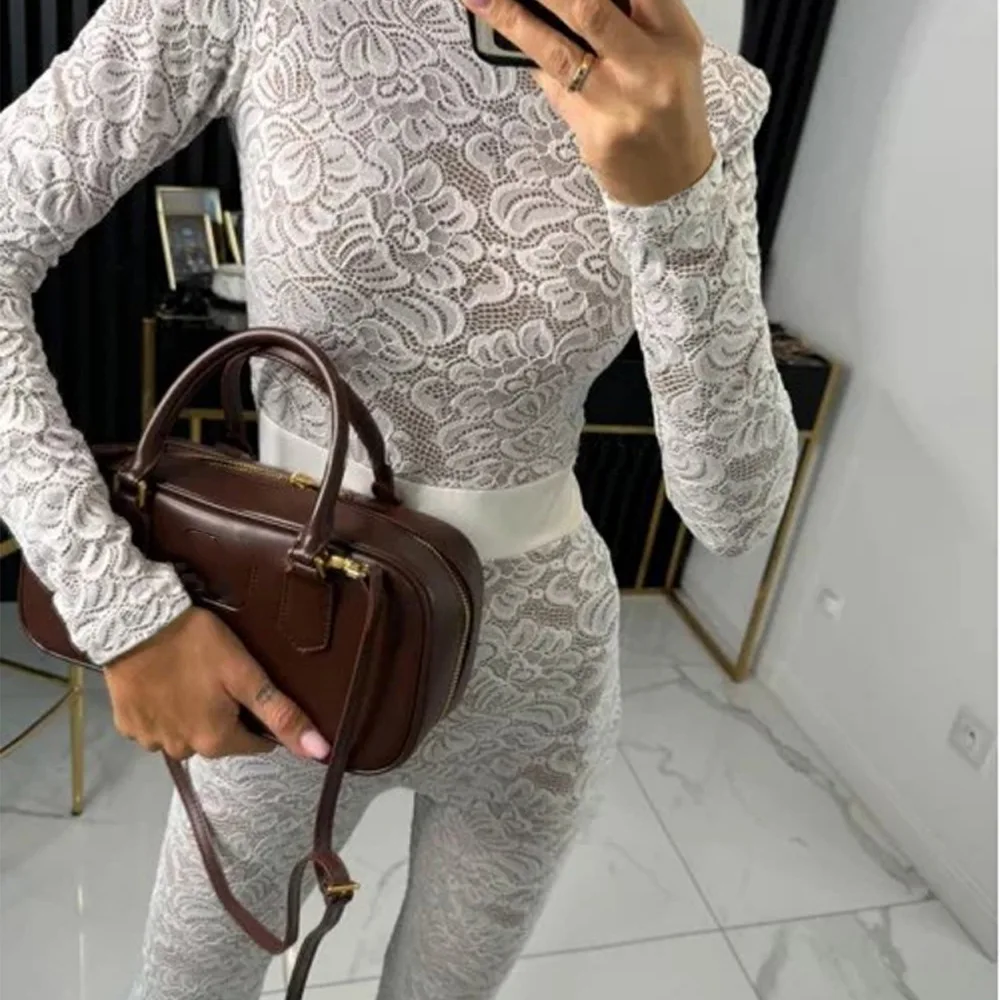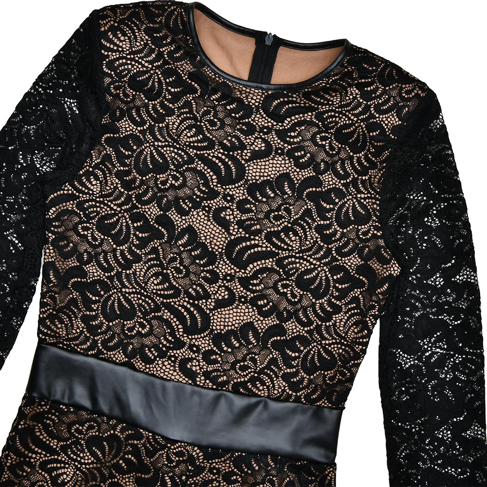 Fashion Lace Leather Patchwork Long Sleeved Jumpsuit Women's 2025 Autumn/Winter Sexy Patchwork New Elastic Tight Rompers
