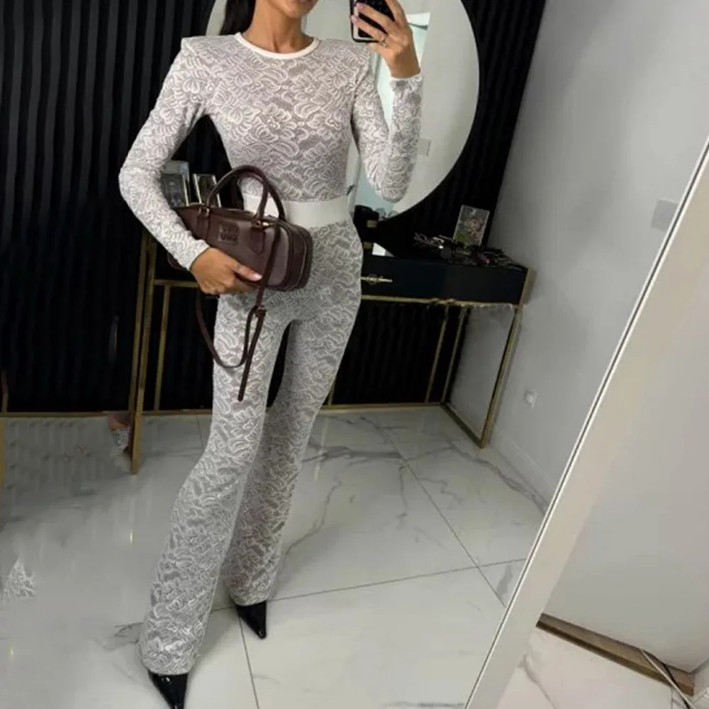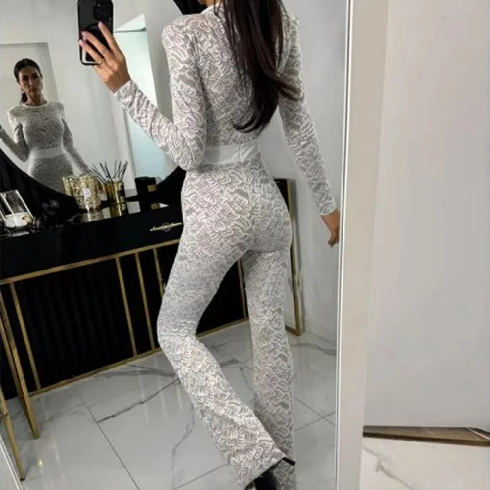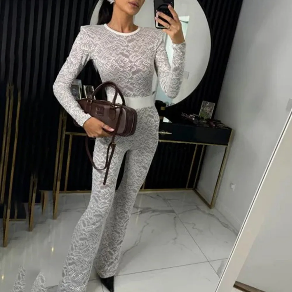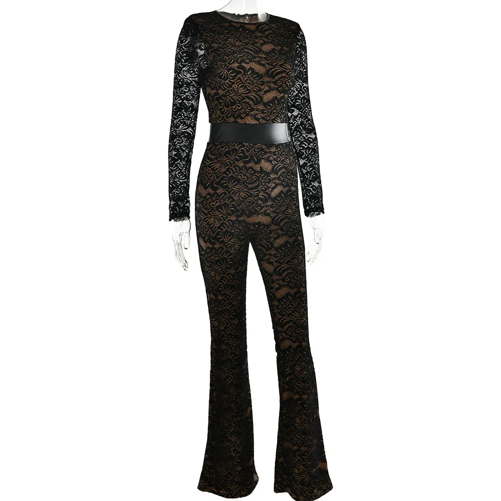 Fashion Lace Leather Patchwork Long Sleeved Jumpsuit Women's 2025 Autumn/Winter Sexy Patchwork New Elastic Tight Rompers