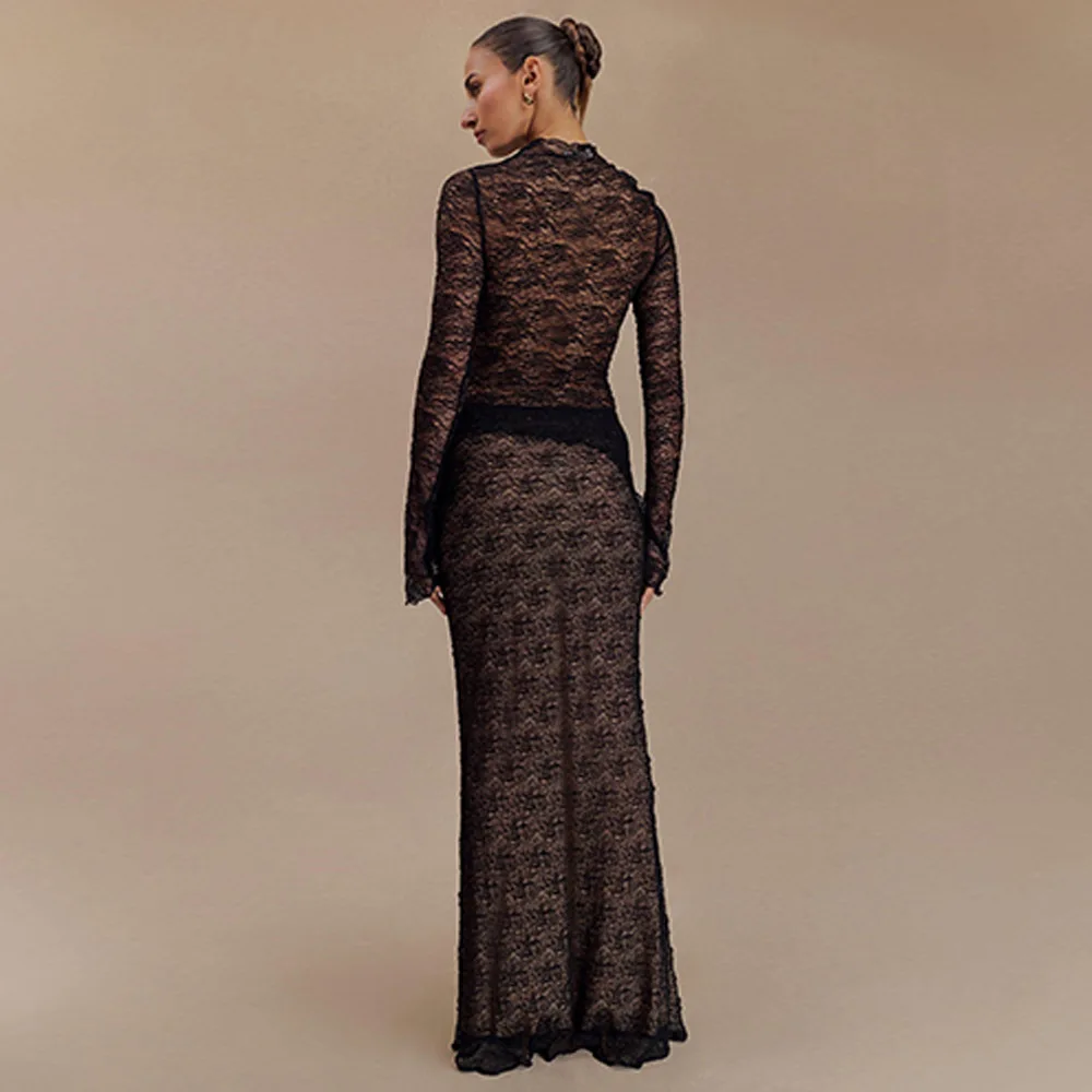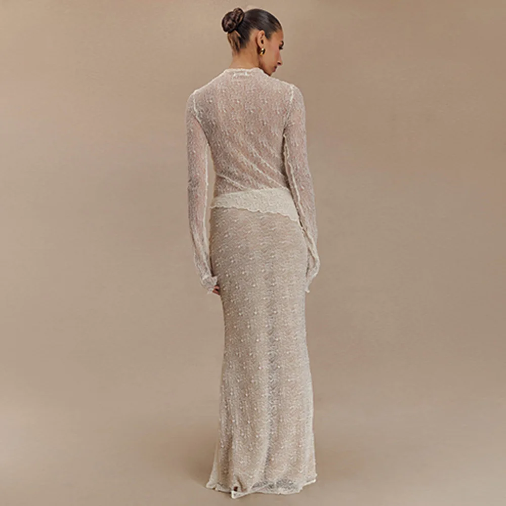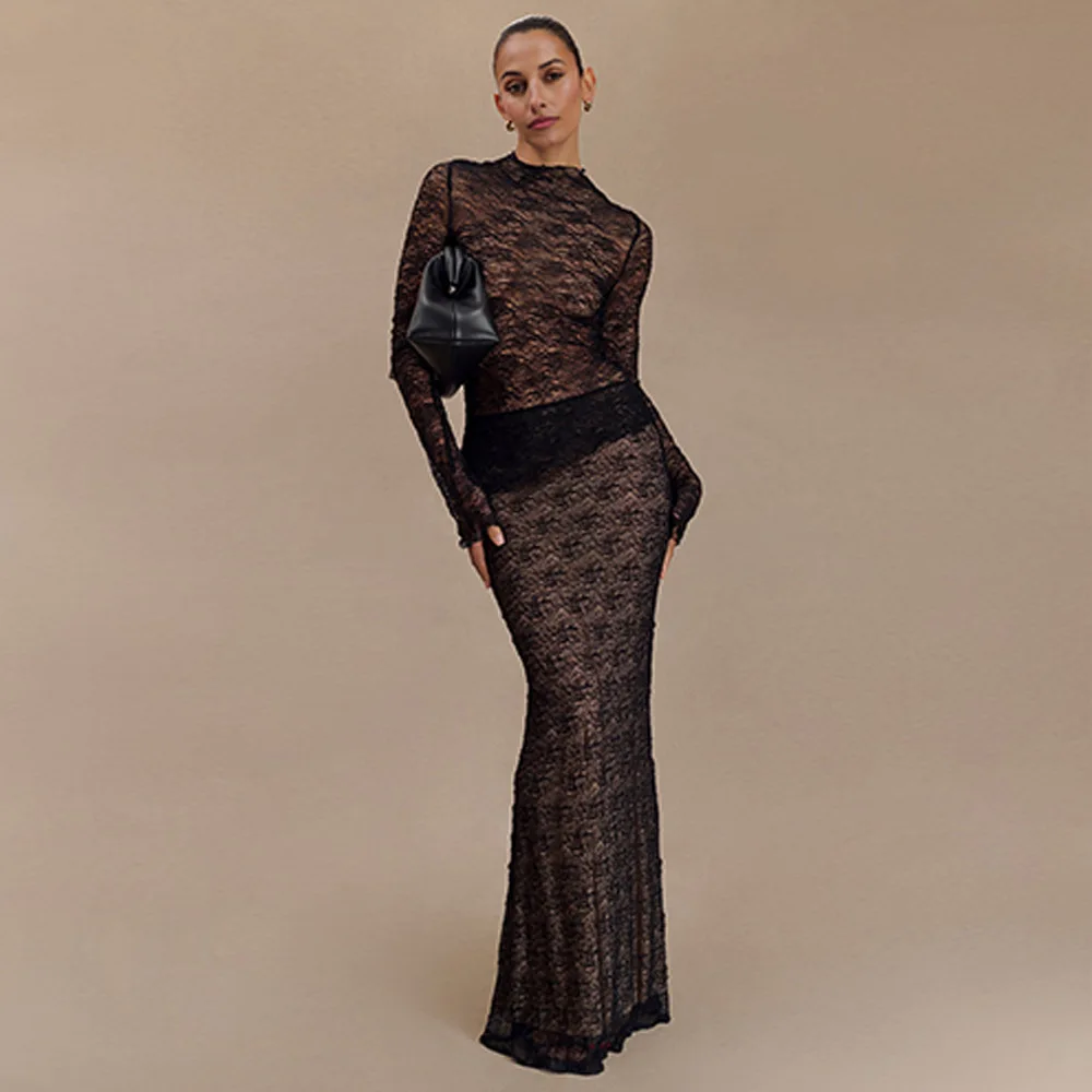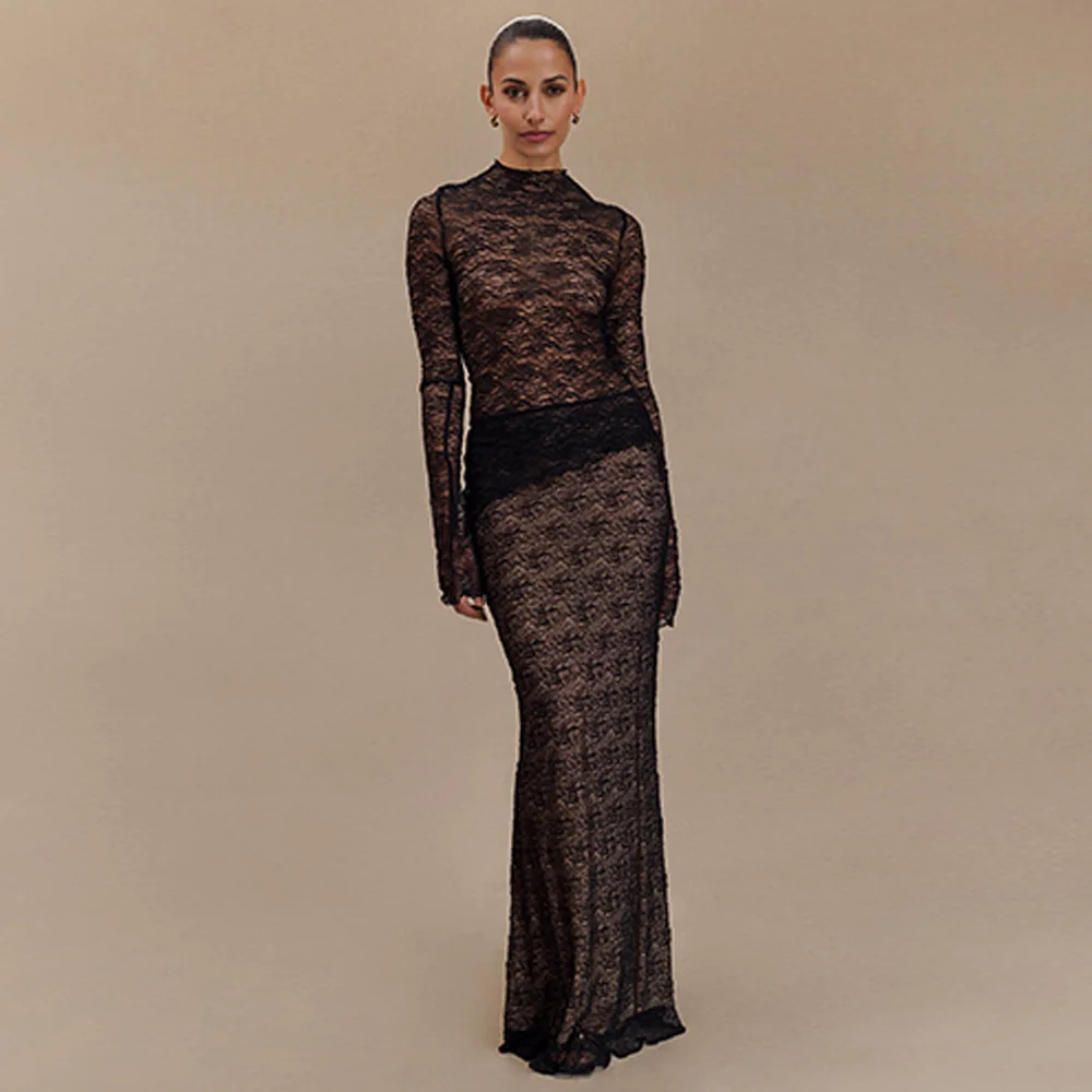 Fashion Lace Long Sleeved Round Neck Top Skirt Two-piece Set For Women 2024 Autumn Winter New Transparent T-shirt Set