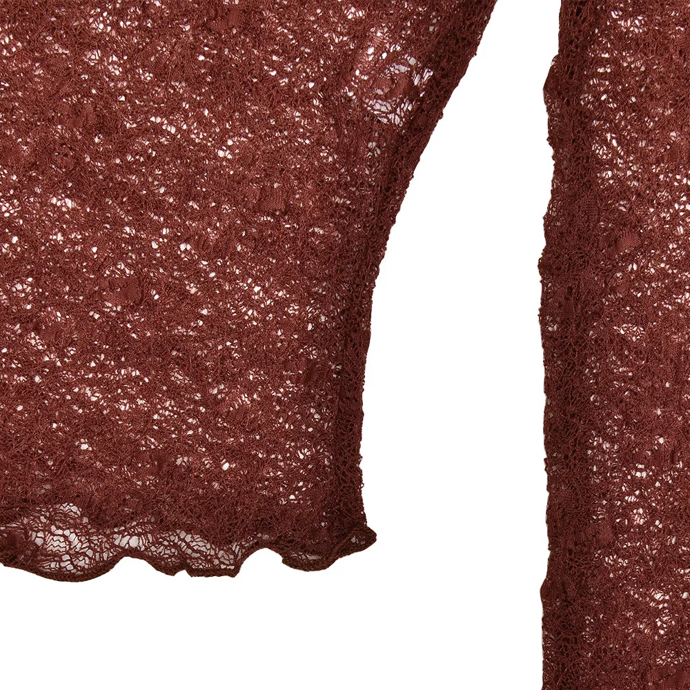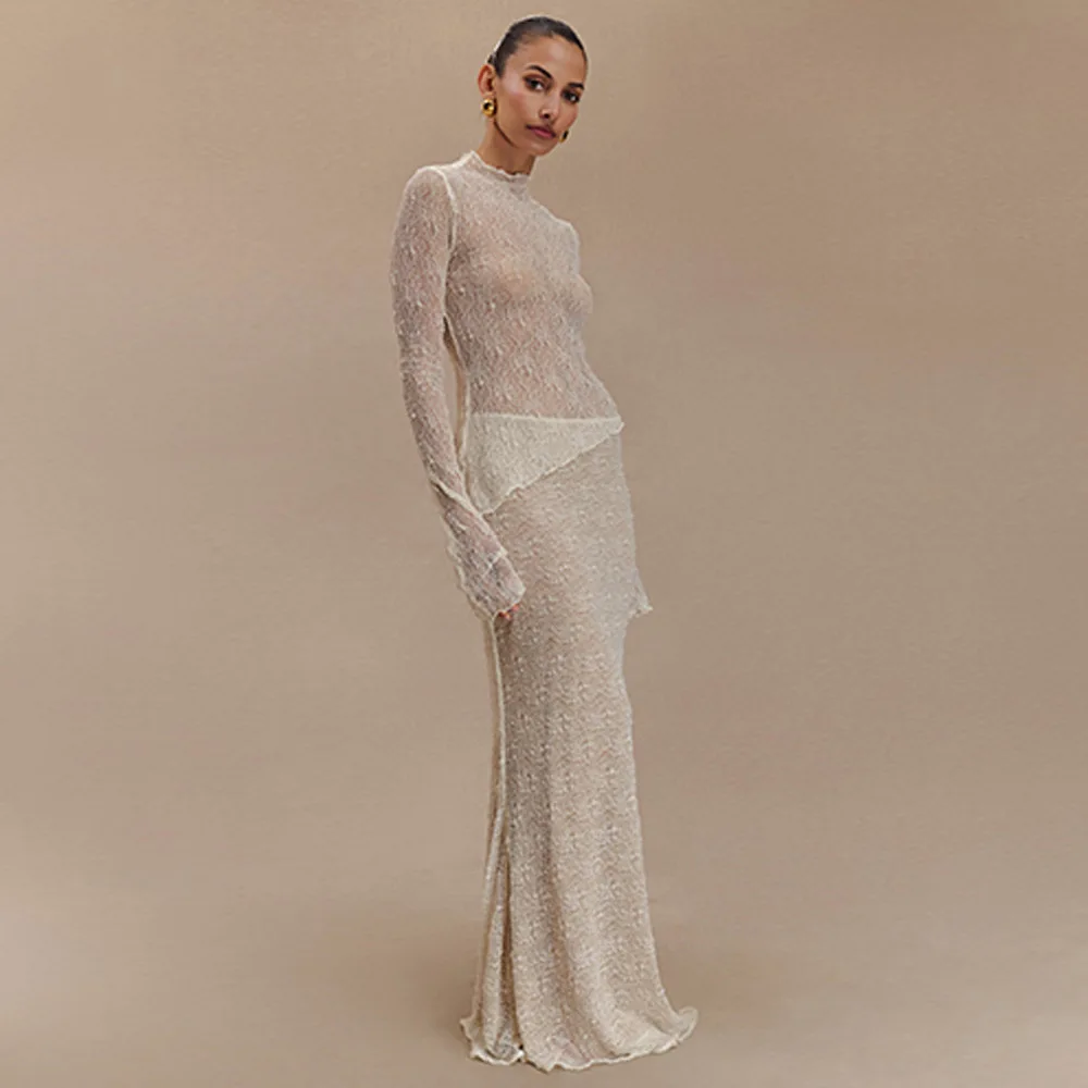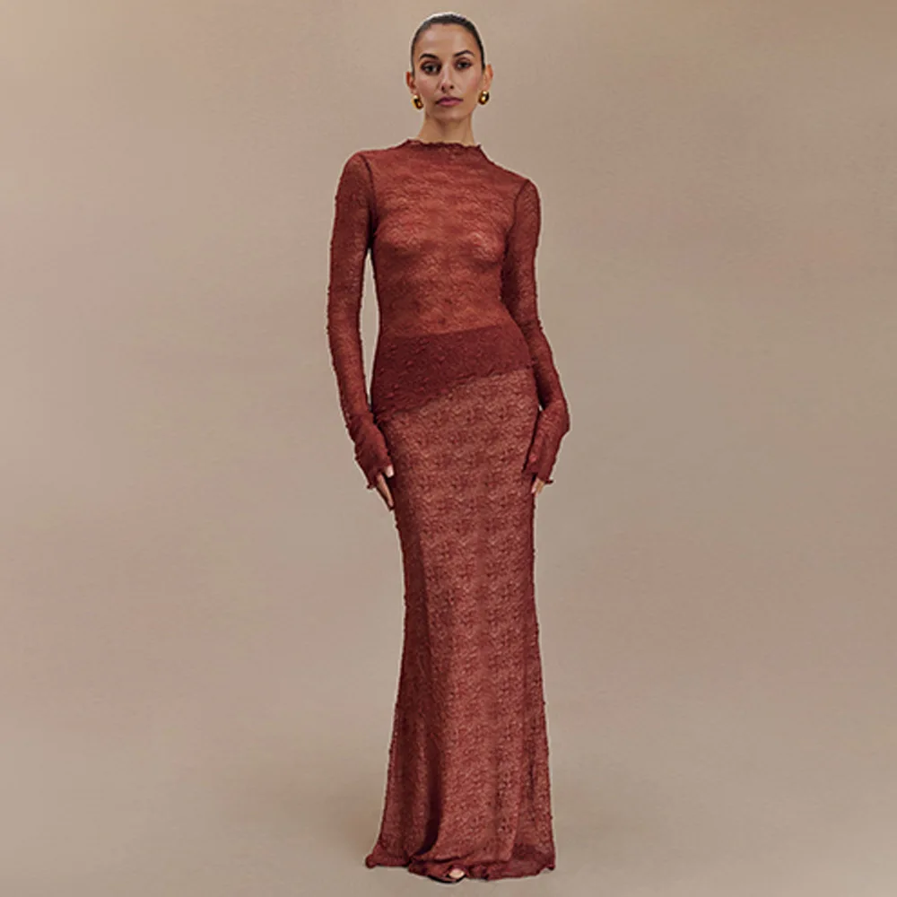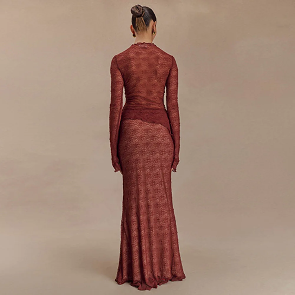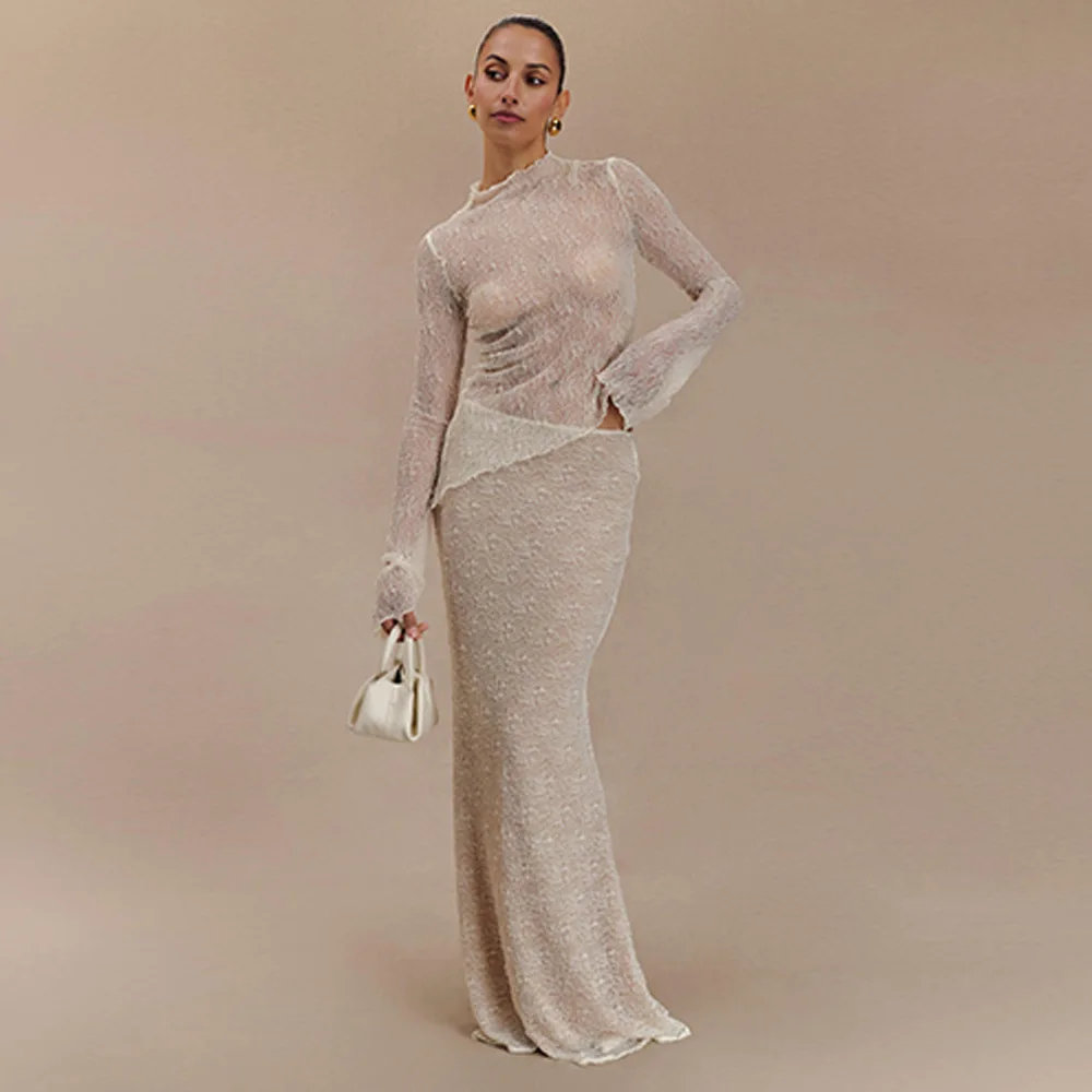 Fashion Lace Long Sleeved Round Neck Top Skirt Two-piece Set For Women 2024 Autumn Winter New Transparent T-shirt Set