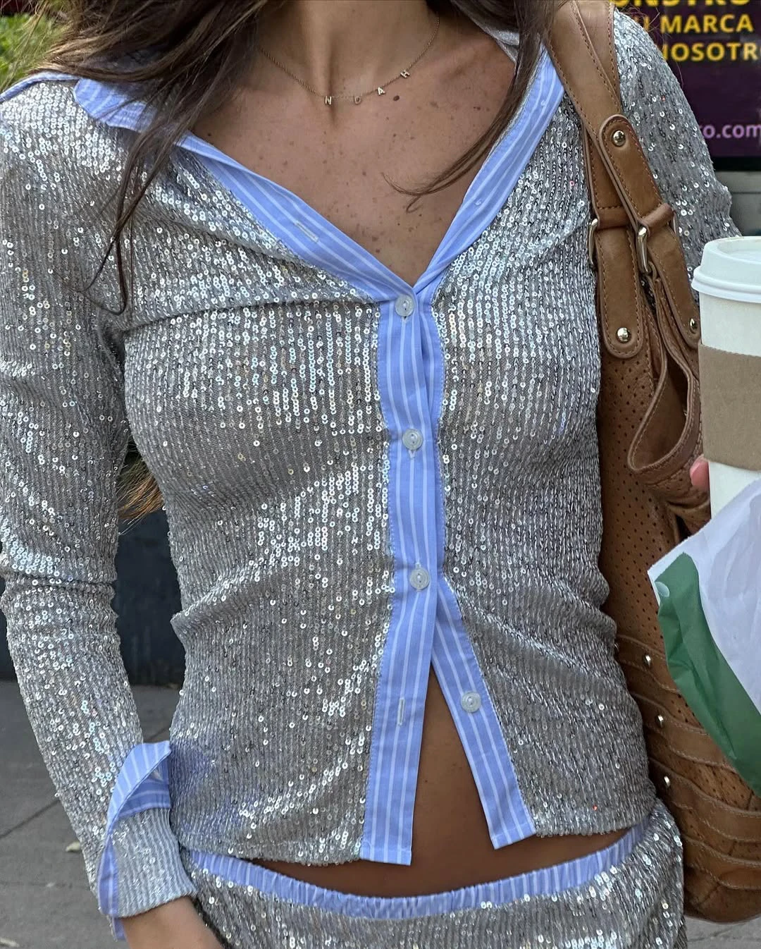 Fashion Long Sleeved Shirt Sequined Shorts Women's Set Patchwork Perspective Sexy Slim Fit Street Female Two-piece Set