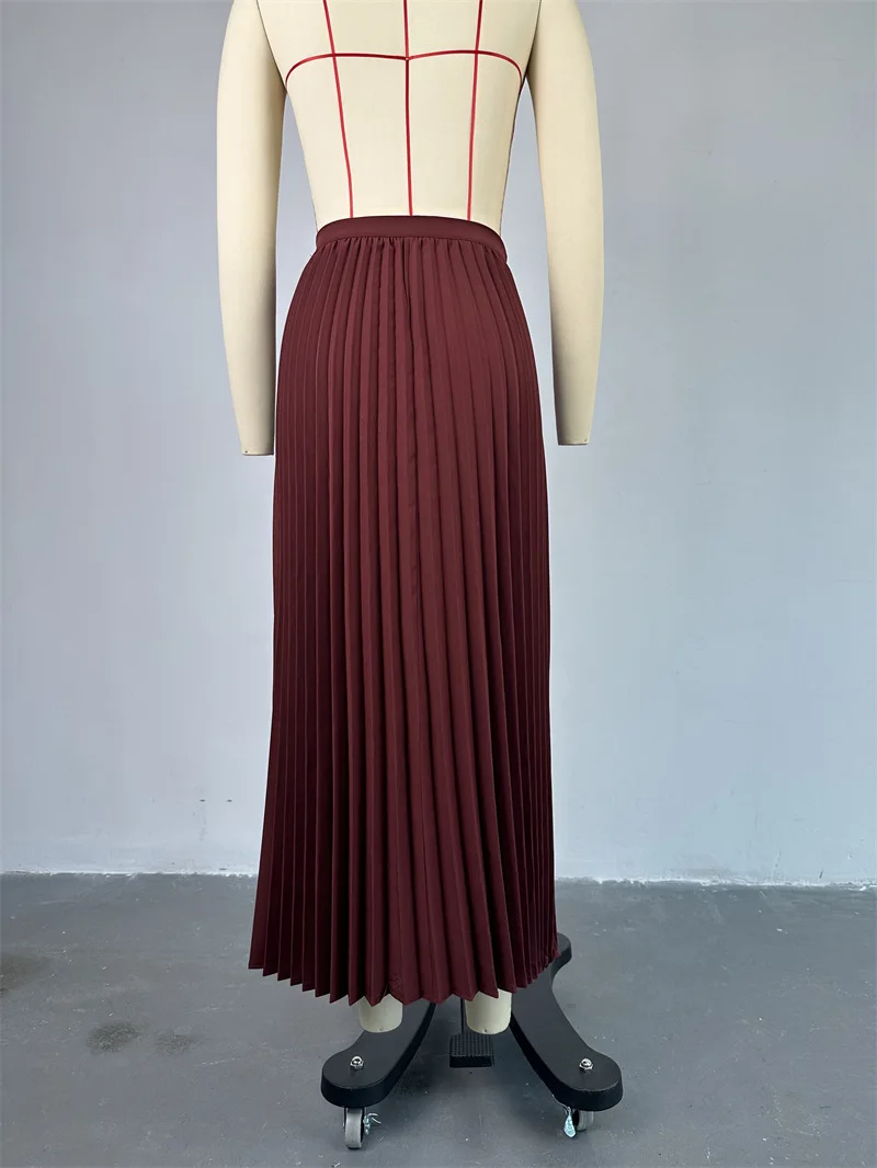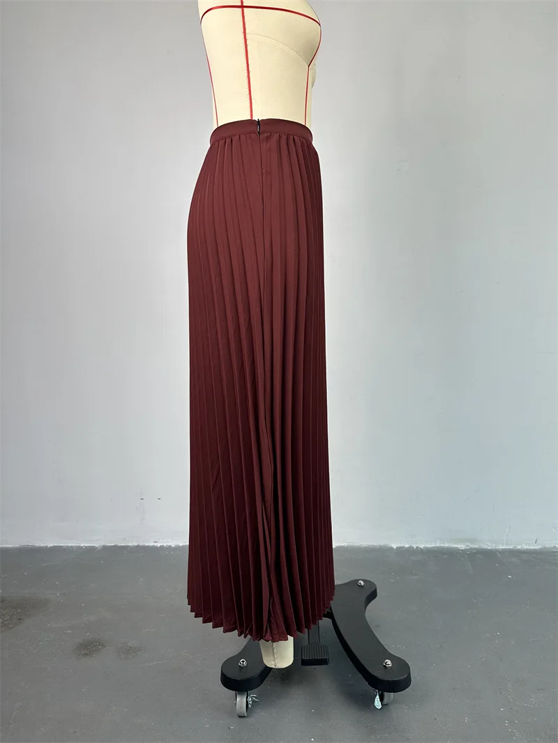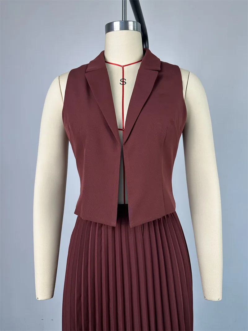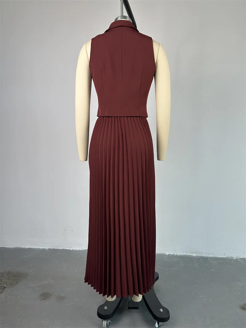 Fashion Skirt Two Piece Sets Women Notched Collar Sleeveless Crop Tops And Midi Skirt Femme Elegant Pleated Skirt Sets