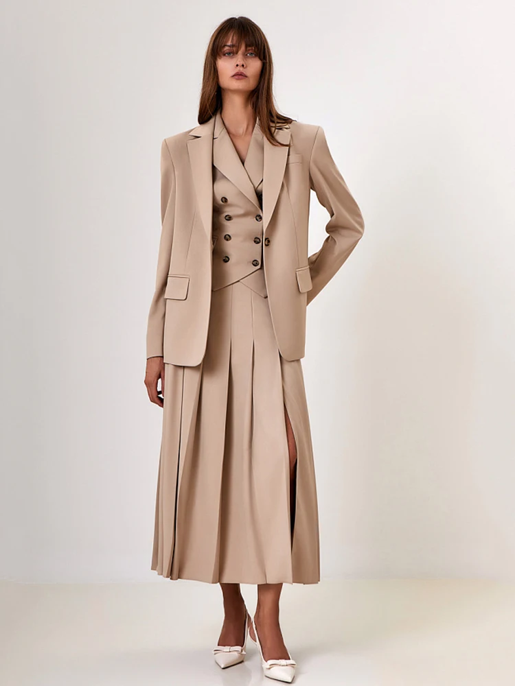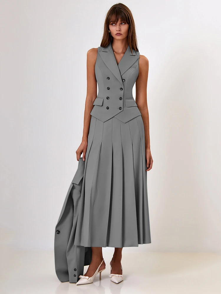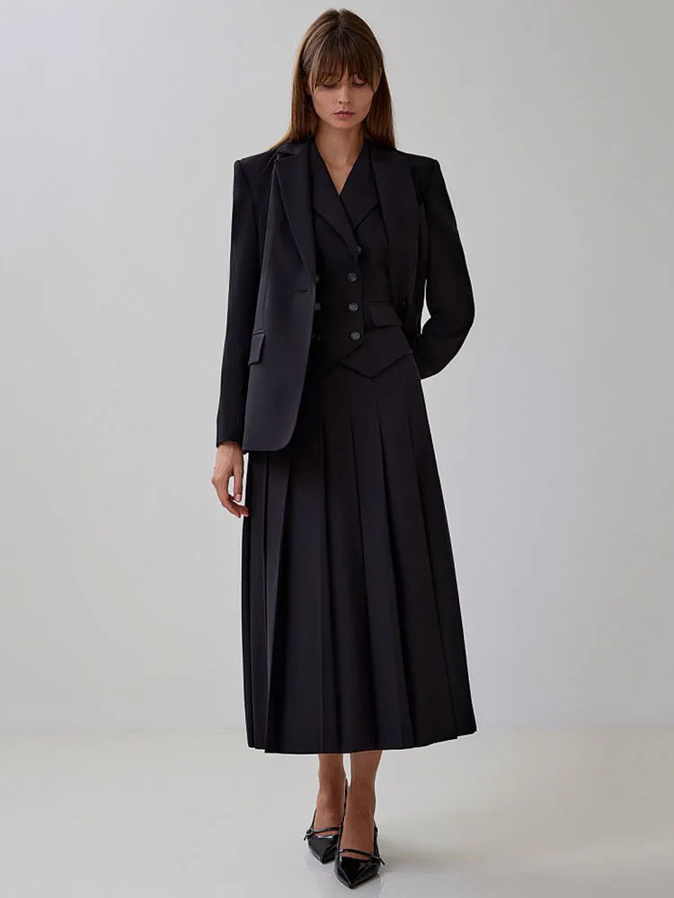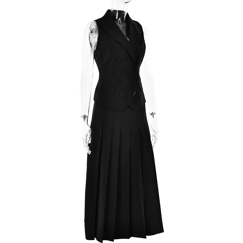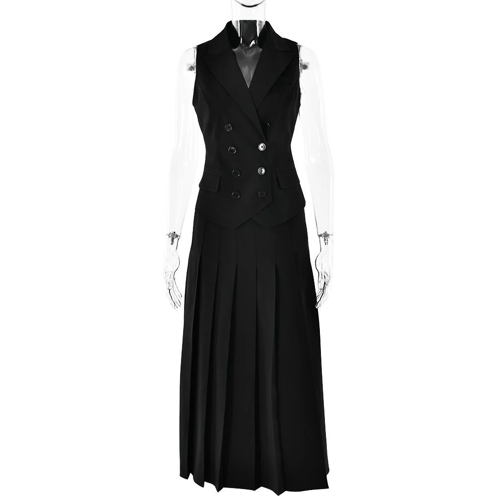 Fashion Slim Button Vest Long Skirt Women Two-piece Set Tight Vest Pleated Skirt Set Elegant Streetwear 2024 Autumn Set