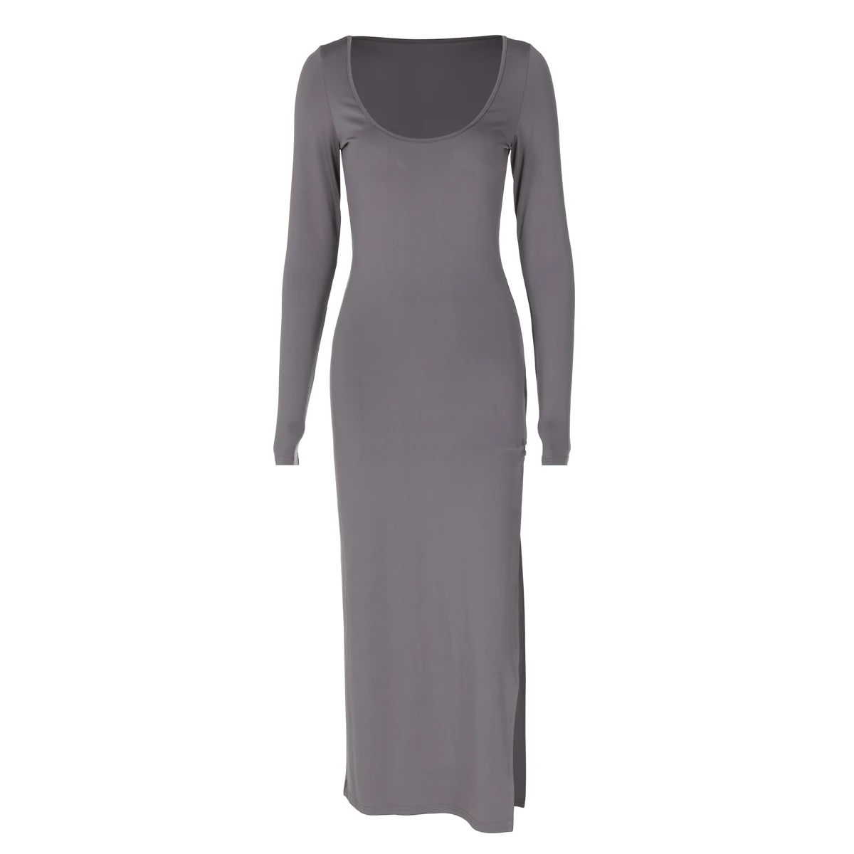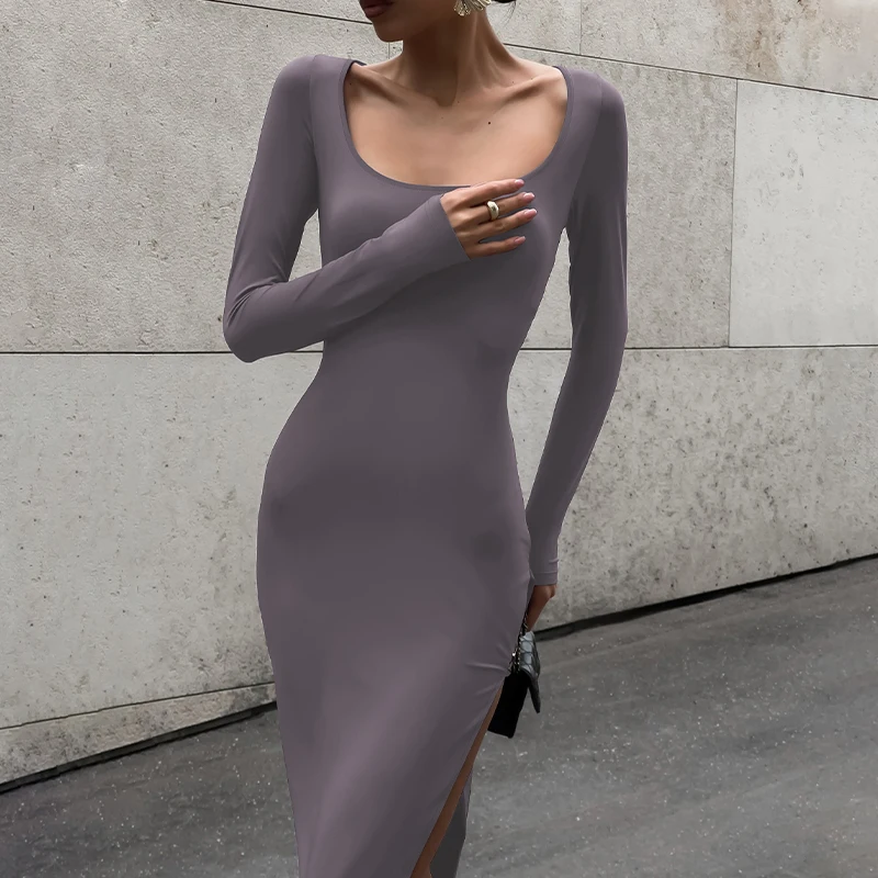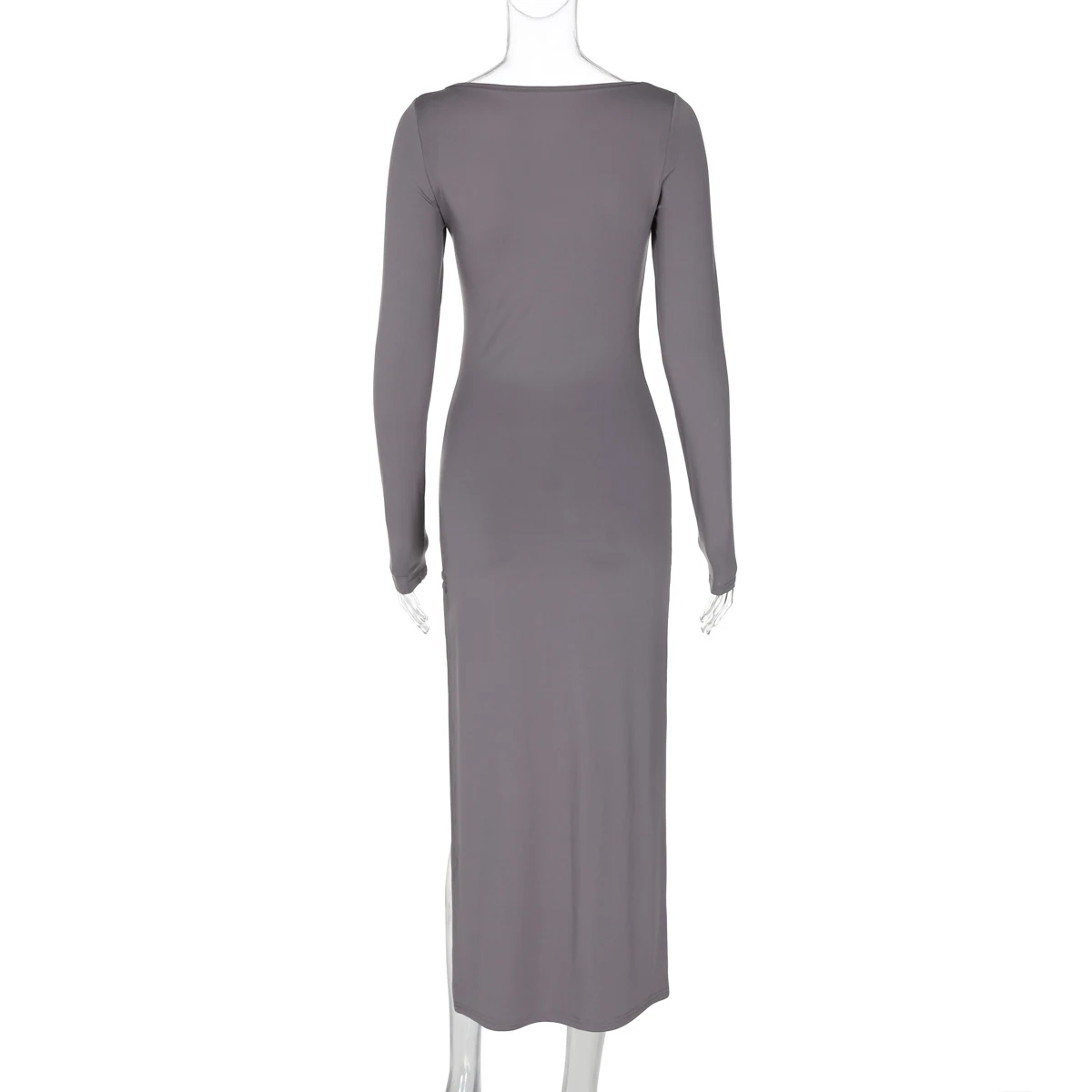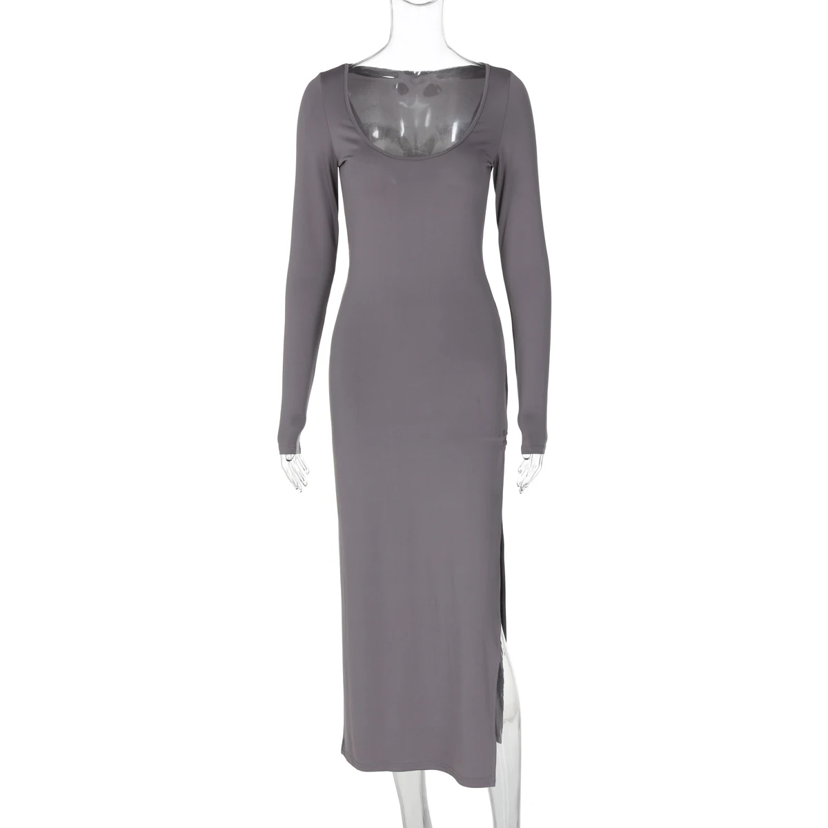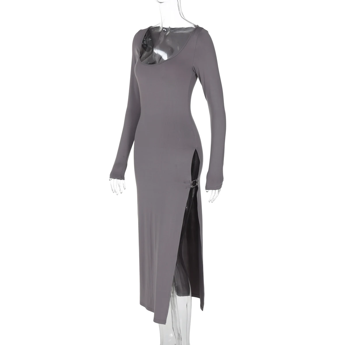 Fashion Solid Square Collar Straps Slit Sexy Bodycon Maxi Dress Fall Women Y2K Outfits Birthday Party Vacation