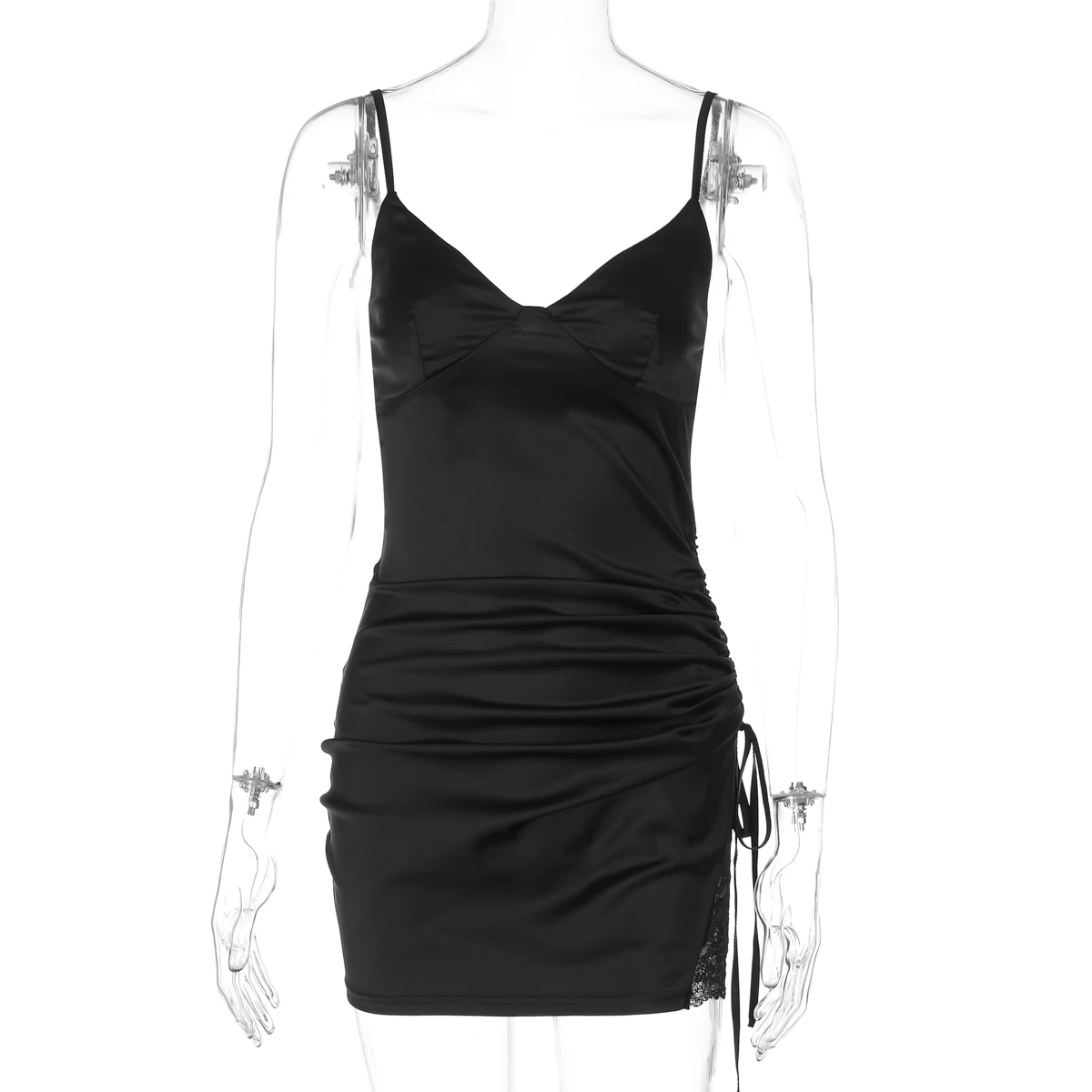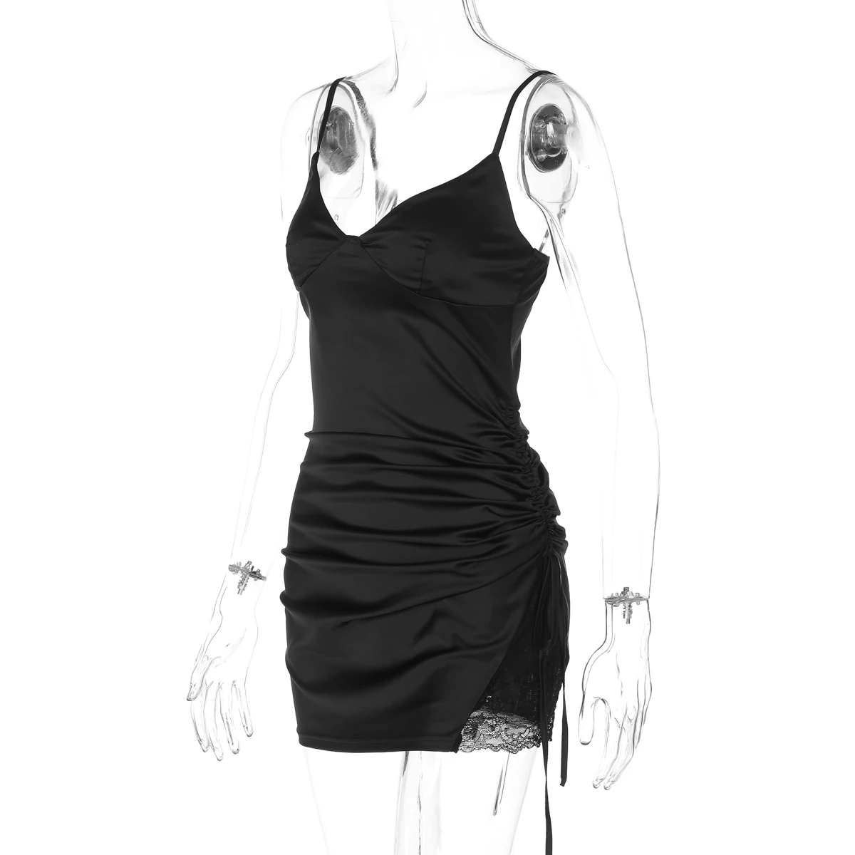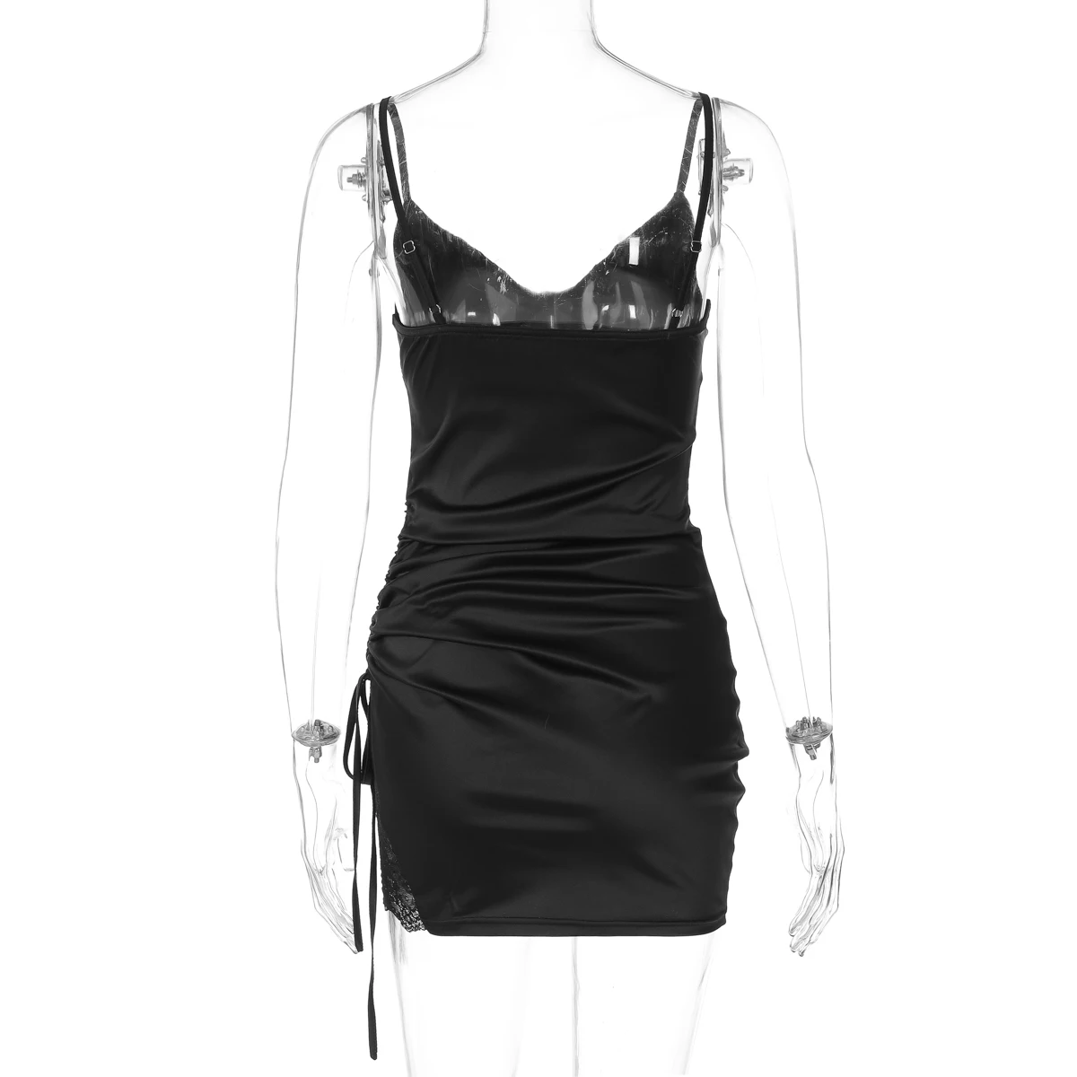 Fashion Solid V Neck Slips Backless Shirring Patchwork Lace Sexy Slim Mini Dress Summer Women Outfits Party Night Club