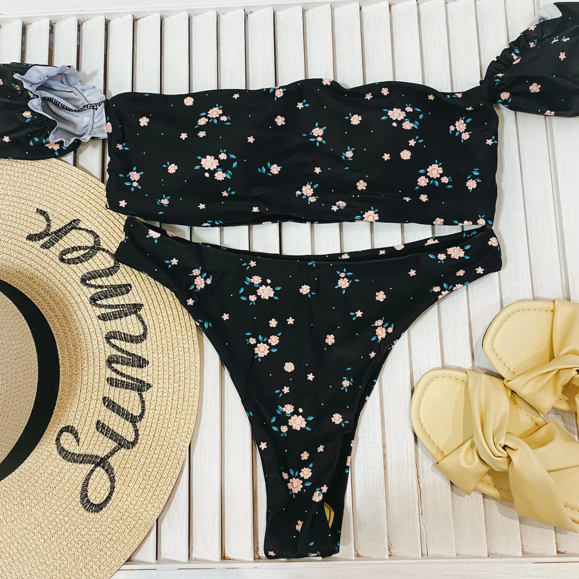 Floral Off Shoulder Bikini Female Swimsuit Women Swimwear Two-pieces Bikini set Mid Waist Bather Bathing Suit Swim V1671
