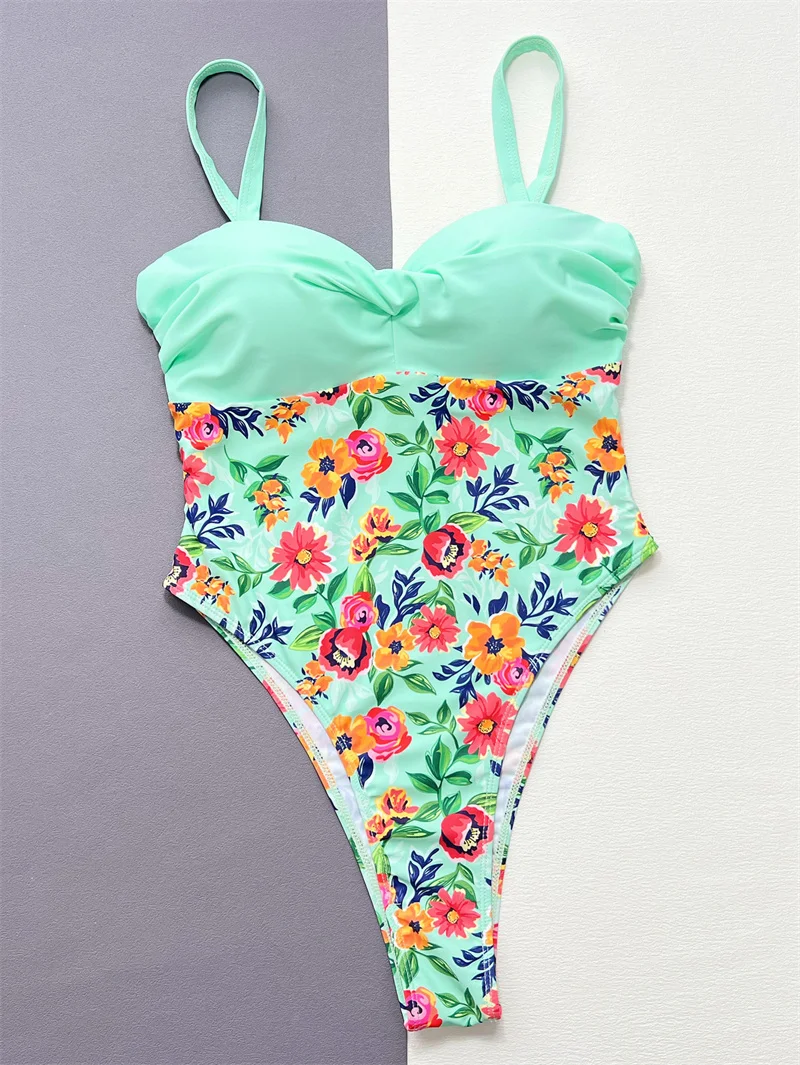Floral One Piece Swimsuit 2025 Swimwear for Women Sexy Flower Print Bandeau Bathing Suit High Waist Monokini