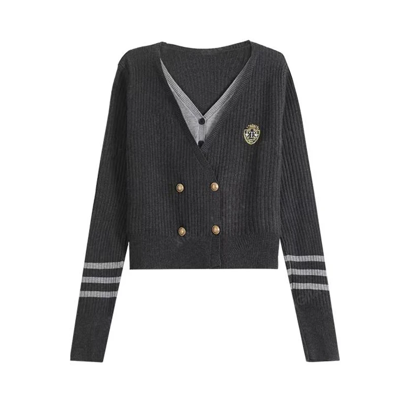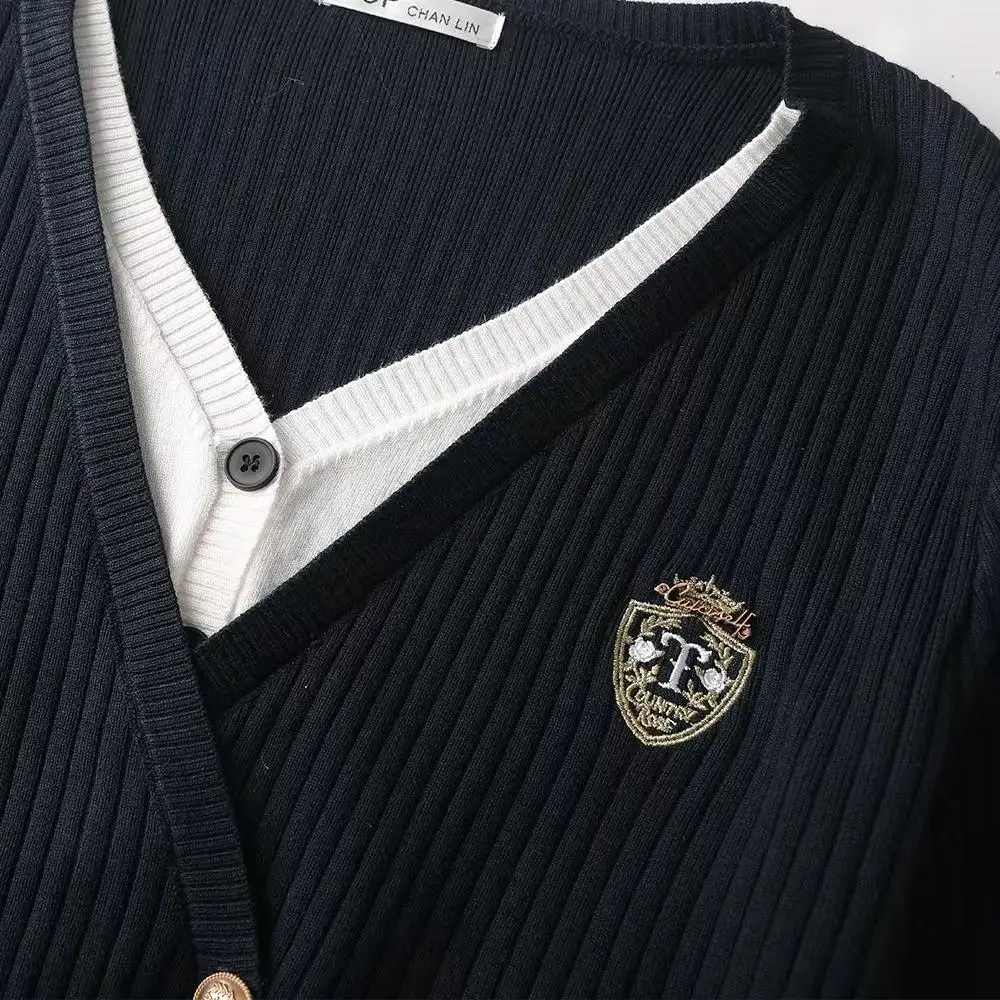 French Fashion 2024 New Patchwork Elegant Long Sleeved Sweater Autumn Winter Women's V Neck Double Breasted Cardigan Knitted Top