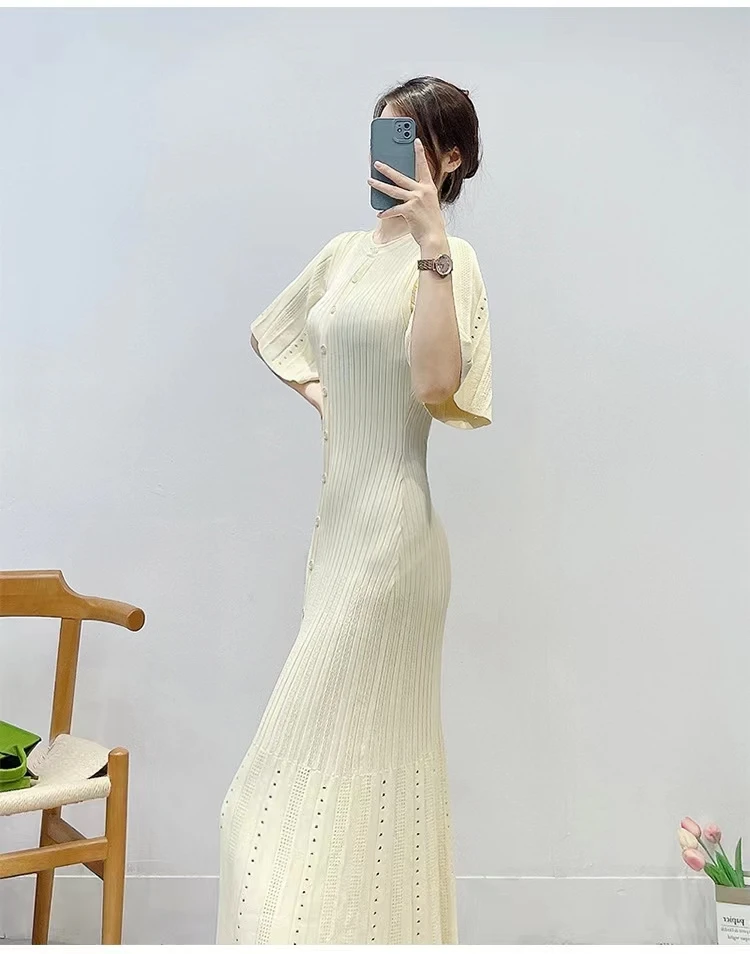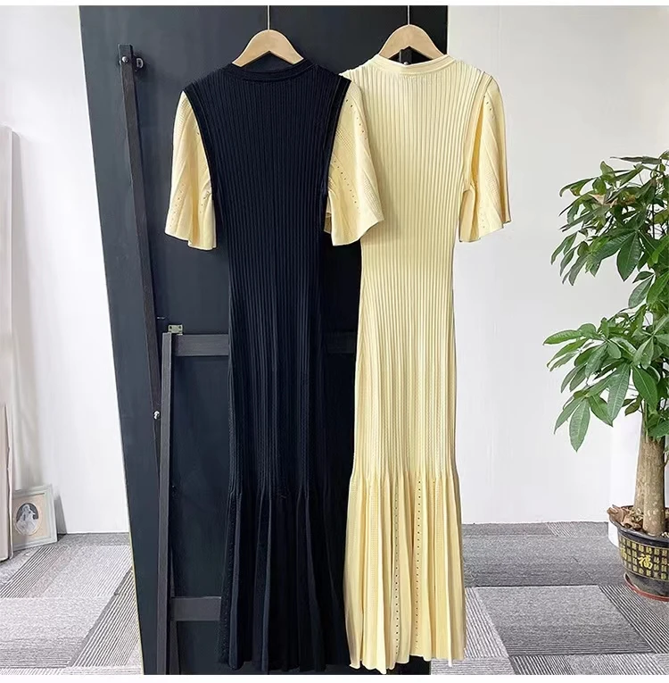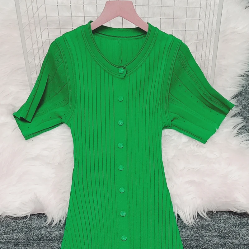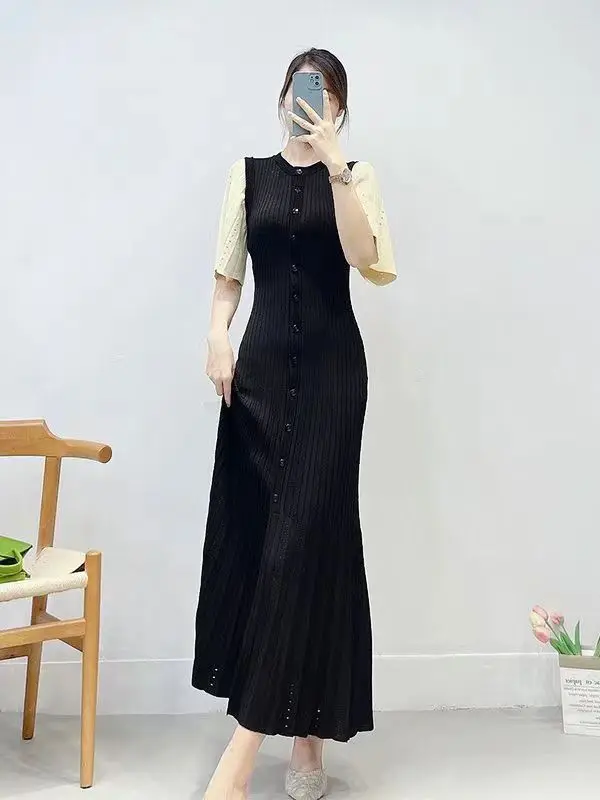 French Fashion Women Black Patchwork Single Breasted Elegant Knit Dress Autumn Beige Green Long Sleeve Slim Split Dresses Ladies