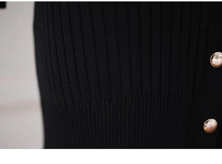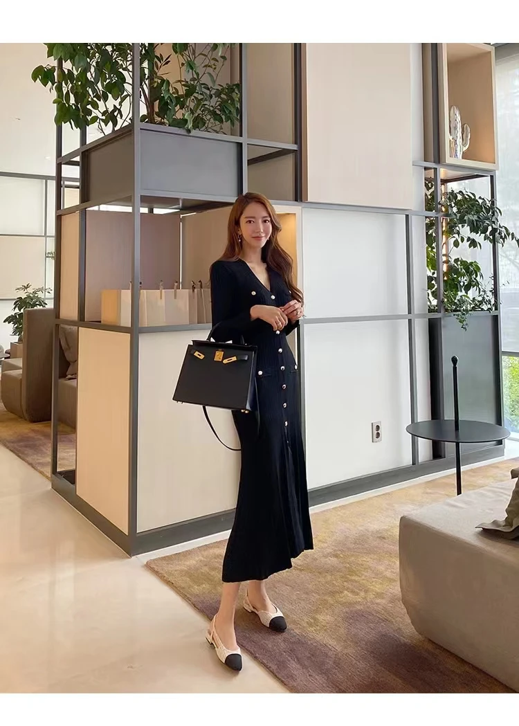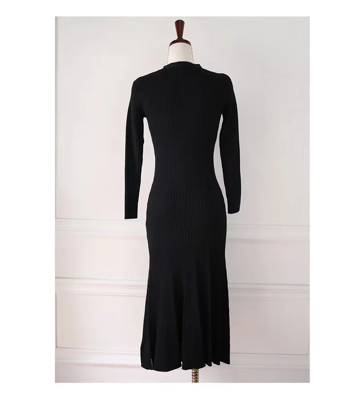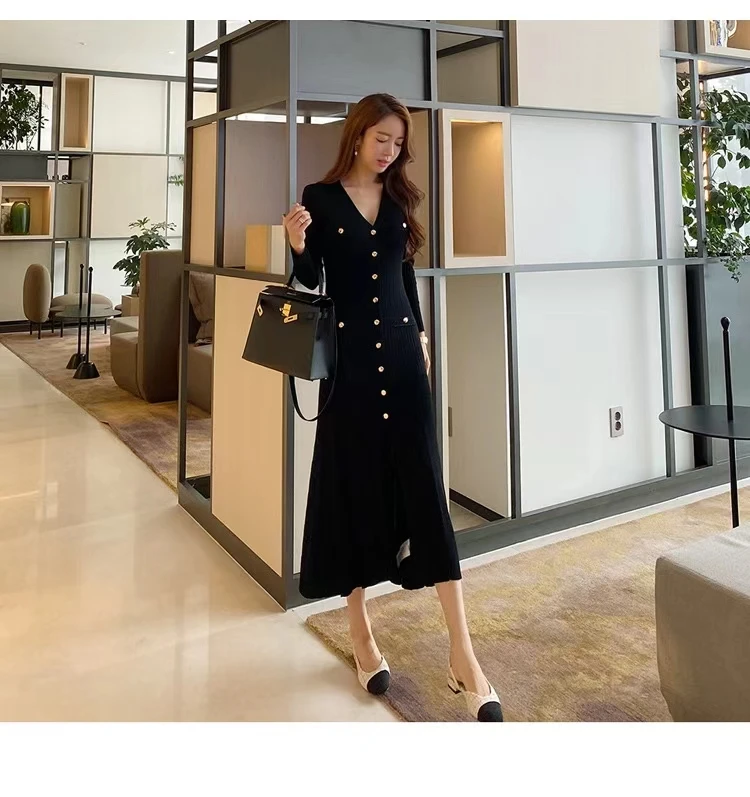 French Fashion Women Black Single Breasted Elegant V Neck Festival Knit Dress Autumn Long Sleeve Slim Fishtail Dress Ladies Chic