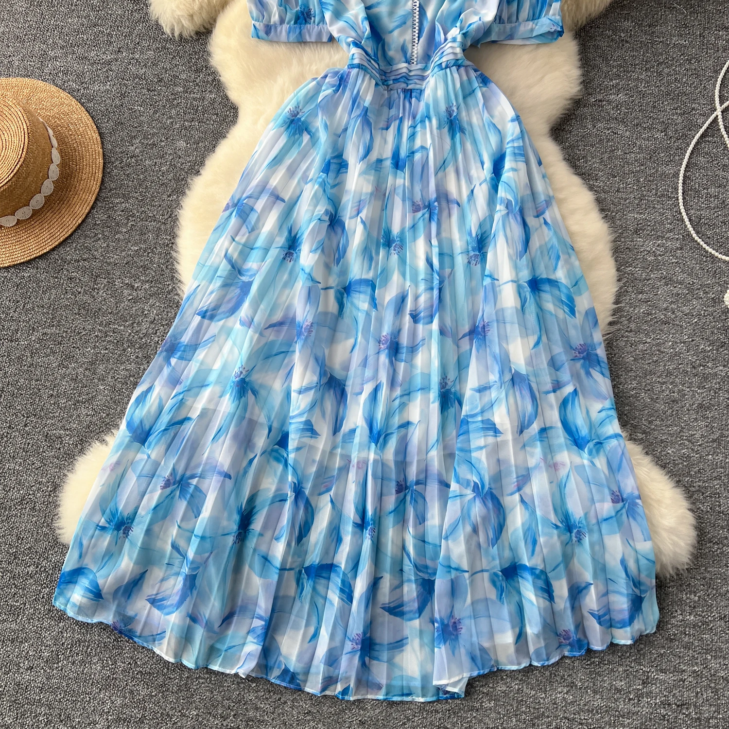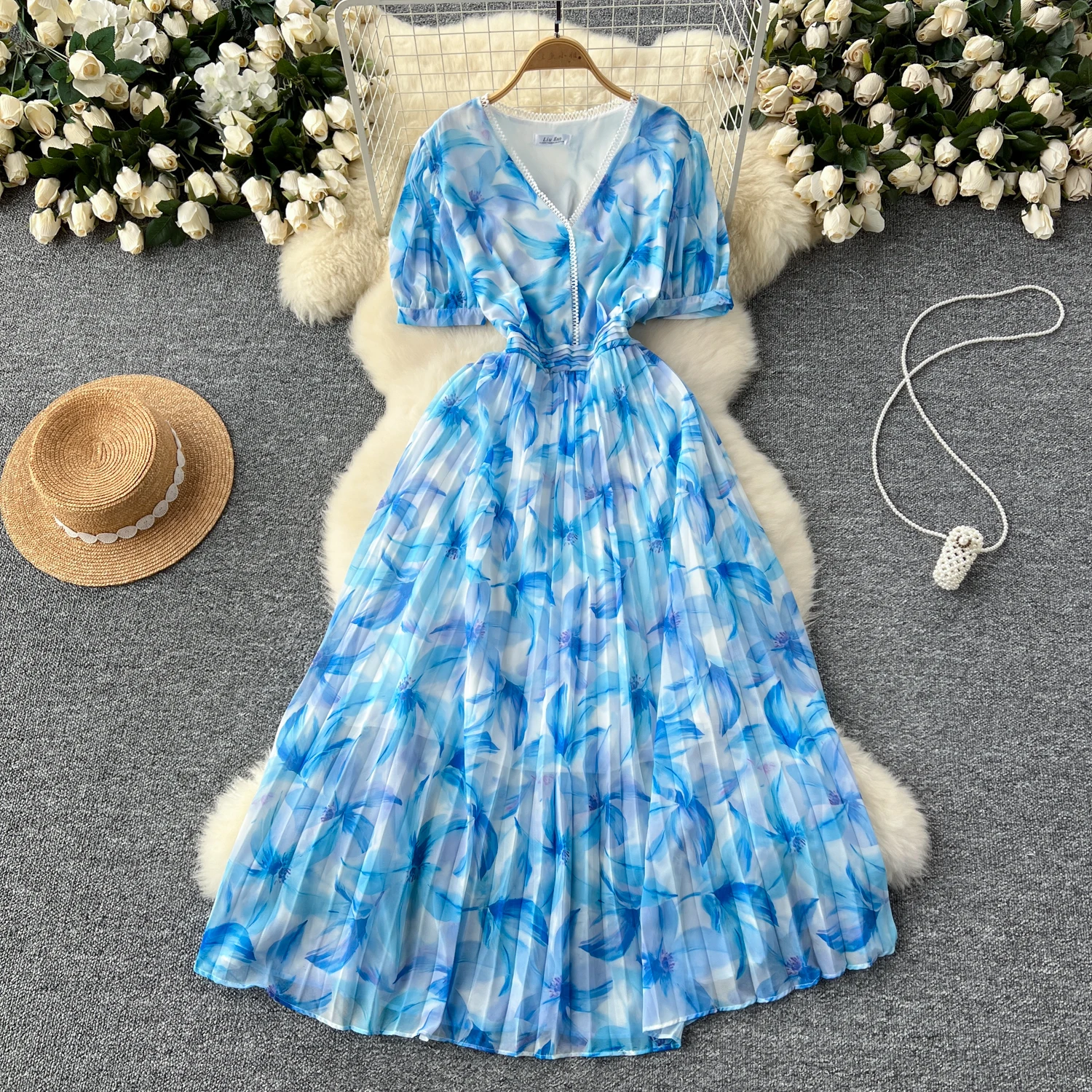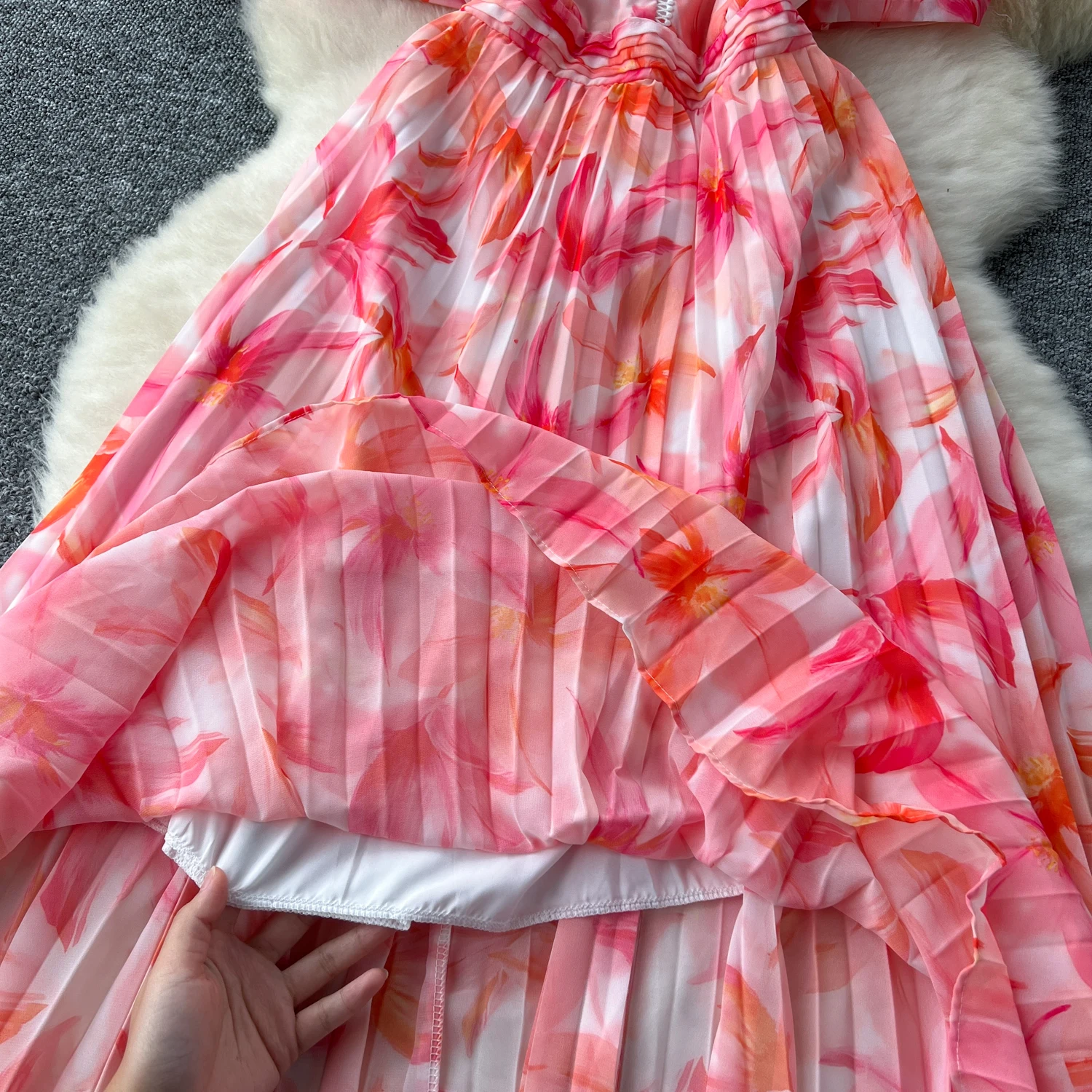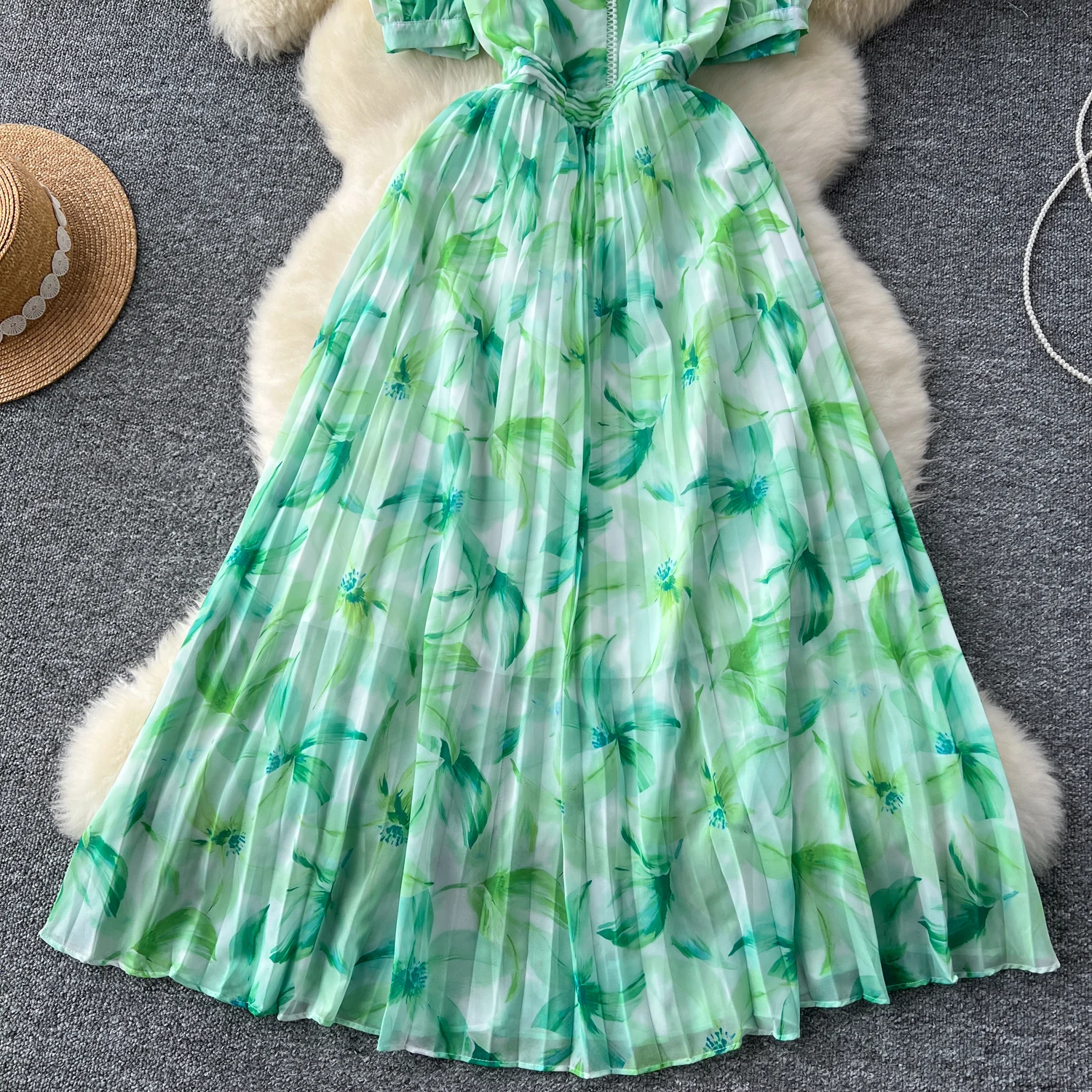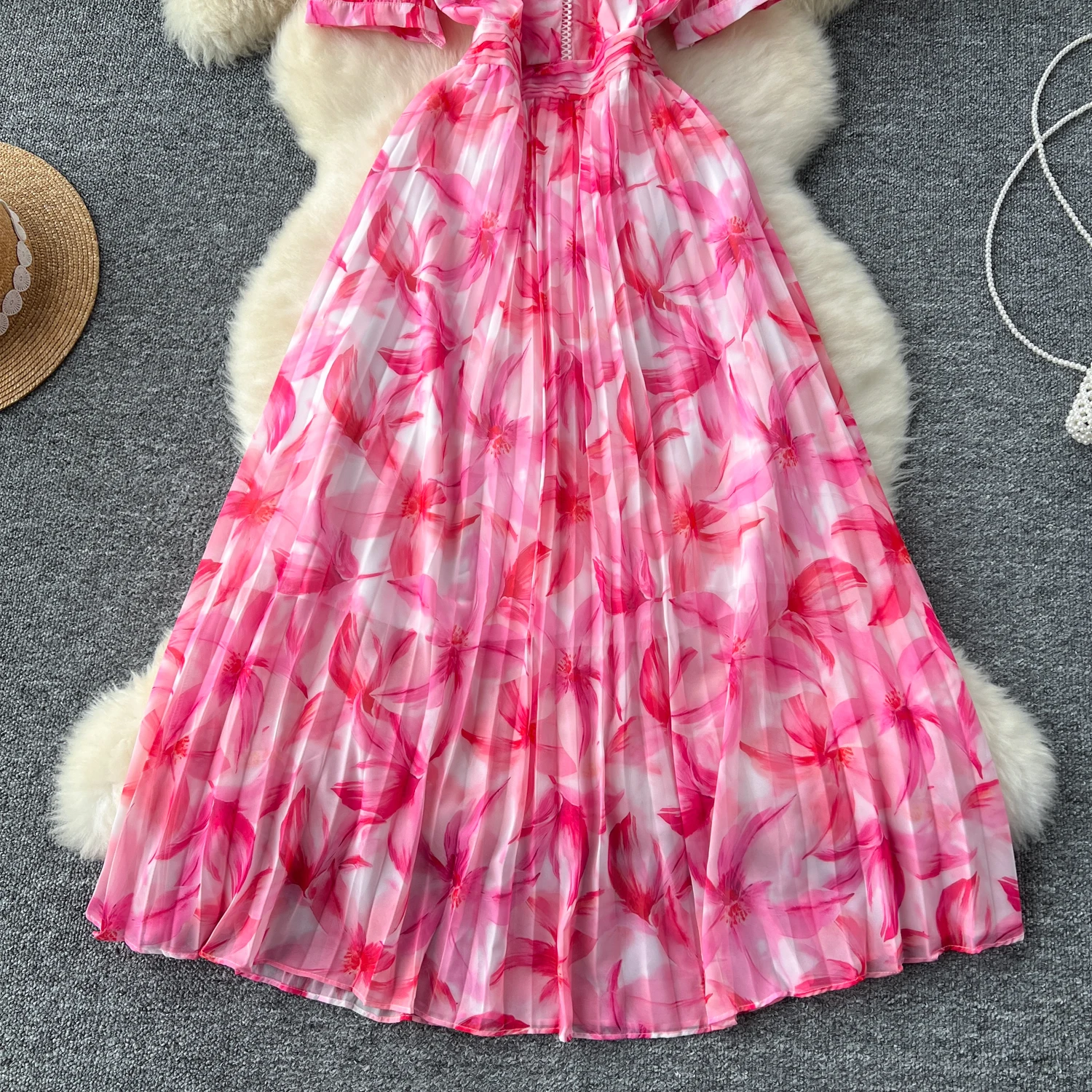 French Retro Romantic Women's Elegant Print V-neck Short Sleeved Pleated Long Dress Summer Vacation Party Evening Dress Bohemian
