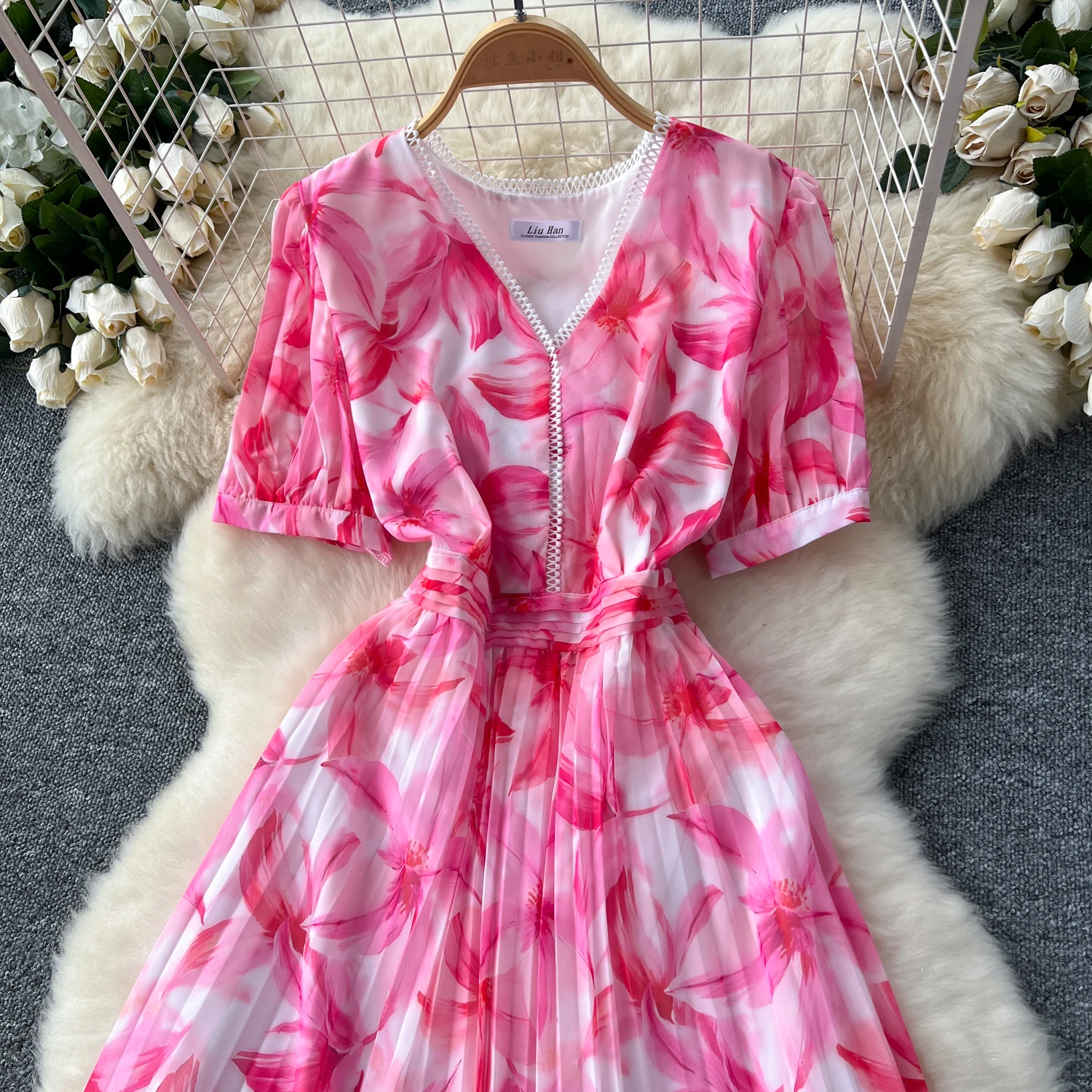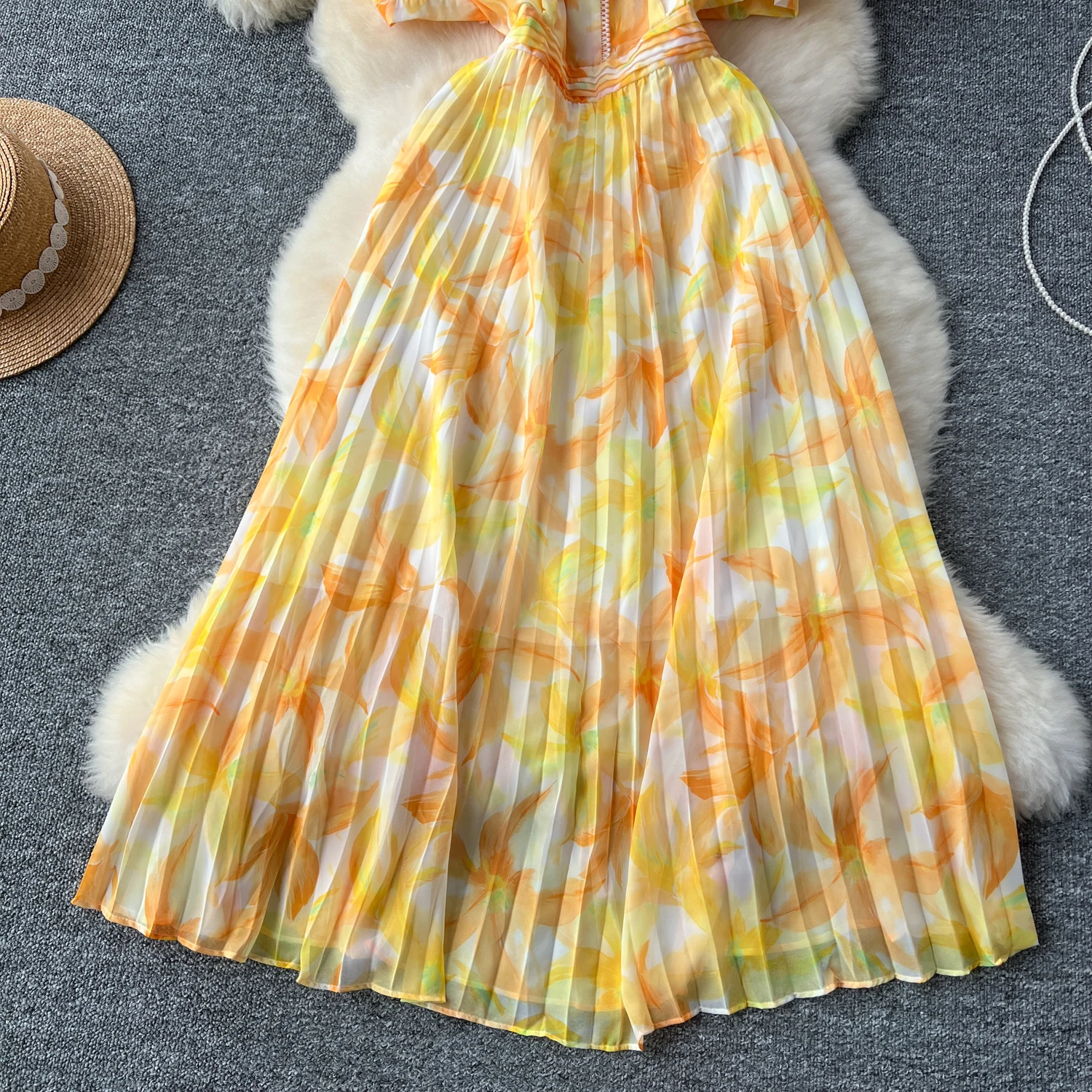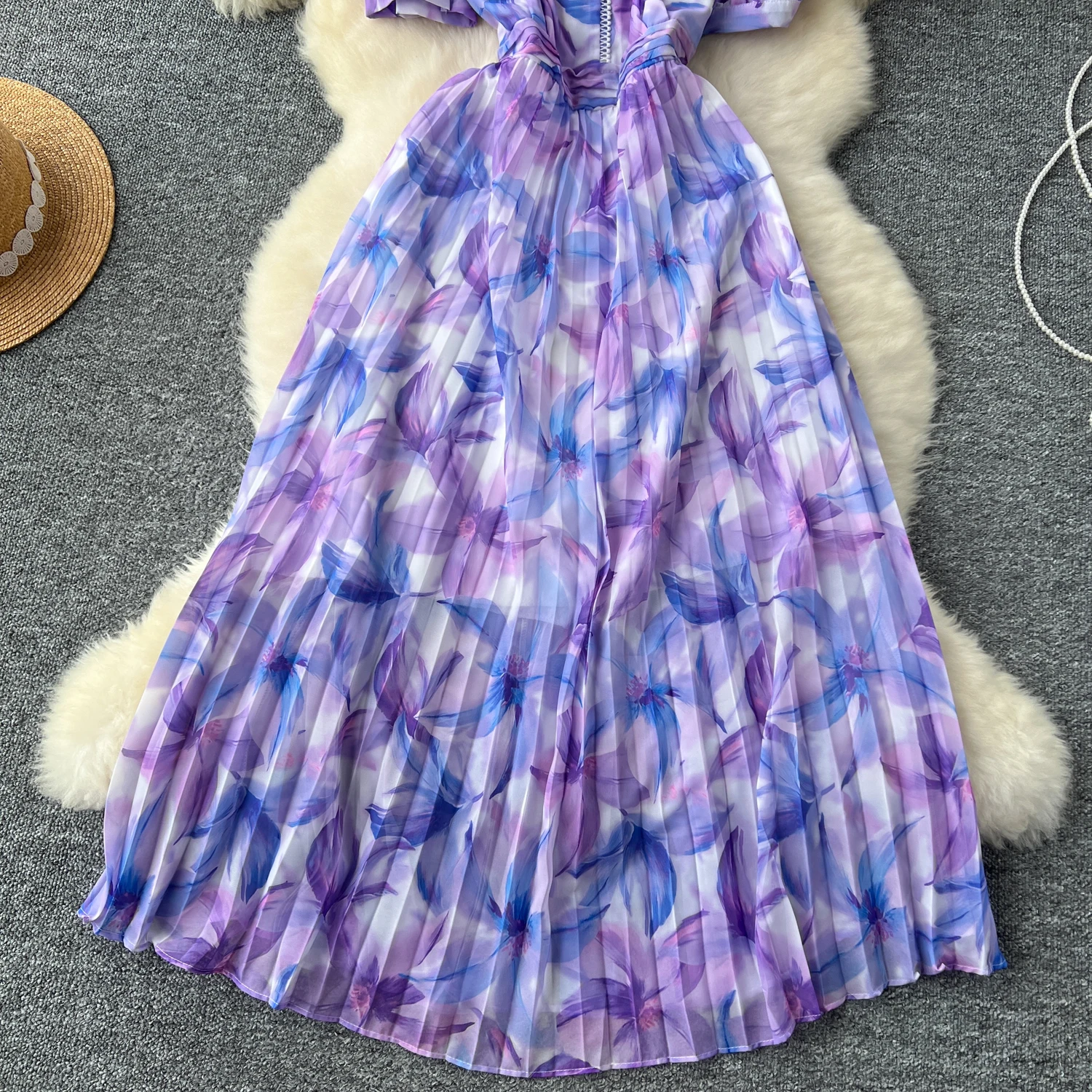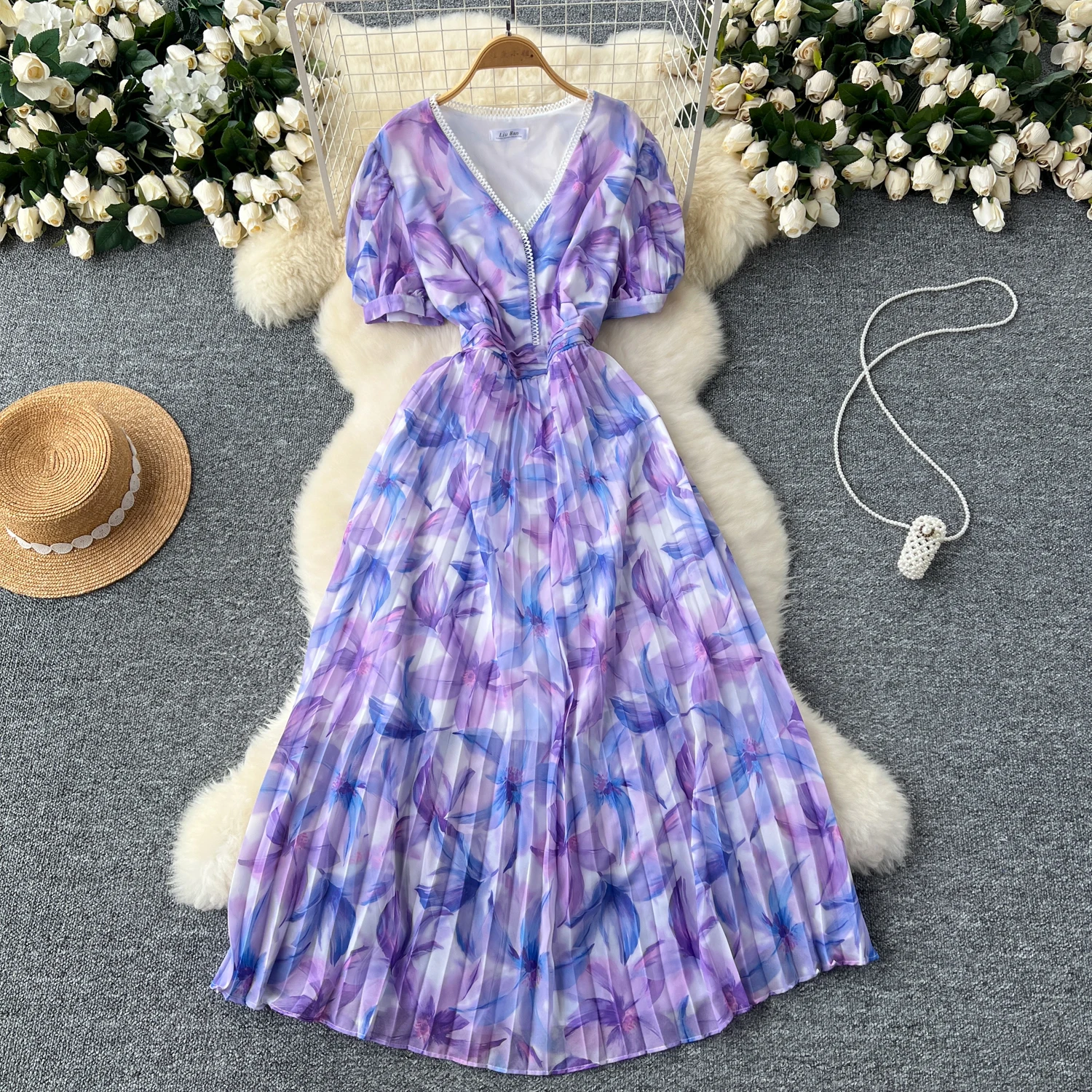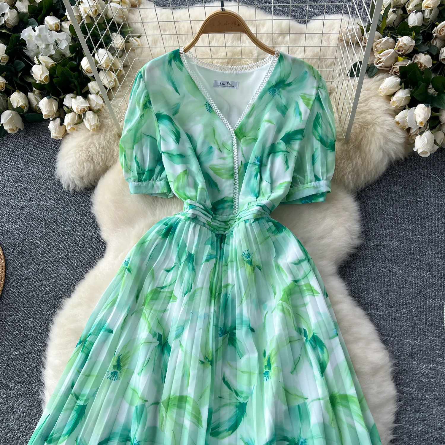 French Retro Romantic Women's Elegant Print V-neck Short Sleeved Pleated Long Dress Summer Vacation Party Evening Dress Bohemian