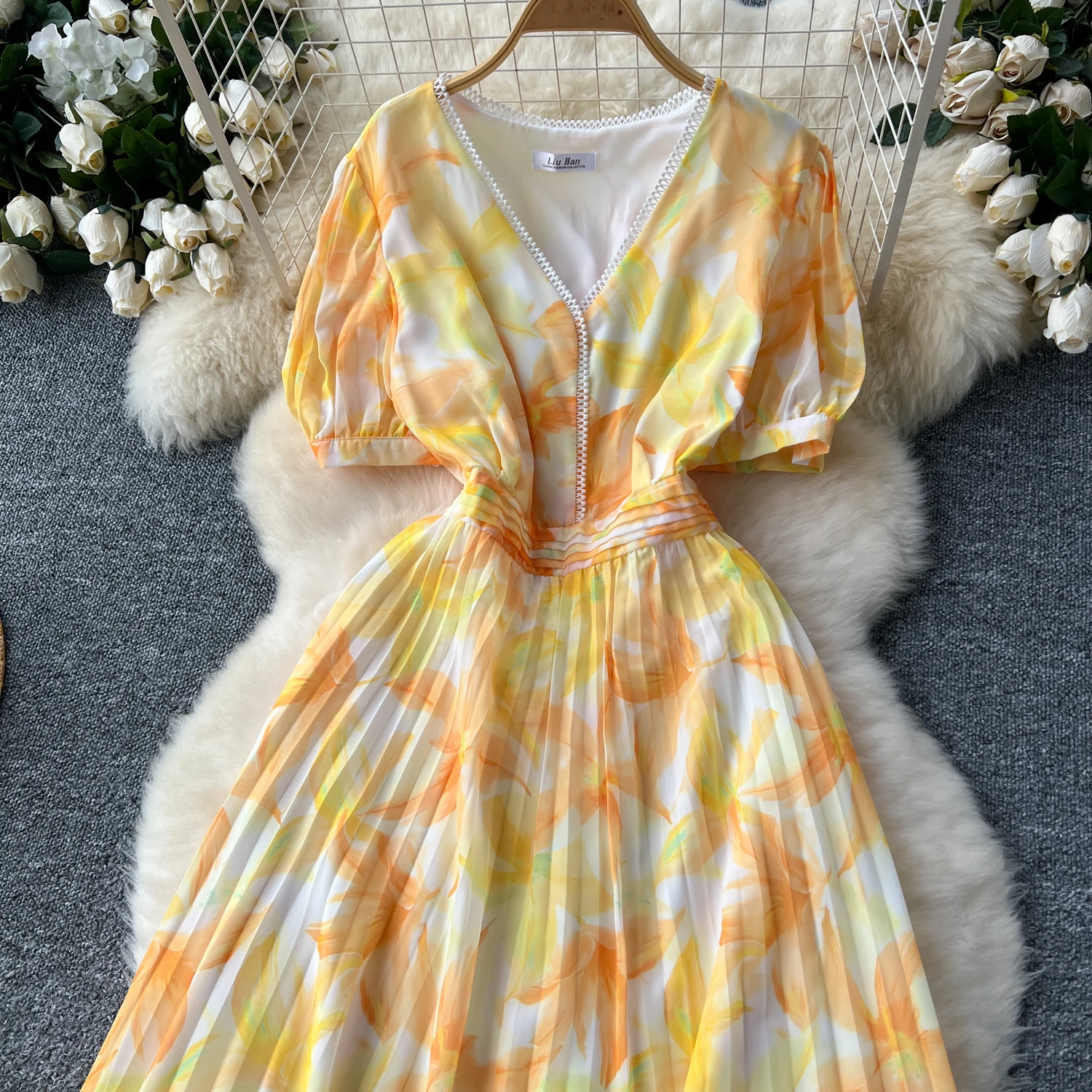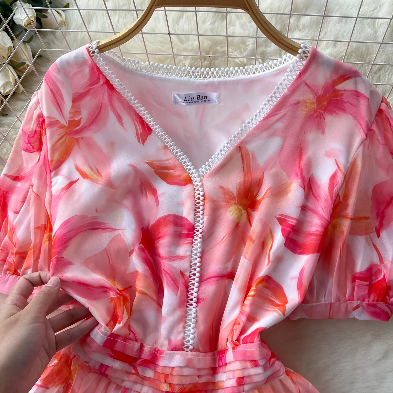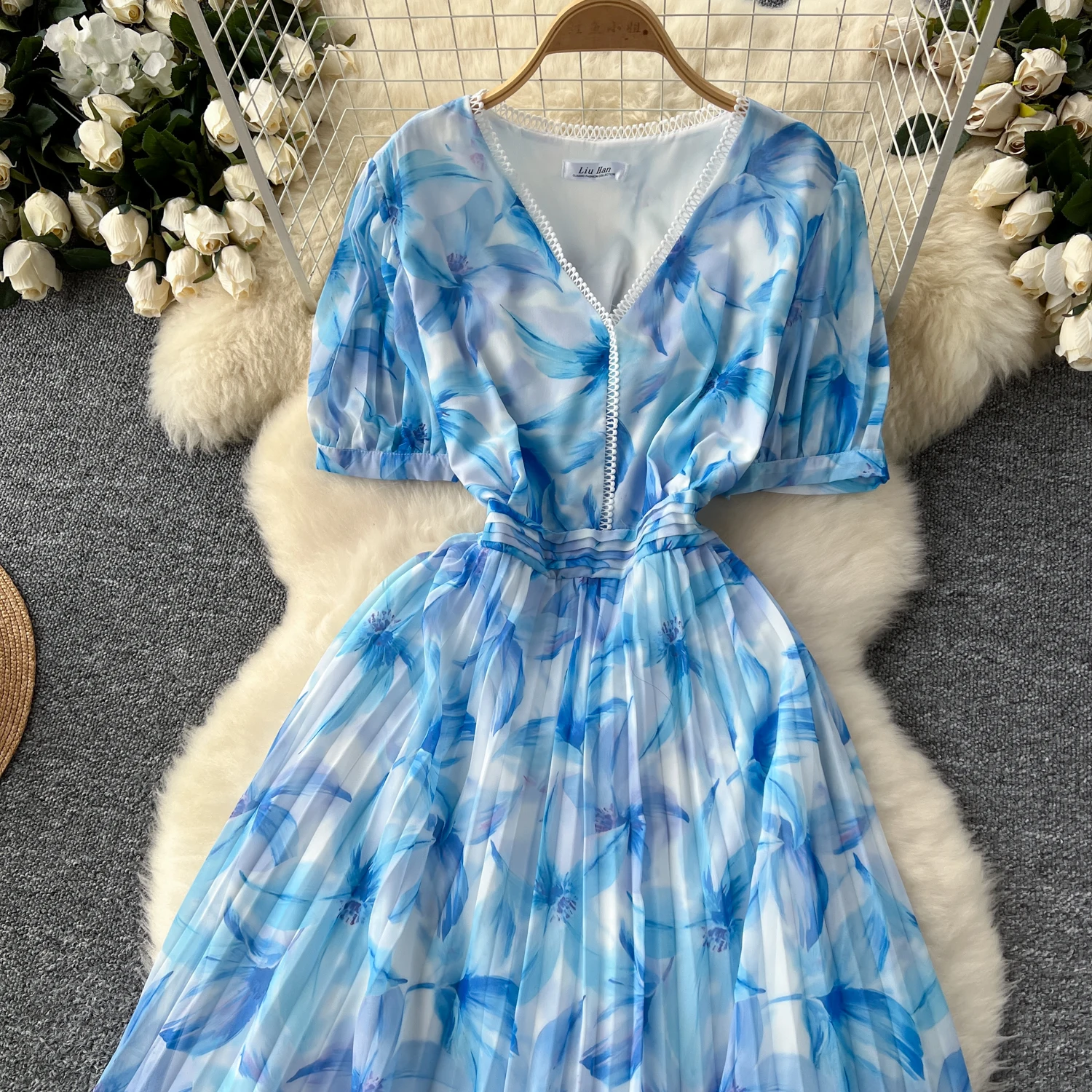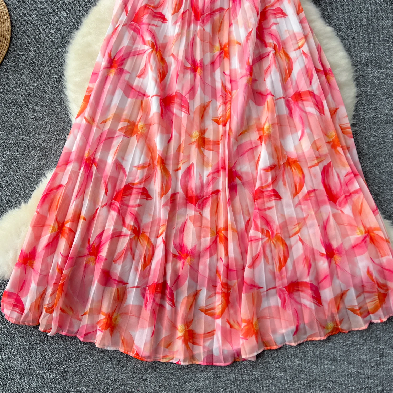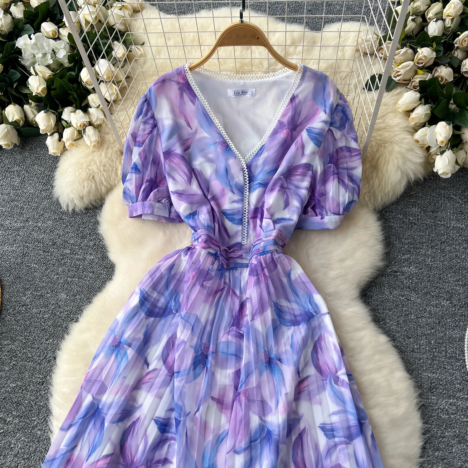 French Retro Romantic Women's Elegant Print V-neck Short Sleeved Pleated Long Dress Summer Vacation Party Evening Dress Bohemian