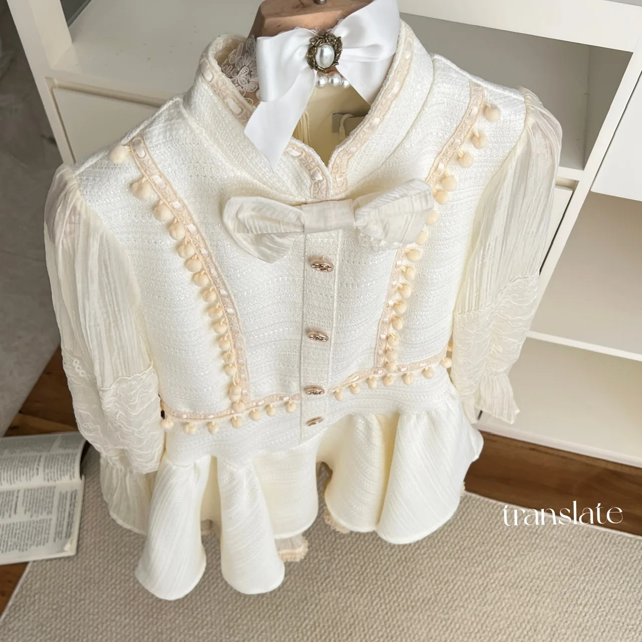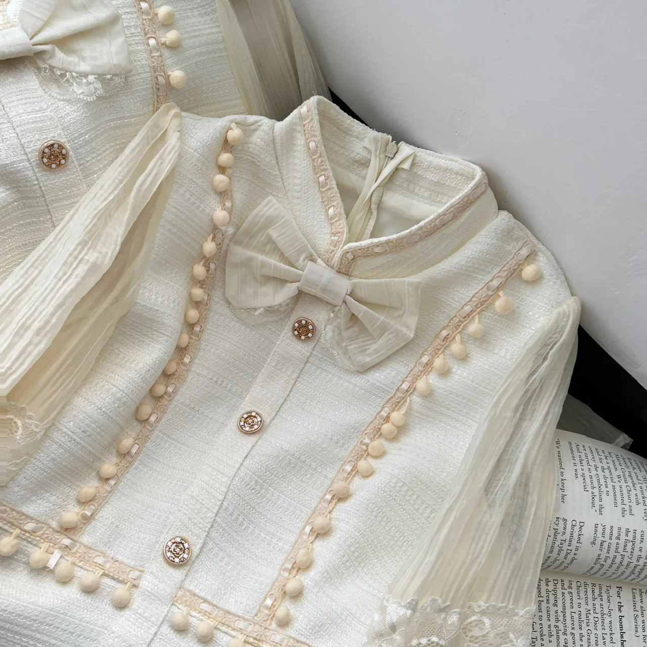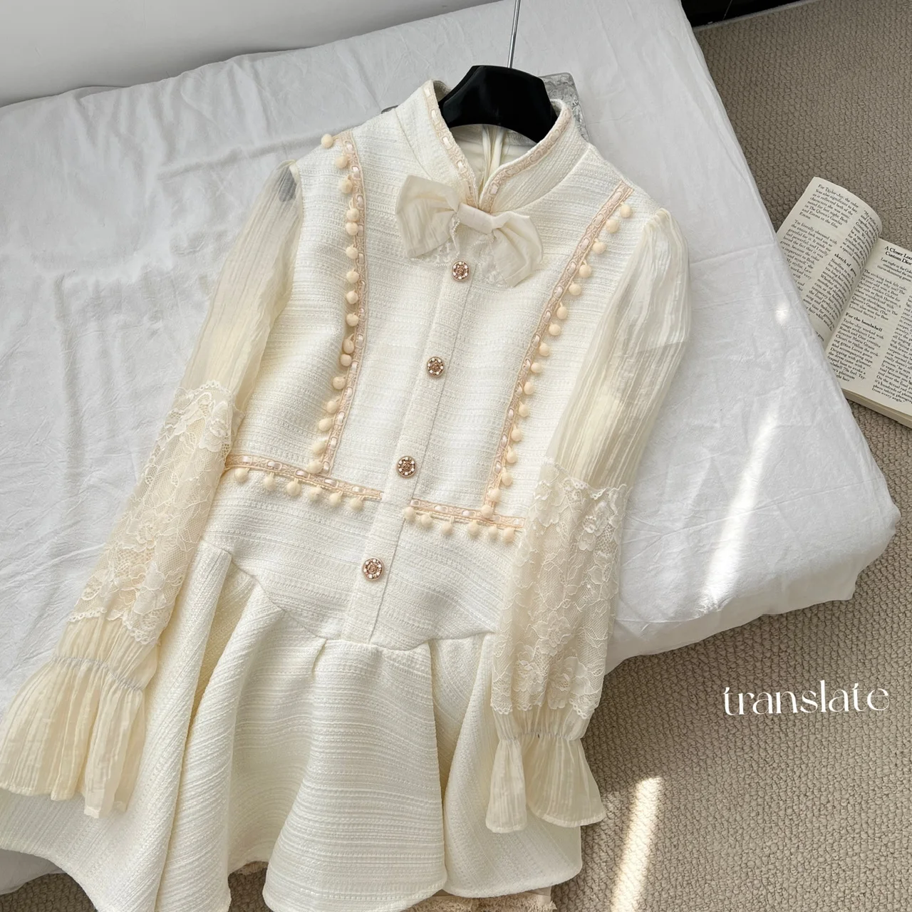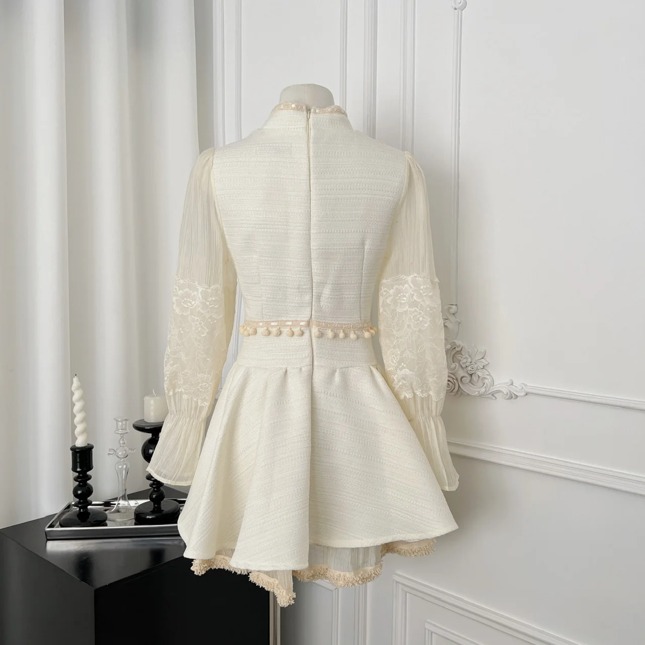 French Retro Women Beige Patchwork Lace Bow Button Slim Mini Dress Autumn Winter Long Sleeved High Waist Pleated Short Dress New