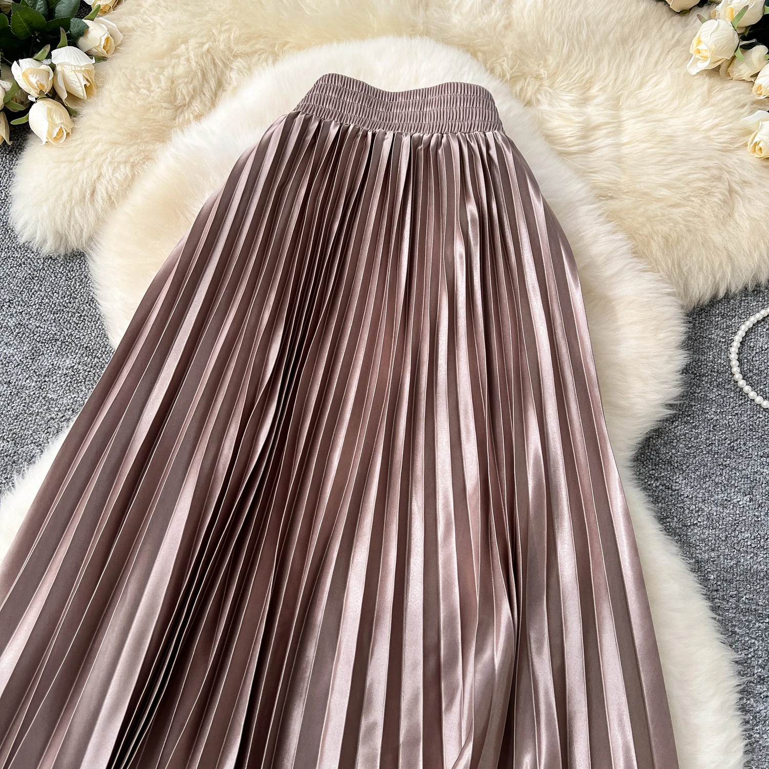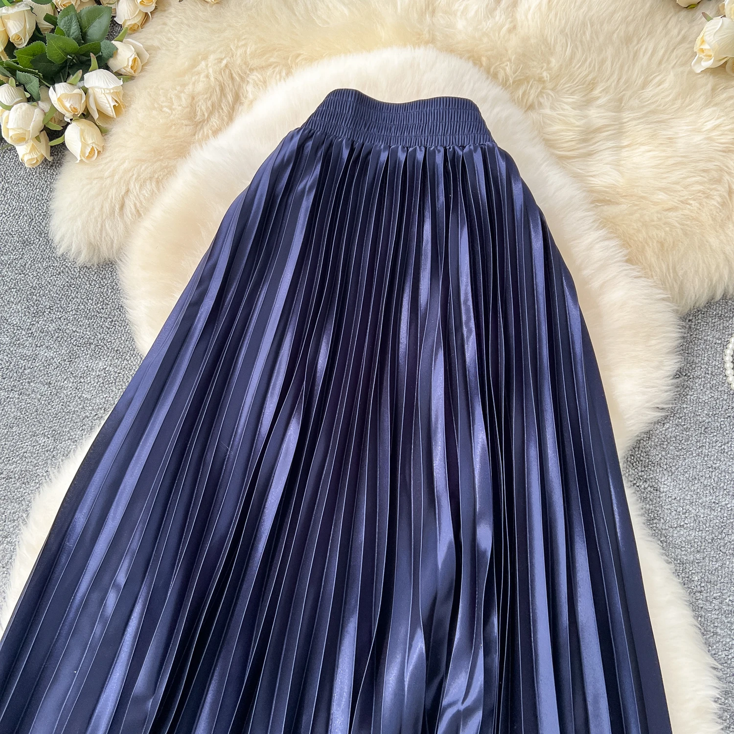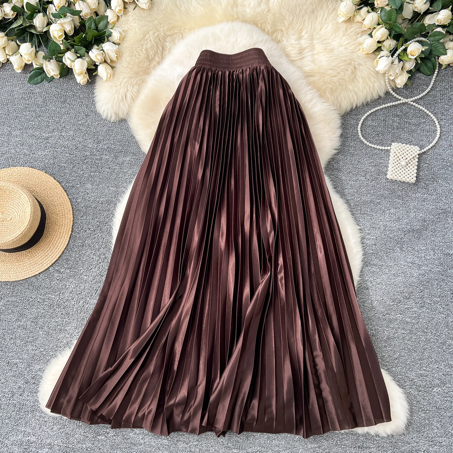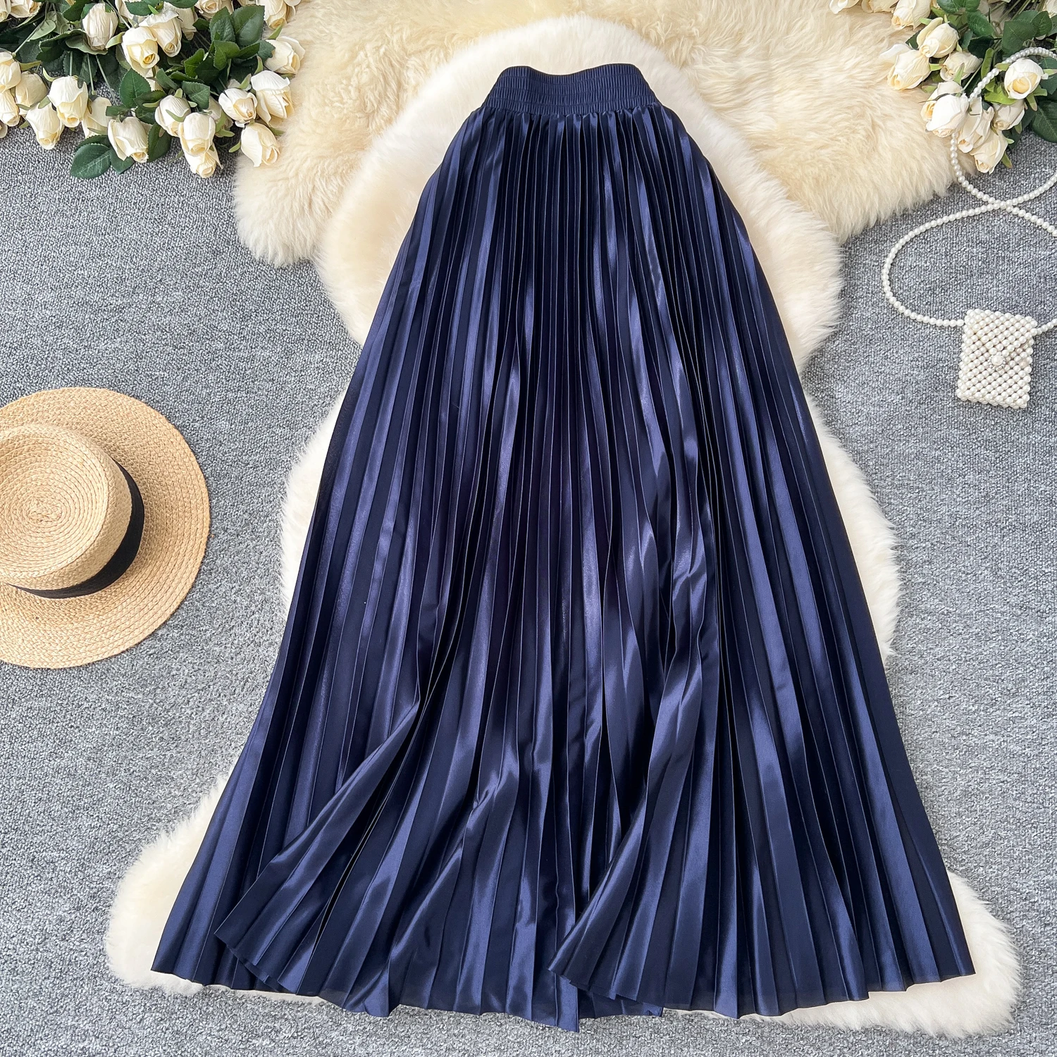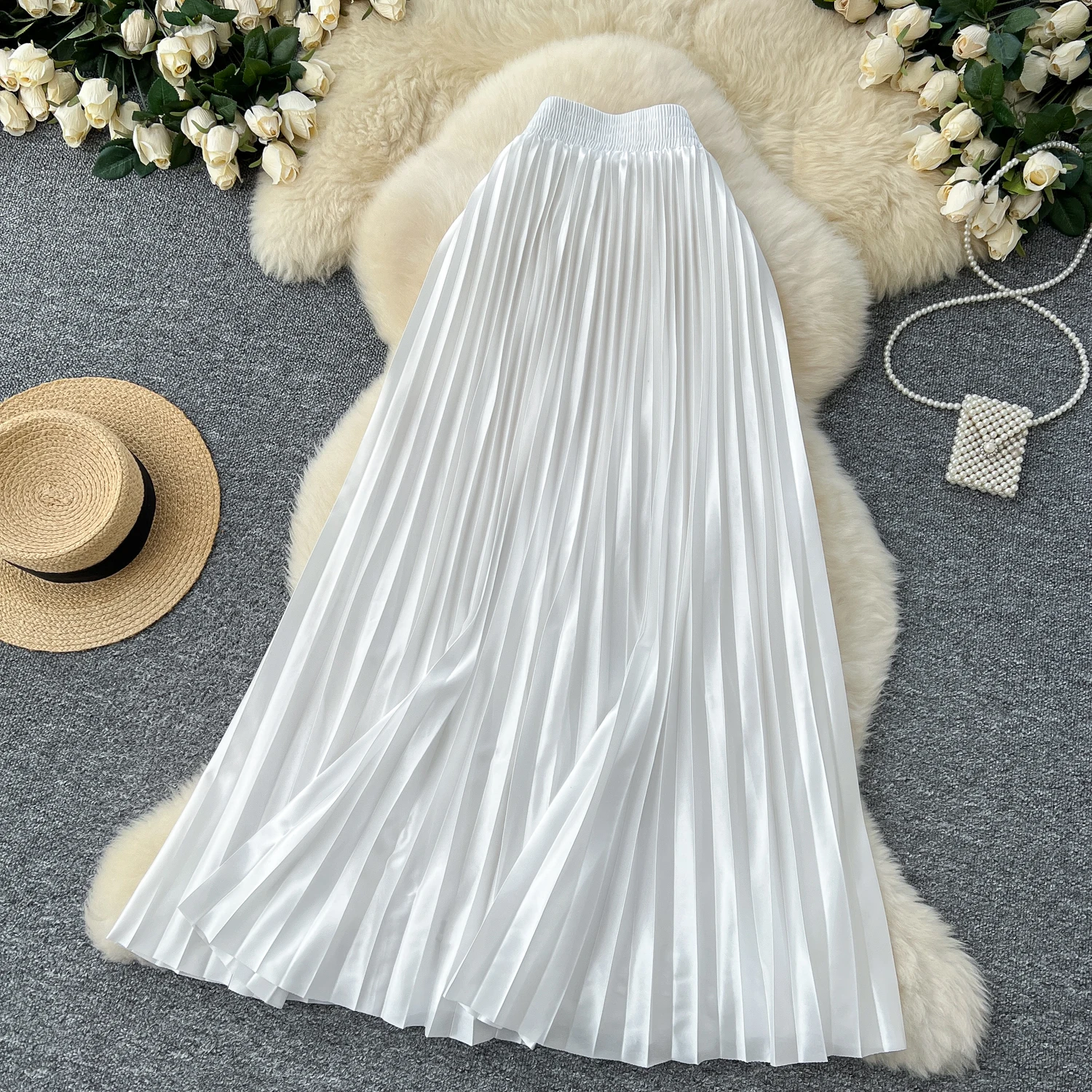 French Retro Women Fashion Solid Elegant Long Skirt Autumn Winter Elastic High Waist Popular Pleated Skirt Simplicity Streetwear