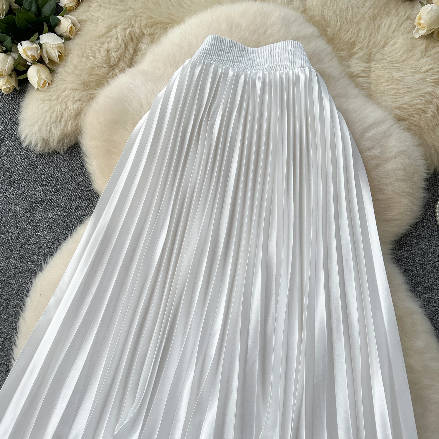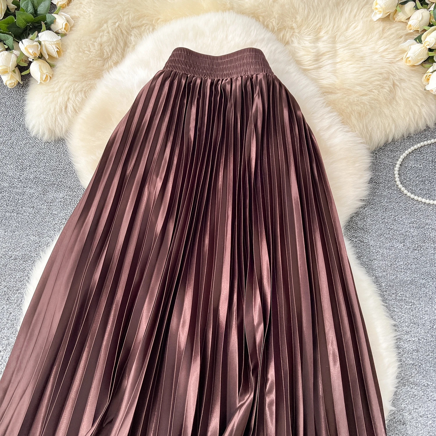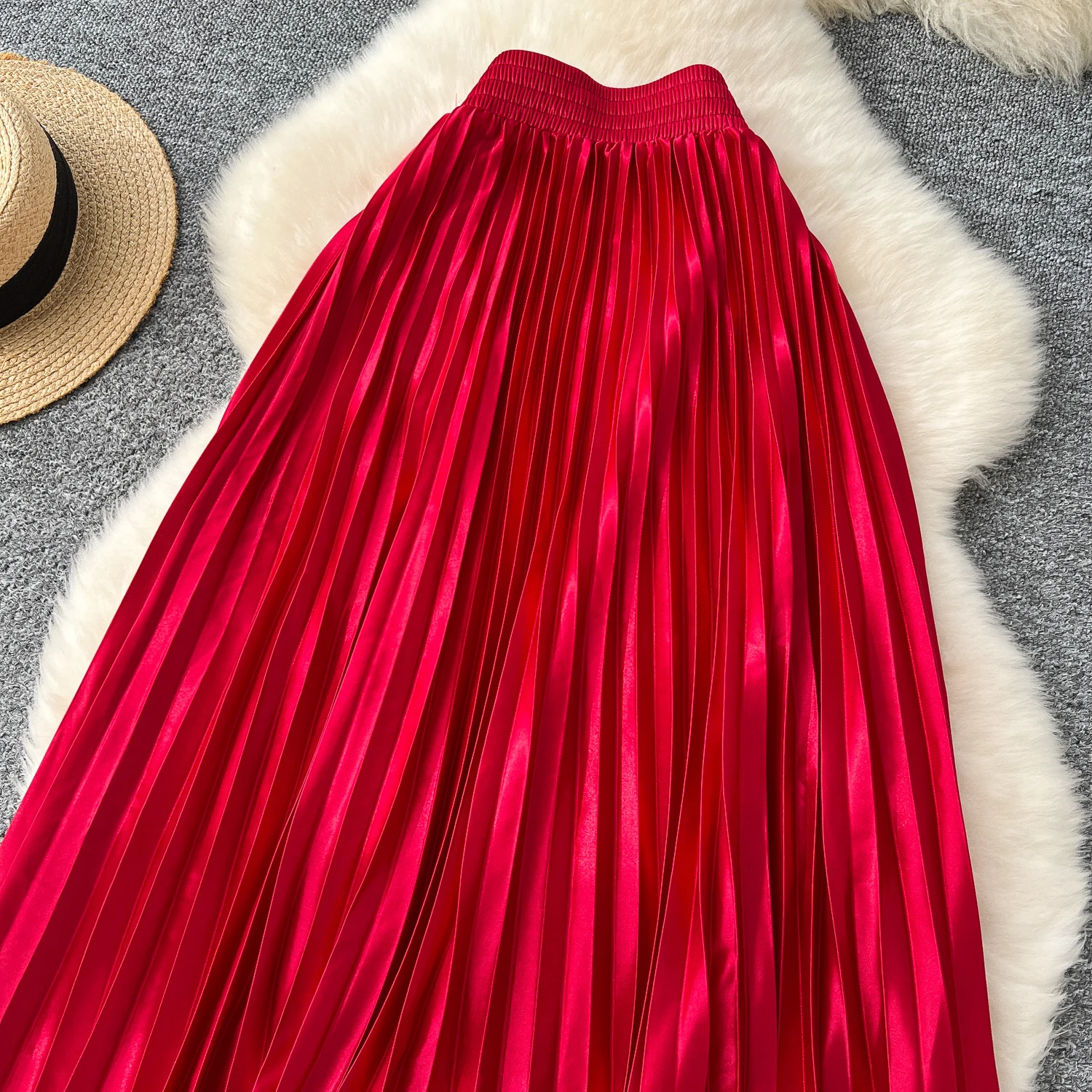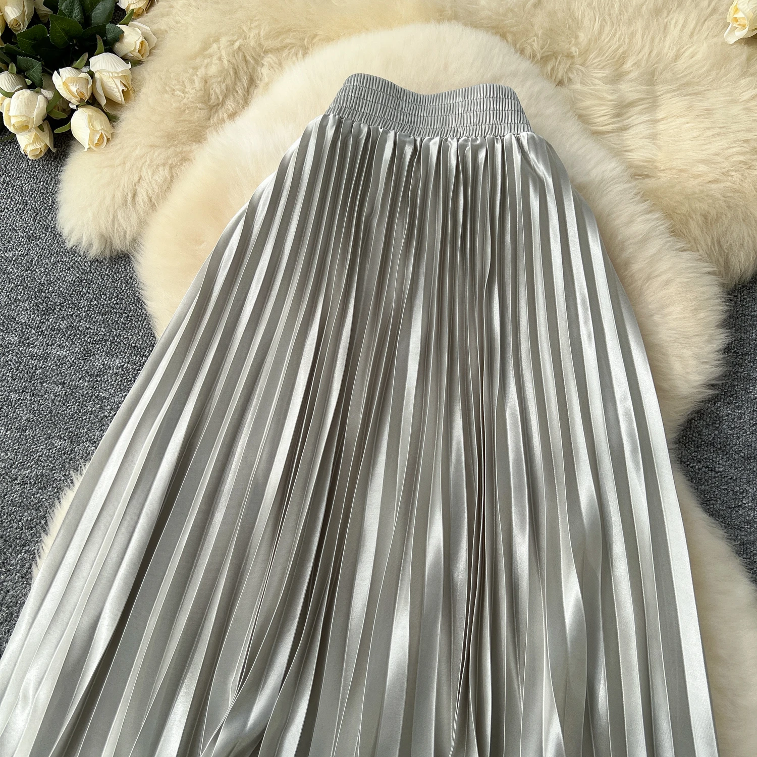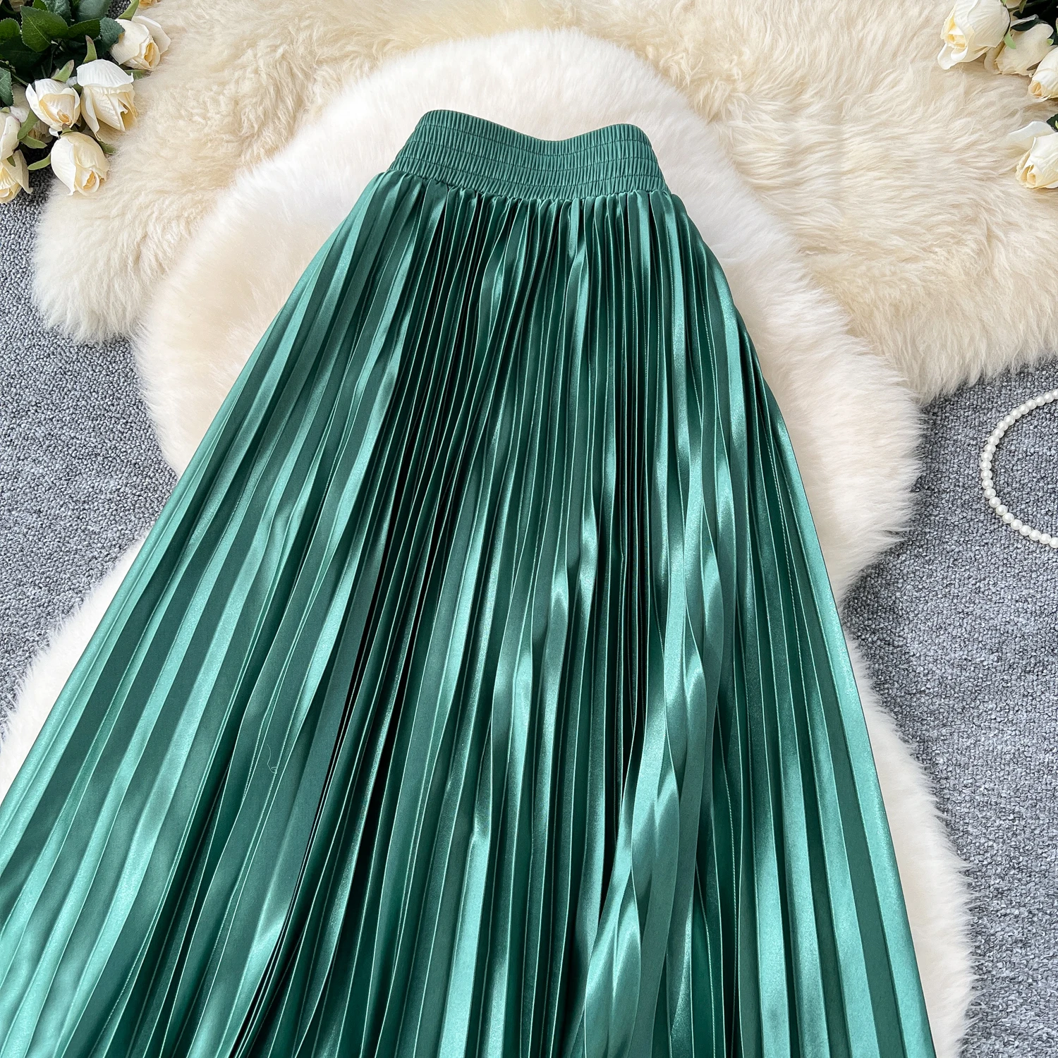 French Retro Women Fashion Solid Elegant Long Skirt Autumn Winter Elastic High Waist Popular Pleated Skirt Simplicity Streetwear
