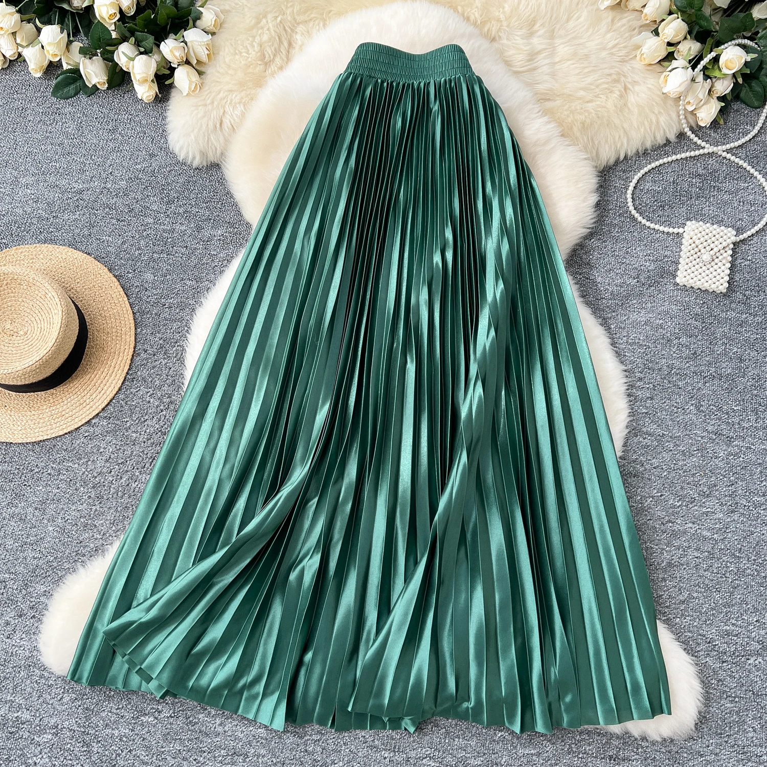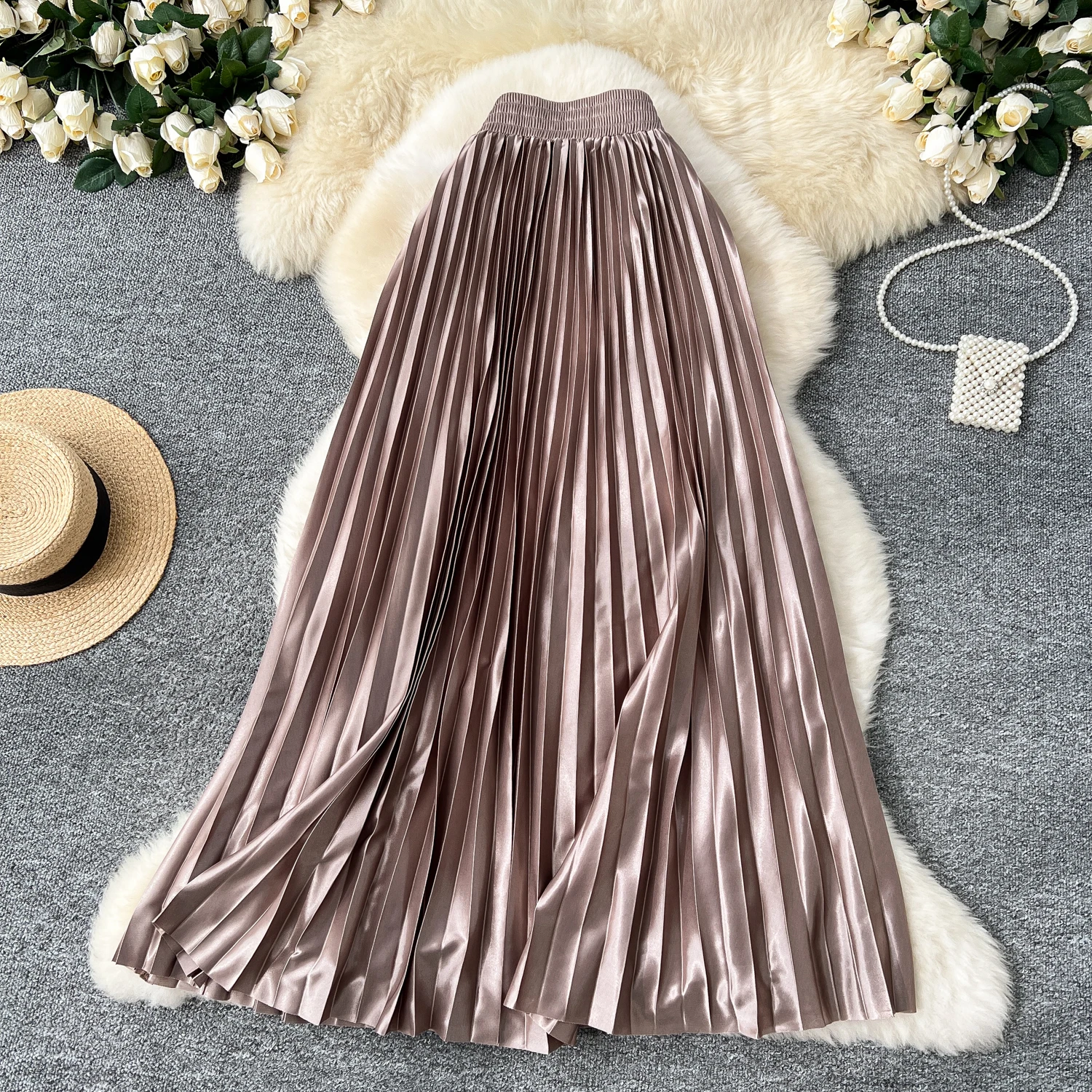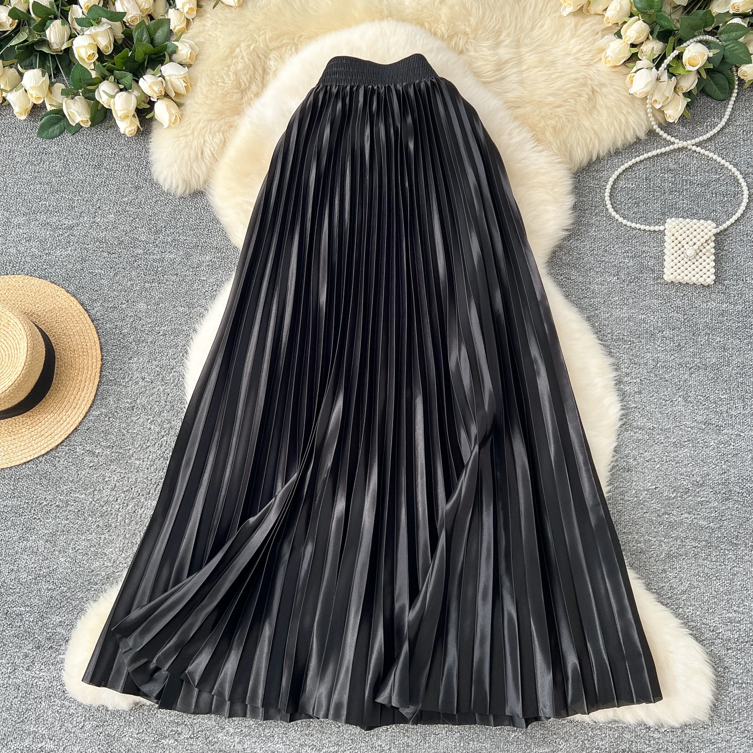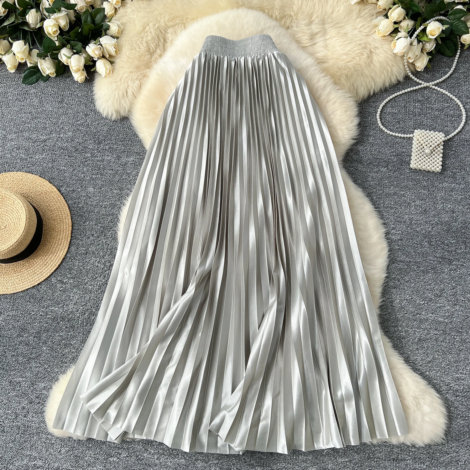 French Retro Women Fashion Solid Elegant Long Skirt Autumn Winter Elastic High Waist Popular Pleated Skirt Simplicity Streetwear