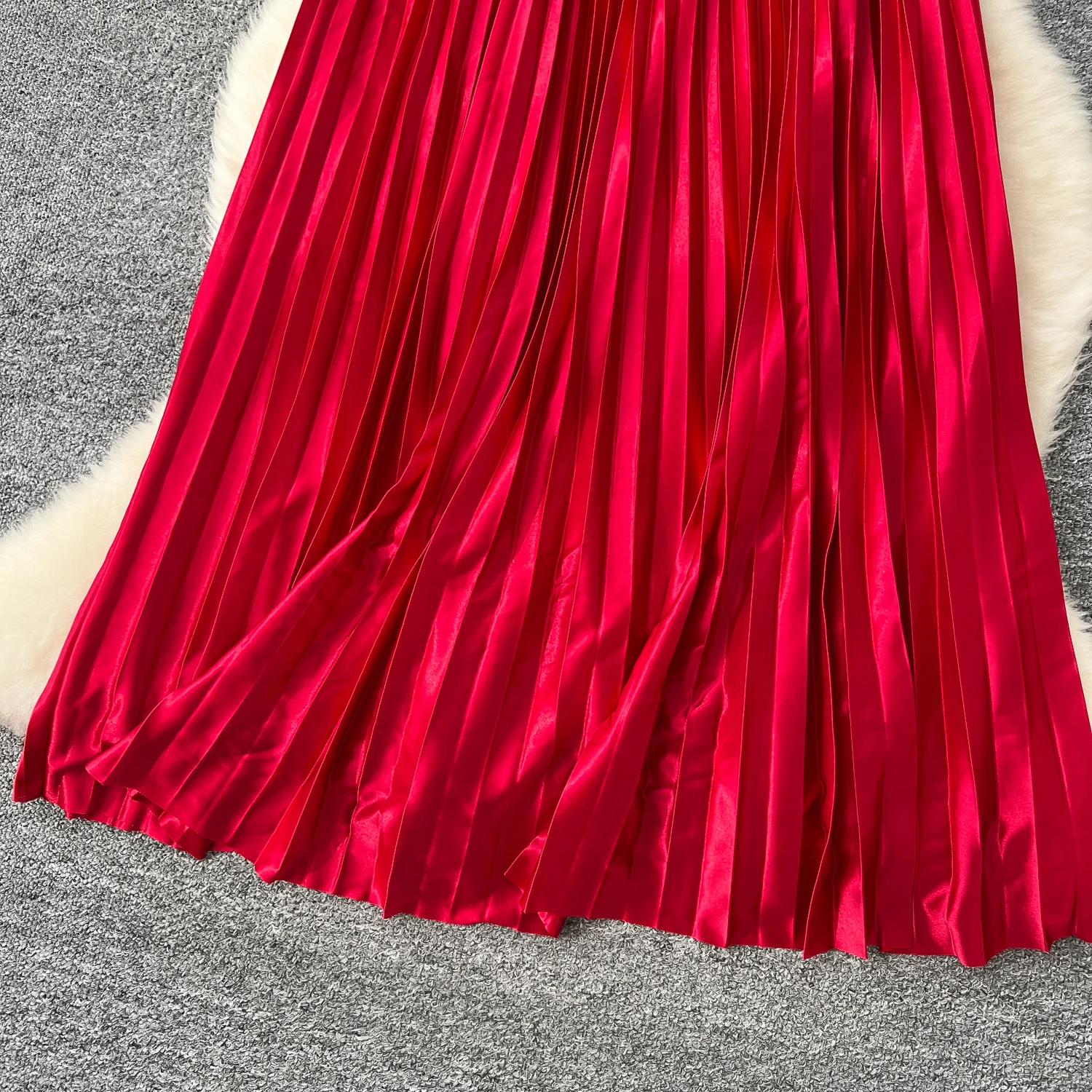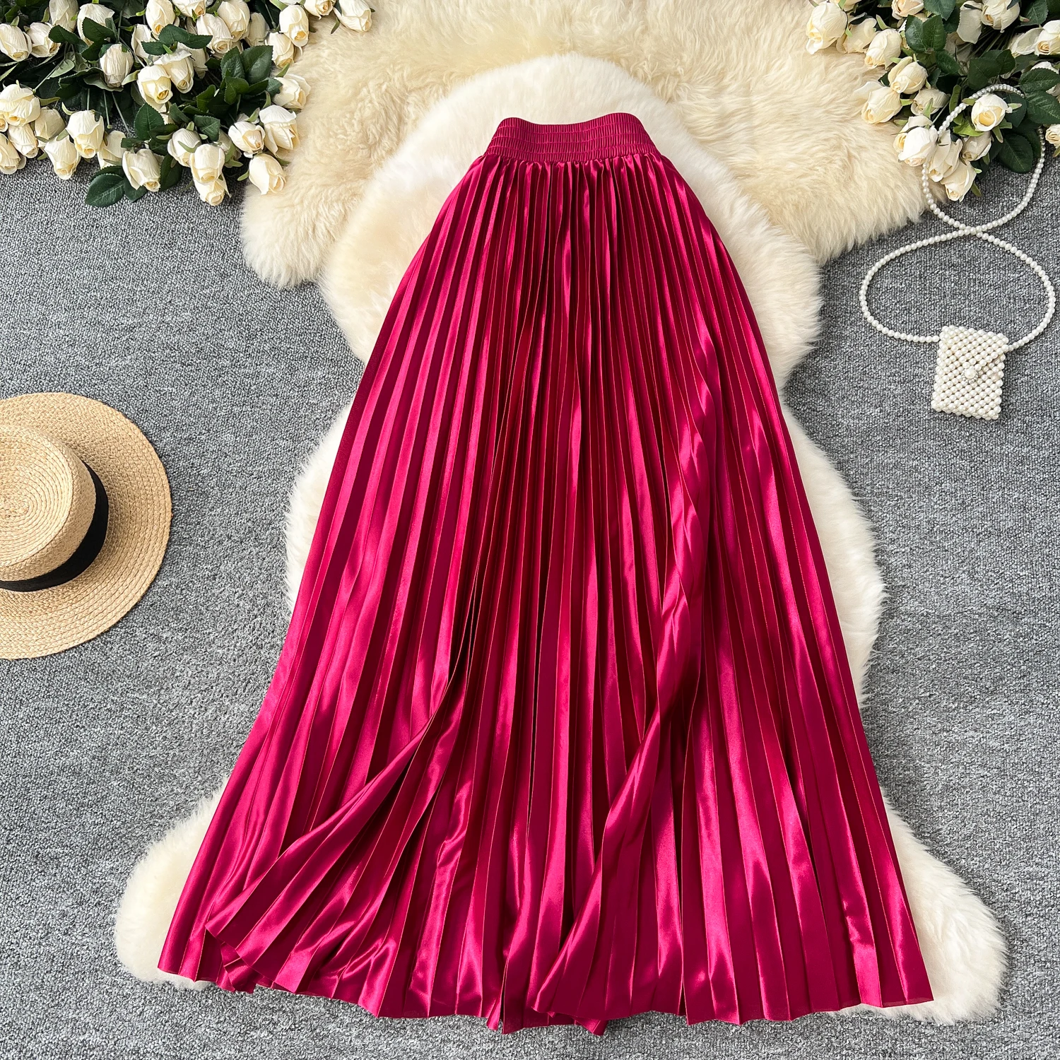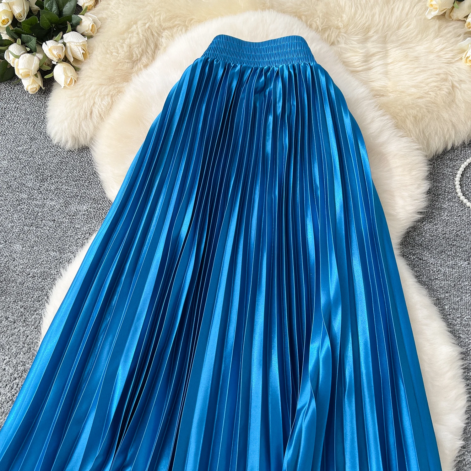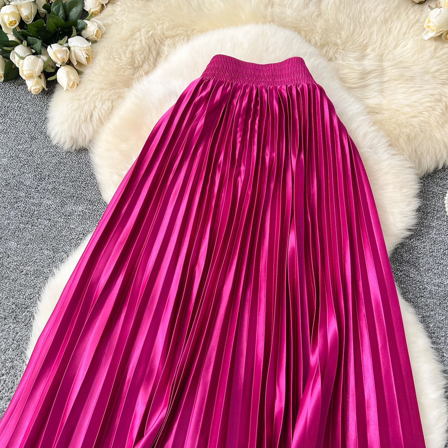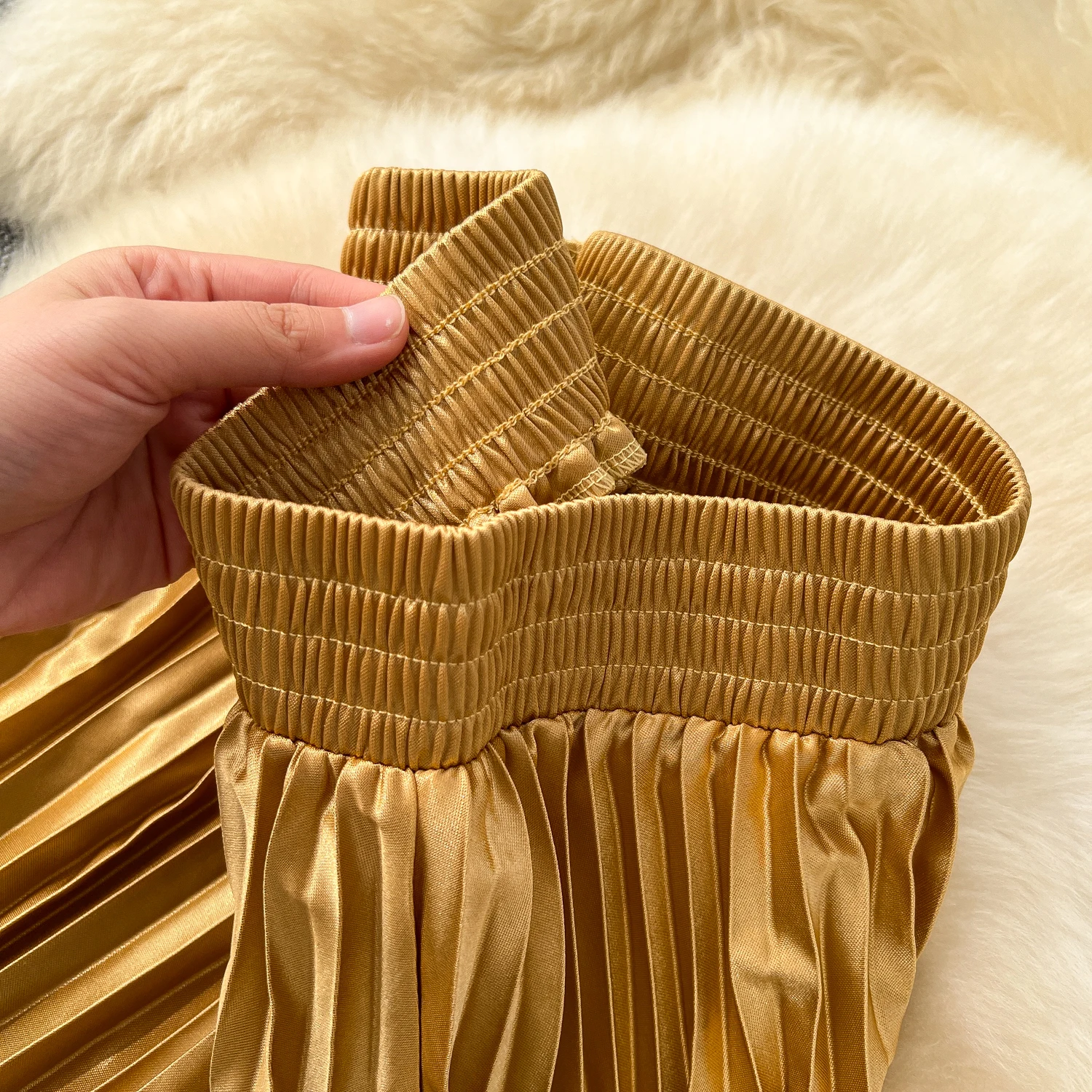 French Retro Women Fashion Solid Elegant Long Skirt Autumn Winter Elastic High Waist Popular Pleated Skirt Simplicity Streetwear