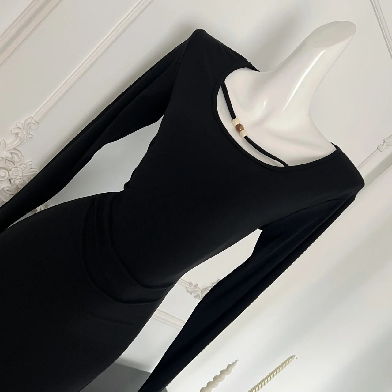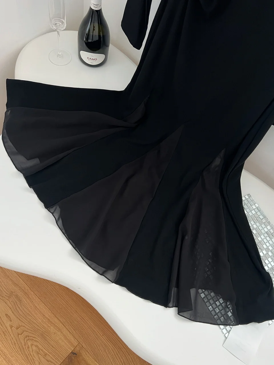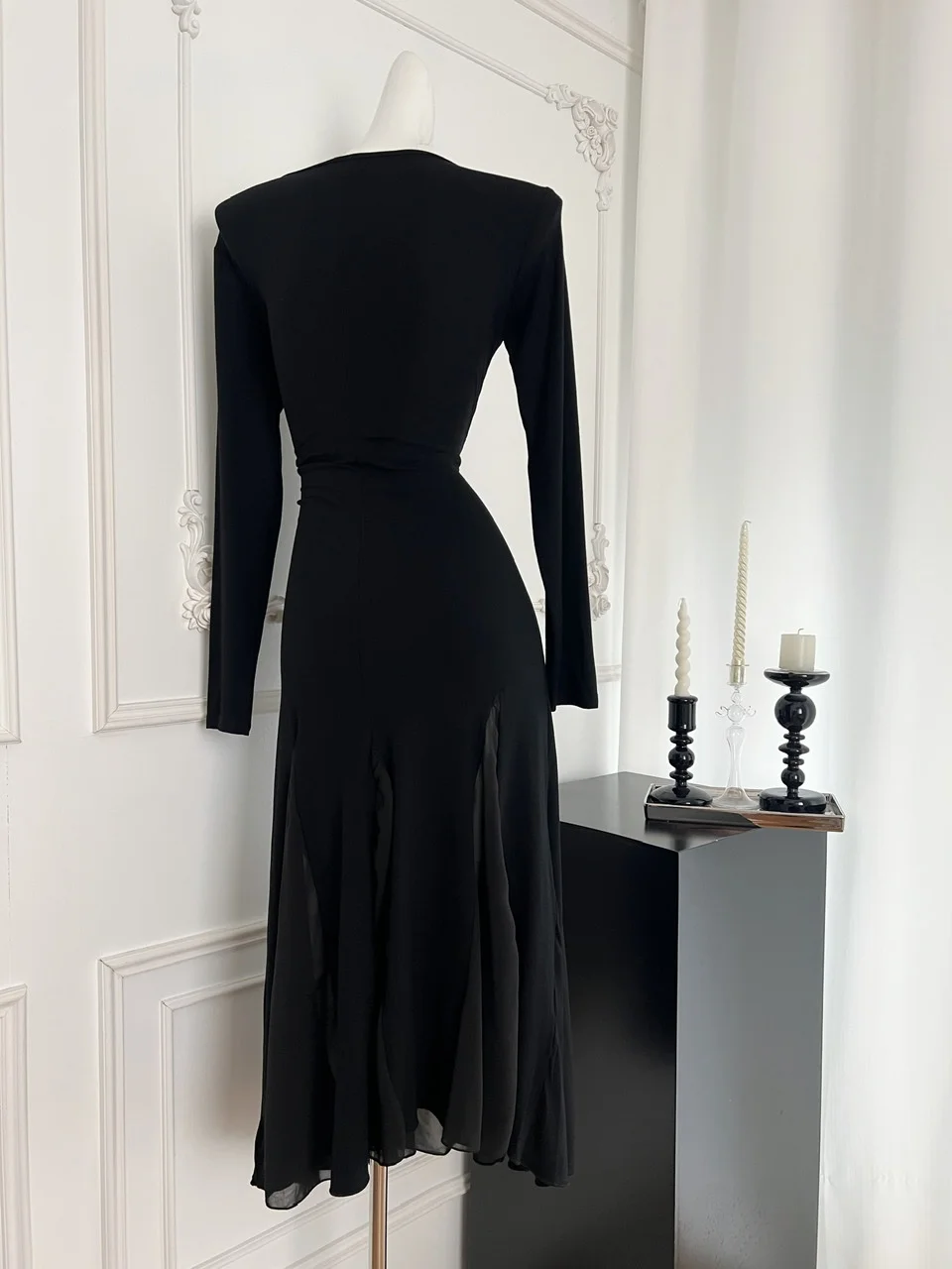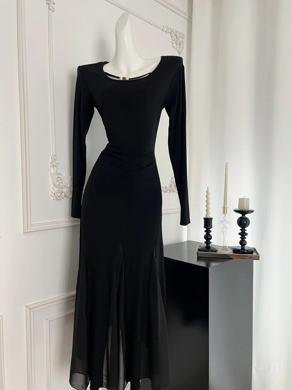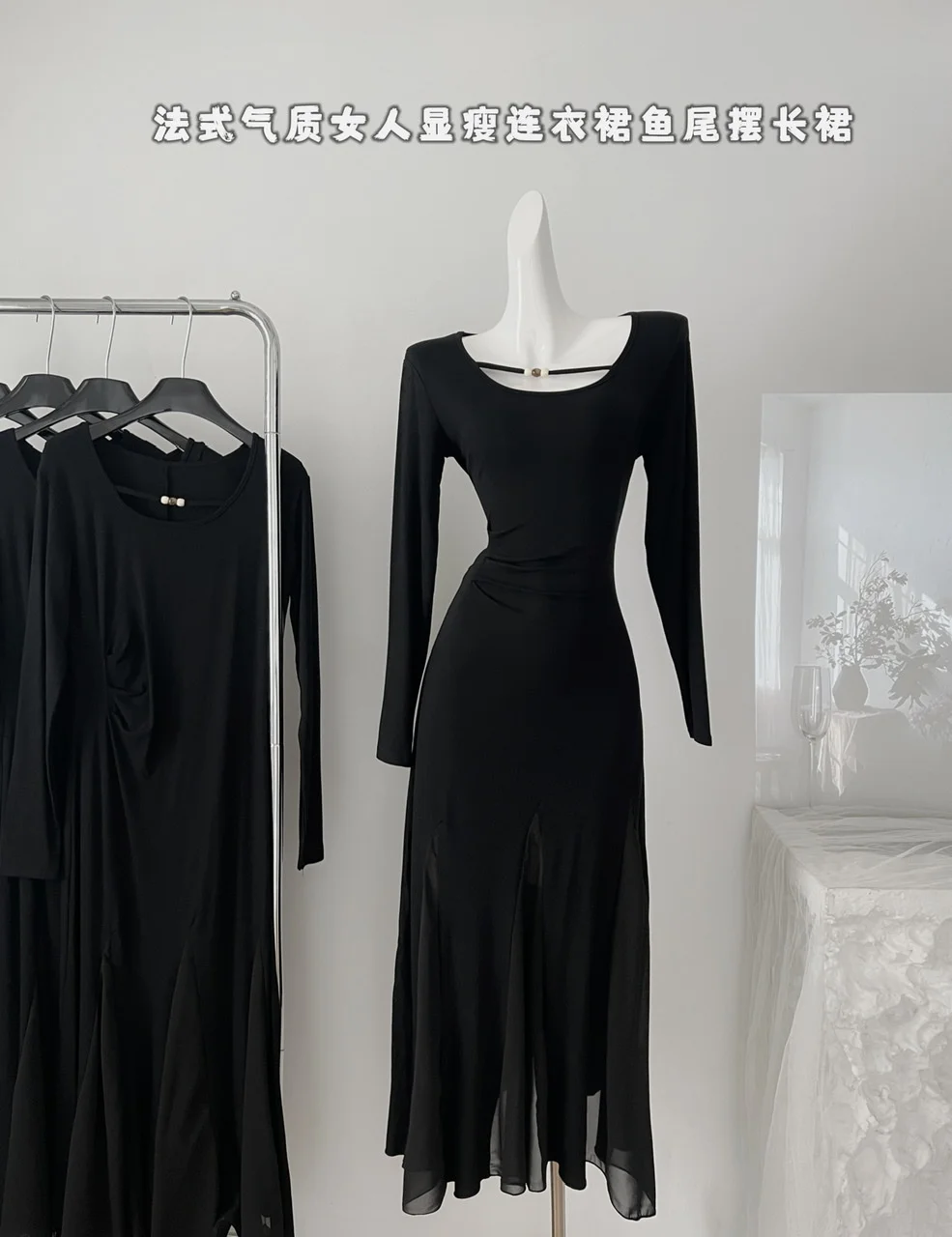 French Vintage Women's Black Mesh Elegant Long Sleeve Pleated Fishtail Dress Autumn Round Neck Temperament Party Evening Dresses
