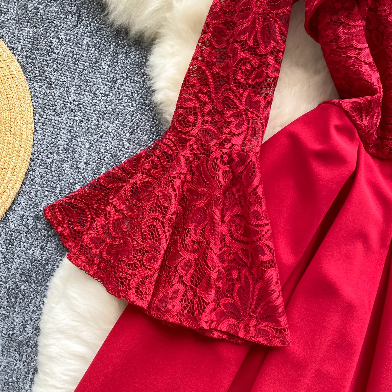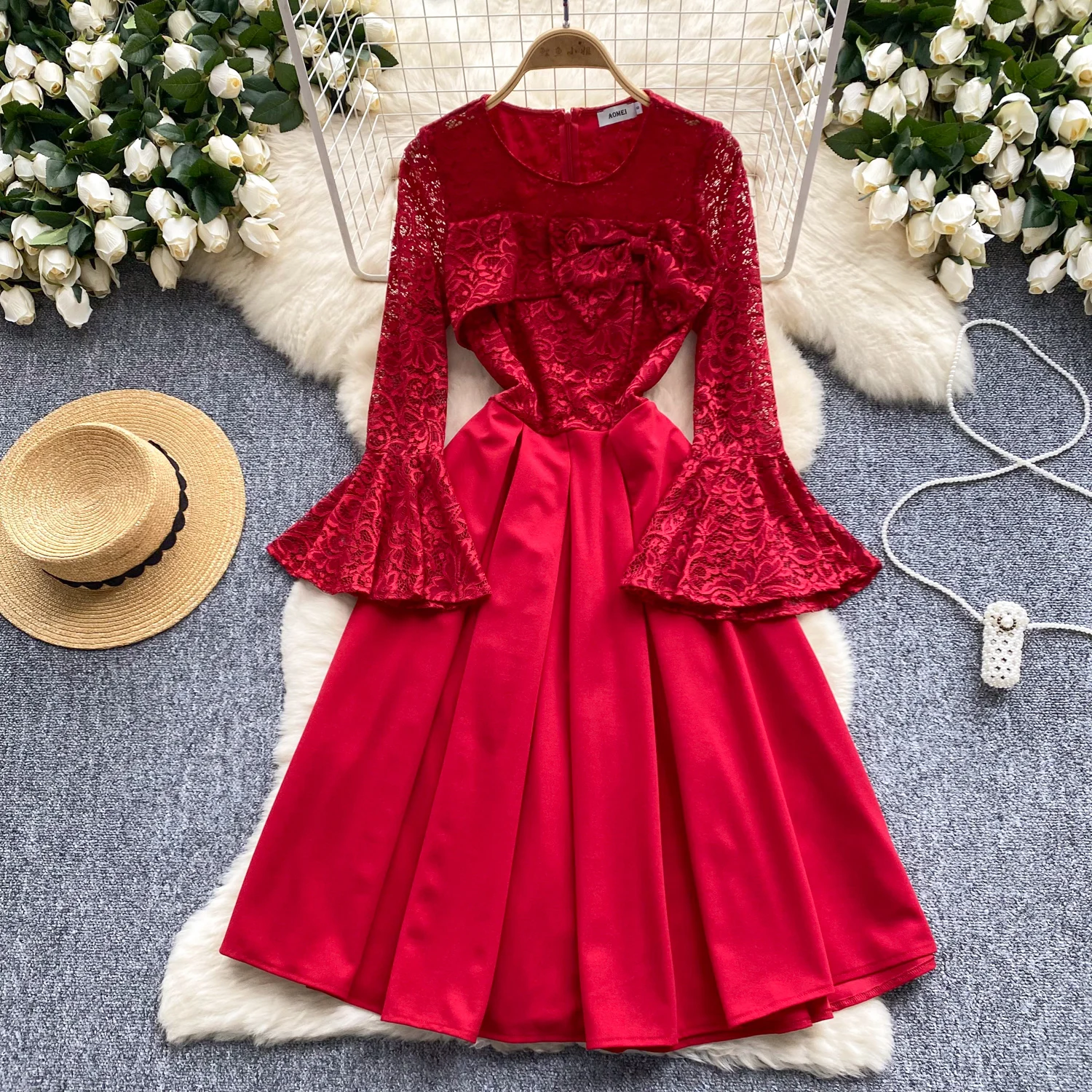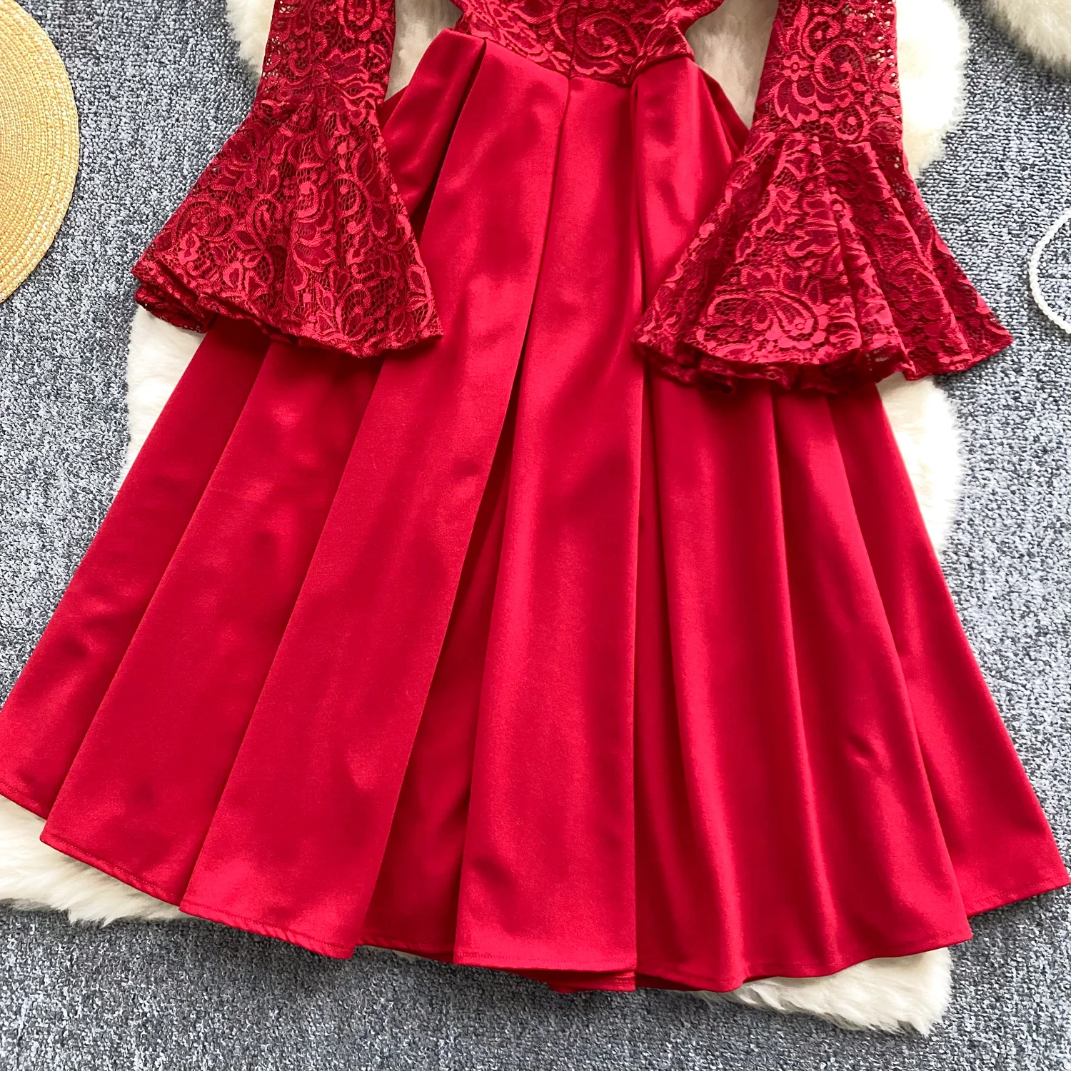 French Women Red Patchwork Lace Birthday Evening Party Dresses Autumn Round Neck Elegant Festival Long Sleeved Bow Pleated Dress